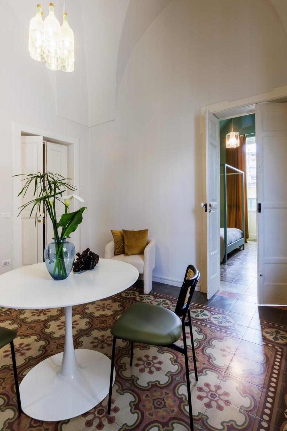 Das Gebäude, das das Bed & Breakfast beherbergt, ist ein charmantes Palais aus dem späten 19. Jahrhundert, das von einer geschickten Familie von Handwerkern und Steinmetzen erbaut wurde. Seine Fassade zeichnet sich durch die weiße Farbe und den leccesischen Stein aus, ein Material, das aus einem sehr formbaren Tuffgestein extrahiert wird und typisch für die Gegend ist.