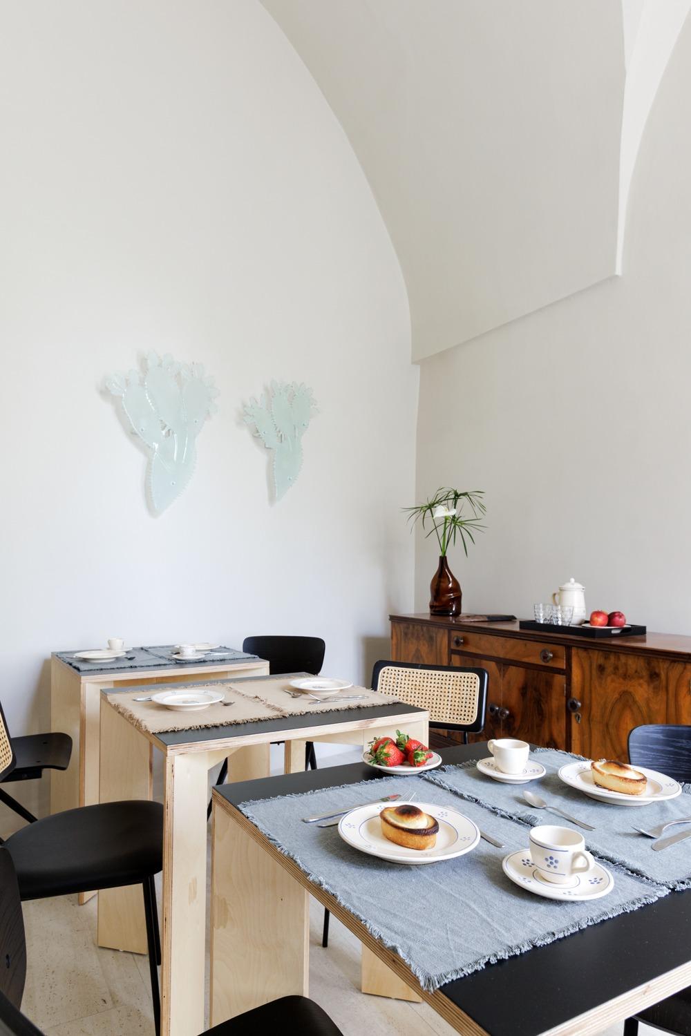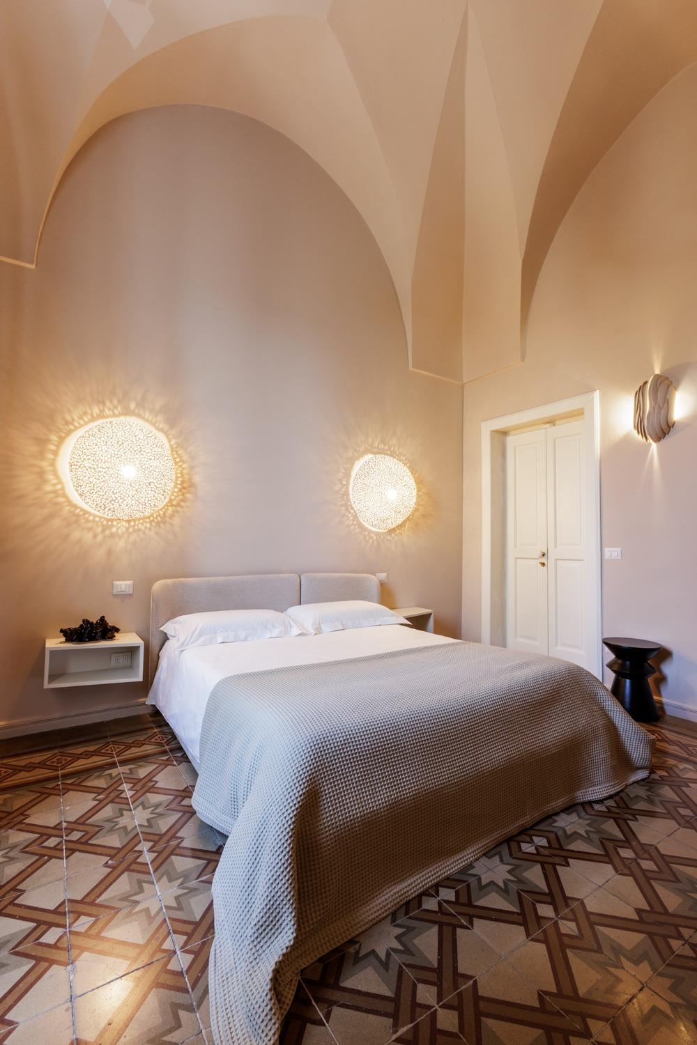 Die Zimmer wurden unter Verwendung der typischen Bauweisen des Salento erbaut, bekannt als "leccesische Gewölbe". Die beiden gängigsten Arten von Gewölben sind das "spitzbogige Gewölbe", das dem berühmten "Kreuzgewölbe" sehr ähnlich ist, und das "quadratische Gewölbe", besser bekannt als "Sternengewölbe". Beide werden an der Spitze von einem Schlussstein geschlossen, der der Struktur insgesamt Stabilität und Gleichgewicht verleiht.