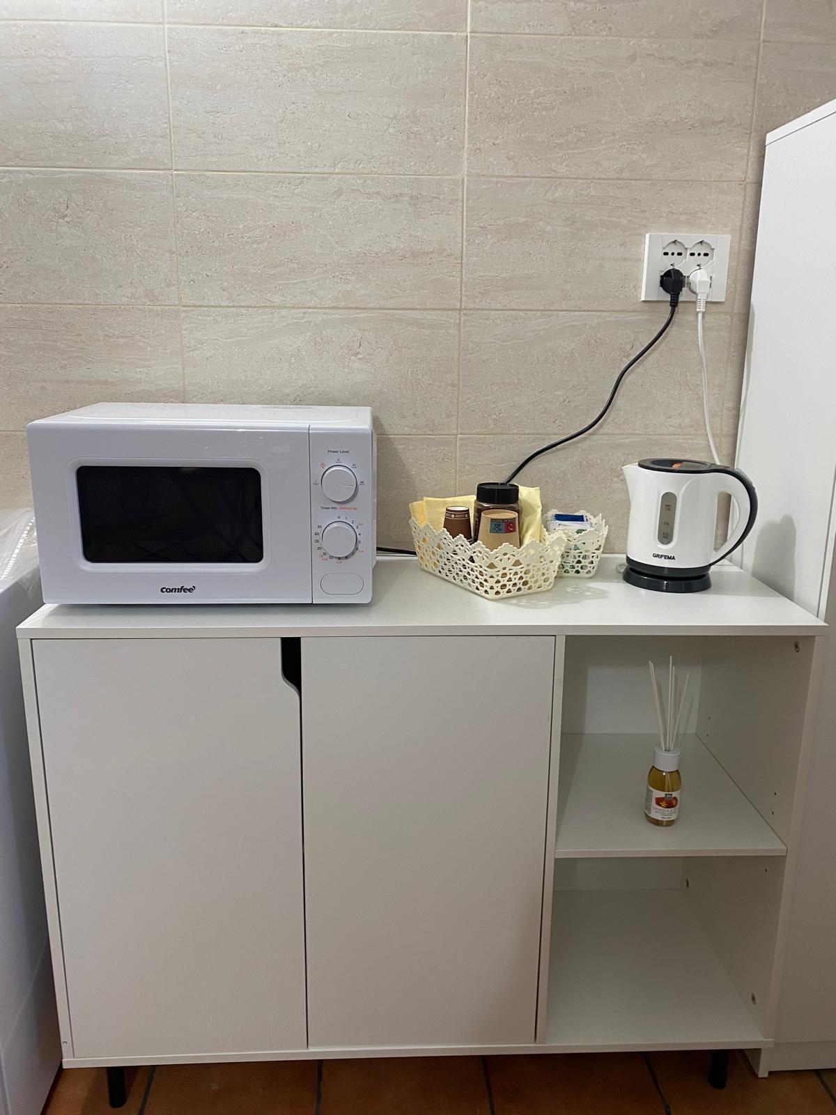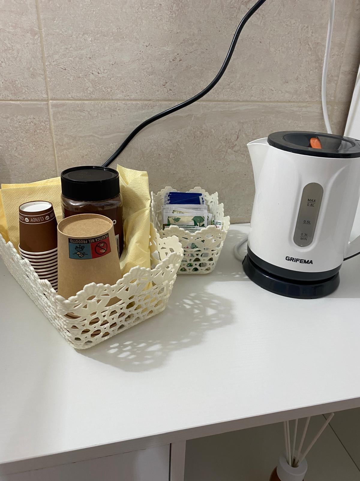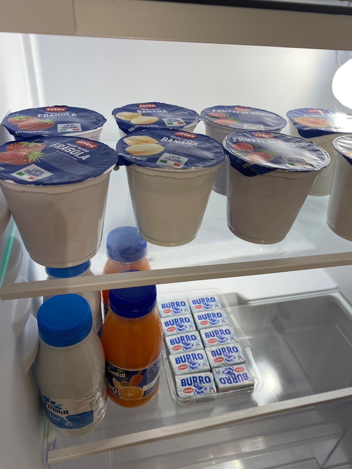 Nel frigorifero gli ospiti possono trovare acqua naturale e frizzante, yogurt e altri piccoli alimenti utili per completare la colazione in modo semplice ma gradevole. Il tutto è pensato per garantire autonomia e flessibilità, in un ambiente ordinato e familiare, dove iniziare la giornata con tranquillità è parte dell’esperienza di soggiorno.