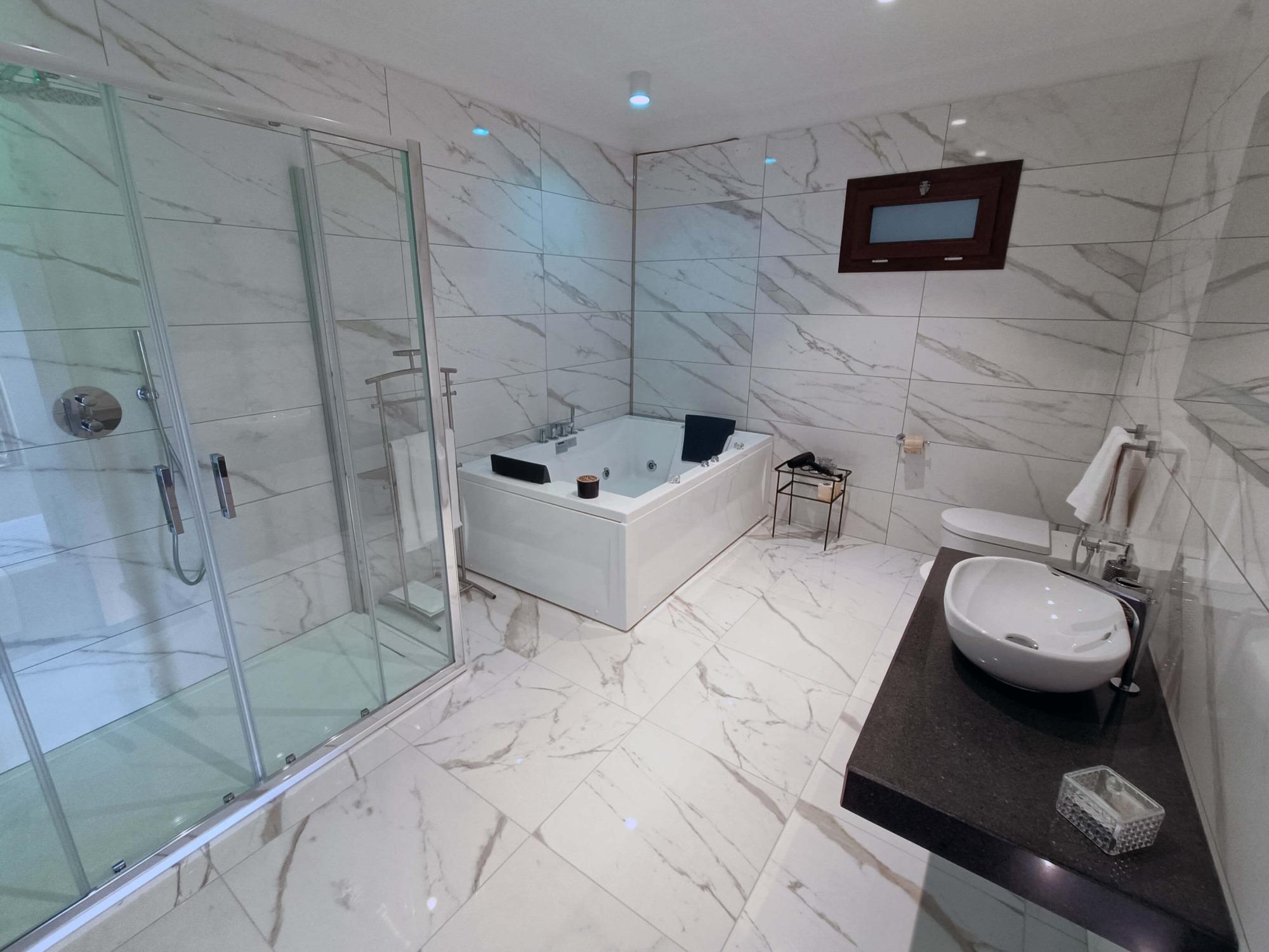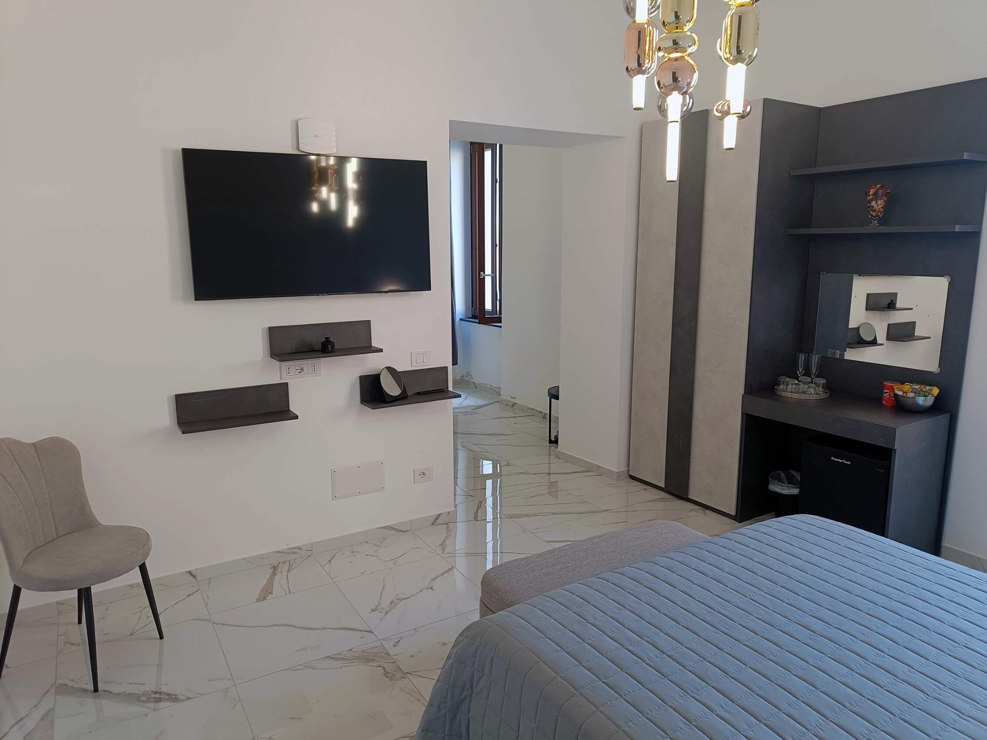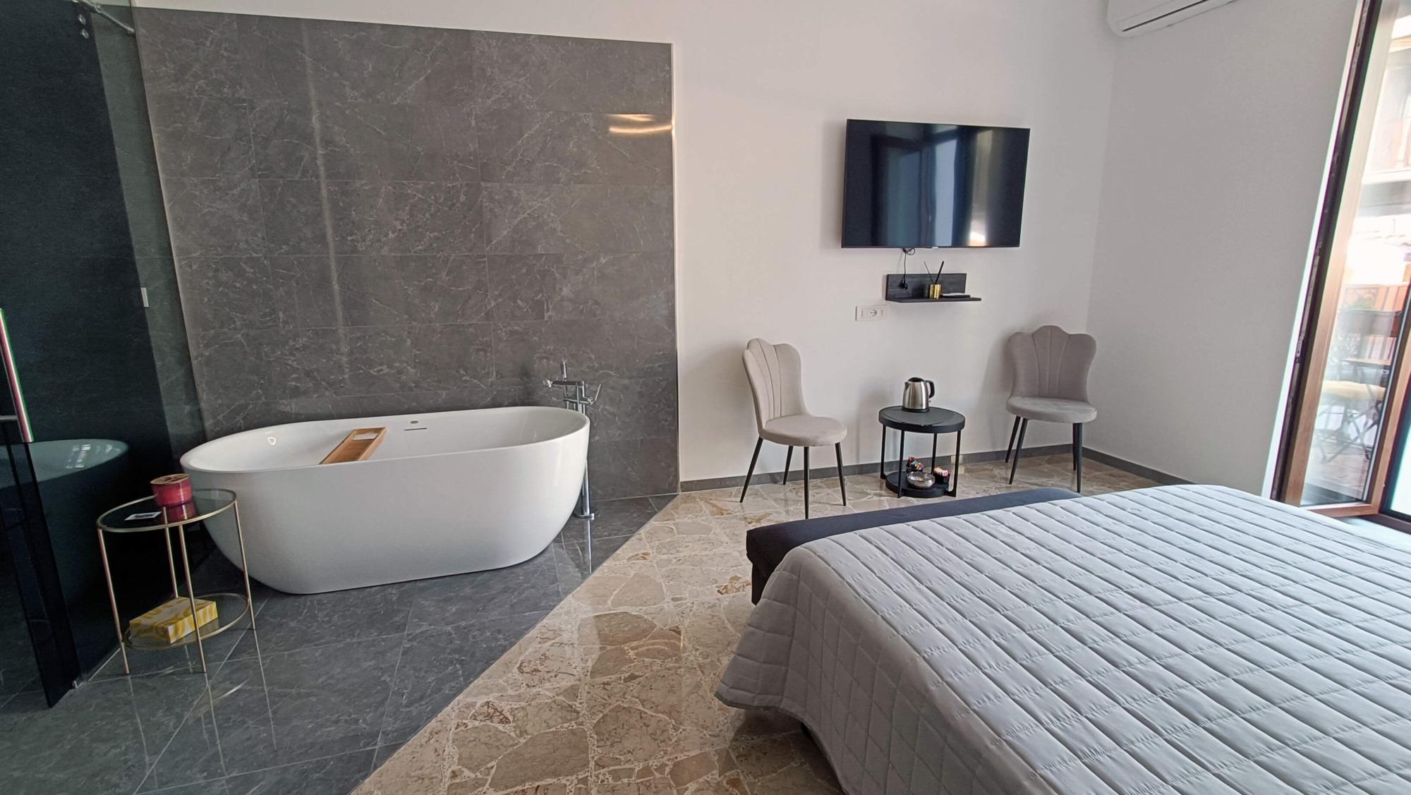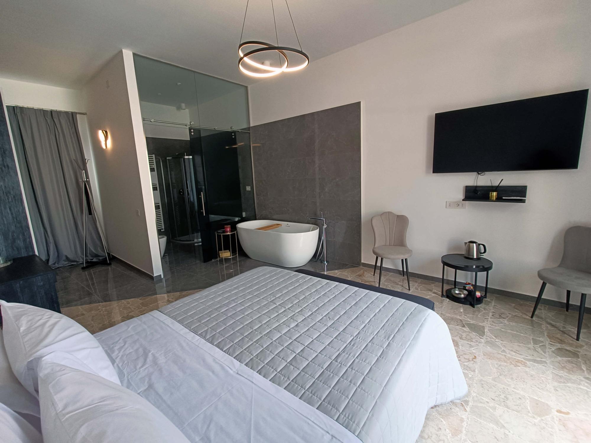 Spacious and refined, the Deluxe Room of our B&B in Camerota is designed to offer maximum comfort. Divided into two distinct areas, it ensures both privacy and relaxation: the lounge area, featuring a comfortable sofa and a well-stocked bar corner, is perfect for enjoying a drink in peace, while the sleeping area boasts an elegant double bed, enhanced by modern furnishings and sophisticated details that create a cozy and relaxing ambiance. The bathroom is a true wellness space, equipped with a chromotherapy shower and a hydromassage bathtub, perfect for an indulgent moment of pure relaxation. To make your stay even more comfortable, we provide parking passes for Marina di Camerota, ideal for reaching Lentiscelle Beach or exploring the town center and seafront. Additionally, we offer complimentary private transfers to and from train stations (upon request) and free public shuttle subscriptions, allowing guests to easily navigate the entire municipality of Camerota.