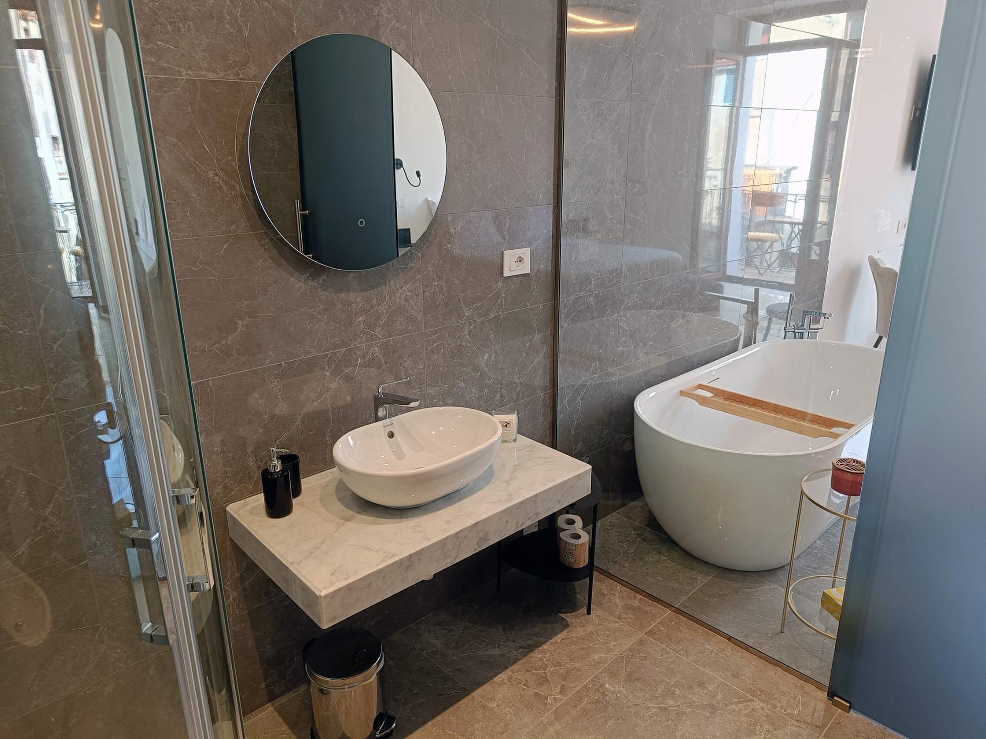 Unique in its kind, the Superior Room of our B&B in Camerota is set atop an ancient arch that holds centuries of history, offering a charming and romantic atmosphere. The spacious and bright interior blends modern furnishings with historical details, creating a perfect balance between past and present. The double bed is strategically positioned to highlight the extraordinary architecture of the room, while its most exclusive feature is the freestanding bathtub, ideal for moments of pure relaxation and well-being. The bathroom, equipped with a chromotherapy shower, ensures a truly rejuvenating experience. To make your stay even more comfortable, we provide parking passes for Marina di Camerota, perfect for reaching Lentiscelle Beach or strolling along the harbor and historic center. Additionally, we offer complimentary private transfers to and from train stations (upon request) and free public shuttle subscriptions, allowing guests to explore the entire municipality of Camerota with ease.