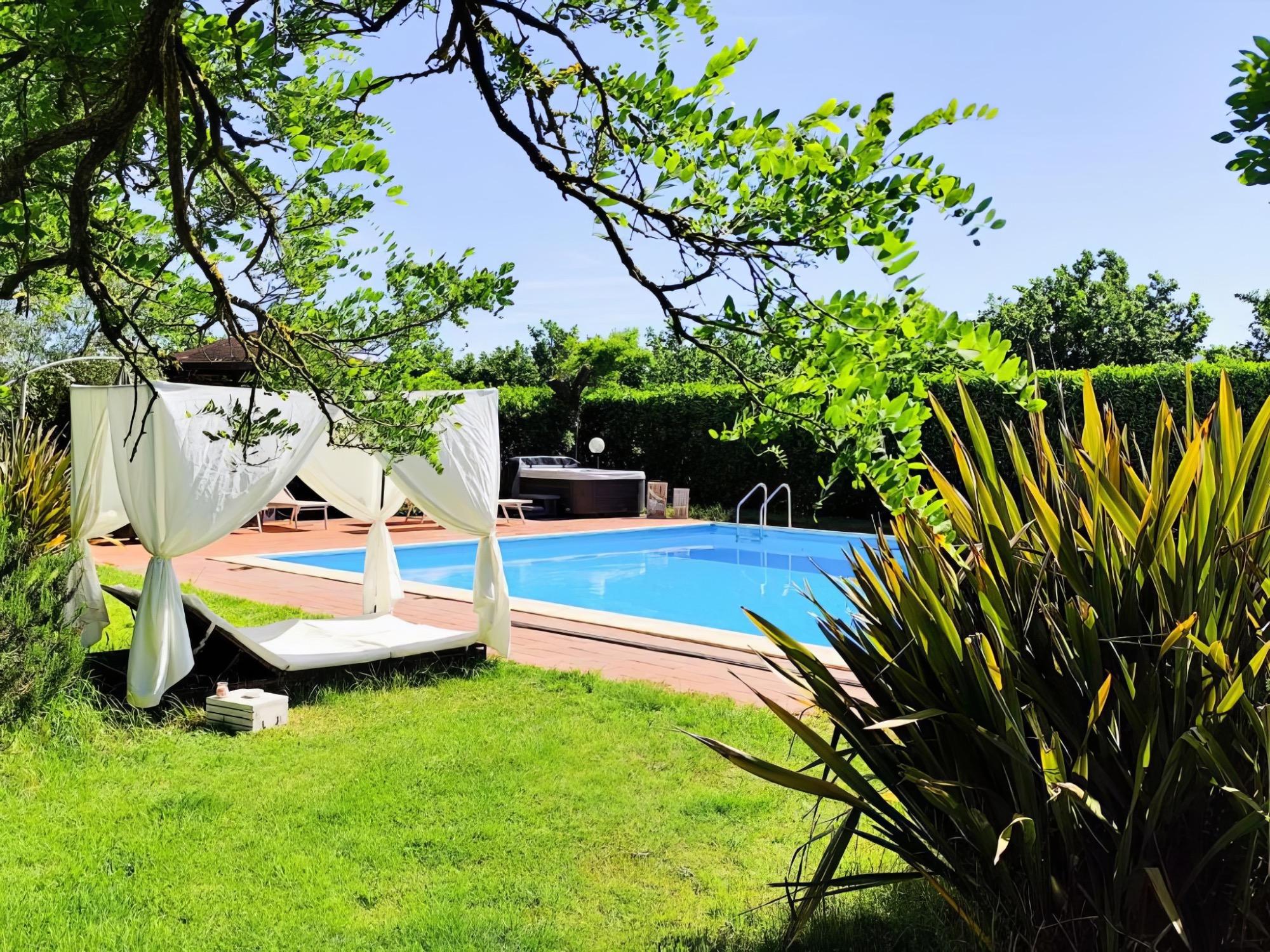 Surrounded by the tranquility of the countryside at the foot of Mount Cimino, this villa welcomes its guests in a relaxing setting, blending nature and culture. The stay is enhanced by moments of pure wellness with the pool and the new hot tub, perfect for rejuvenation while being caressed by the breeze of Tuscia, perhaps with a glass in hand by the poolside.