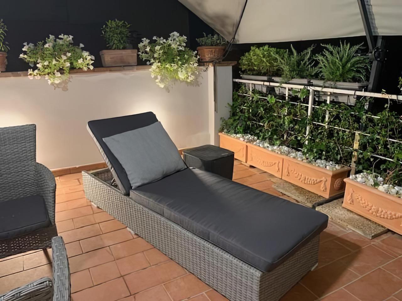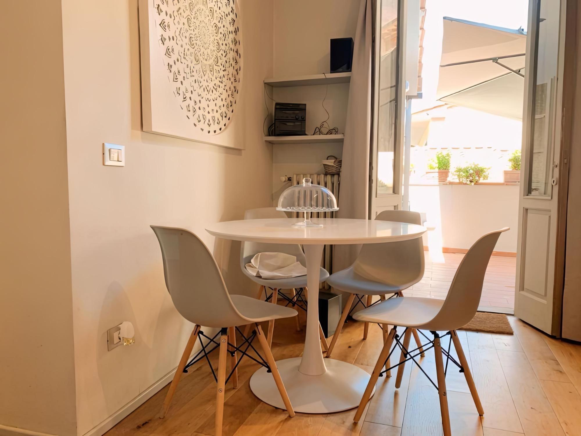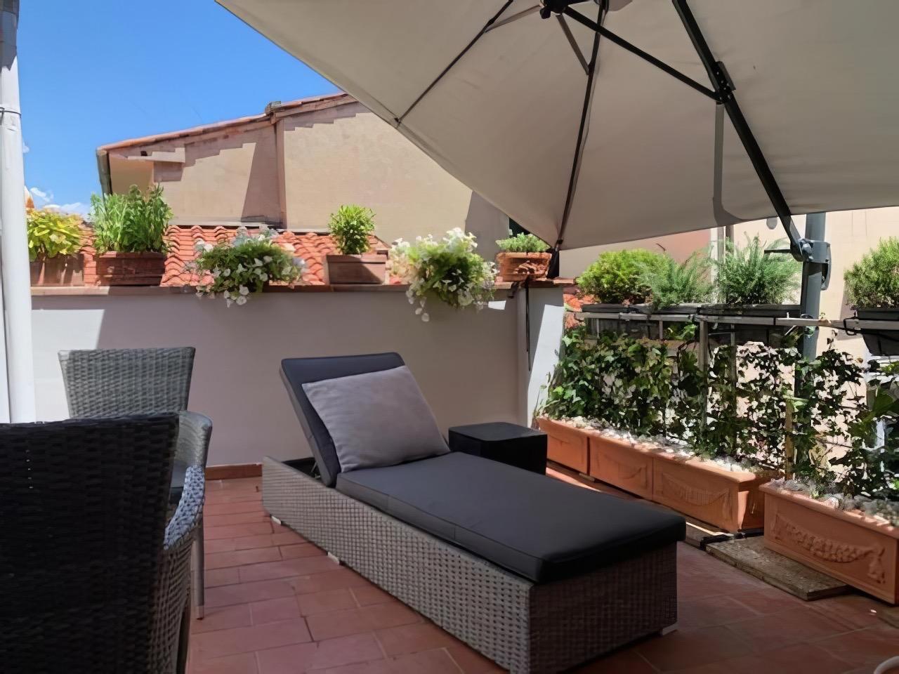 La terrazza è uno degli spazi più apprezzati della casa: arredata con lettino, stereo e un tavolo per colazione, pranzo o cena all’aperto, offre un angolo riservato e rilassante con vista sui tetti del centro storico.