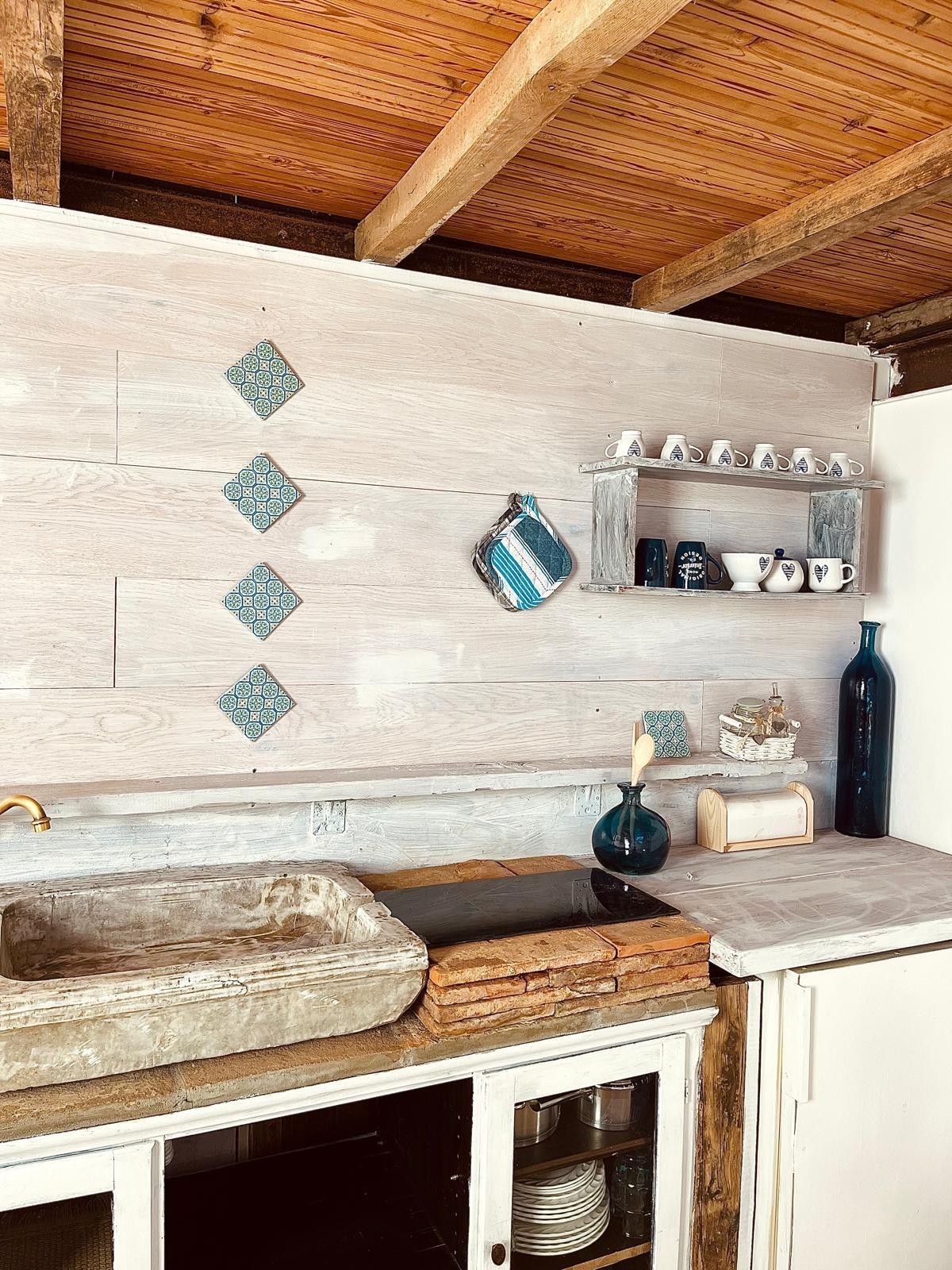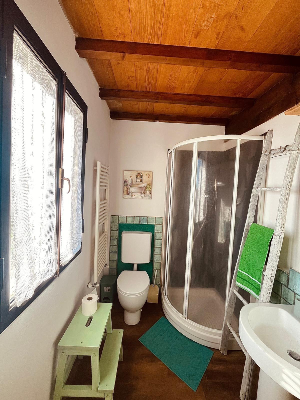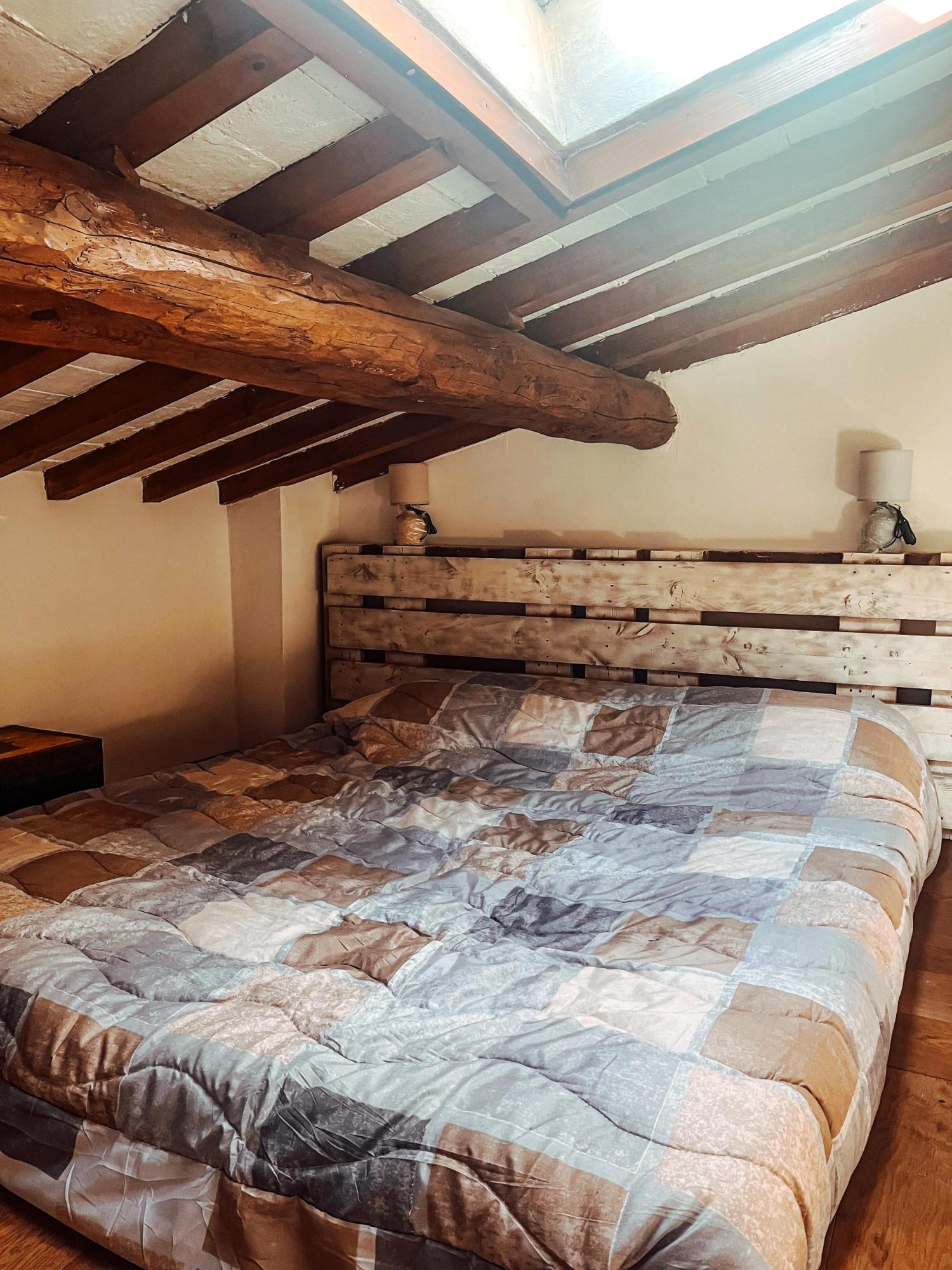 La zona de estar combina el salón y la cocina en un único espacio funcional, ideal para momentos de relajación y convivencia. El baño, luminoso y bien acabado, cuenta con una amplia ducha y detalles artesanales que realzan su estilo. La zona de descanso se encuentra en un altillo de madera, donde la cama matrimonial está iluminada por una ventana en el techo que proporciona luz natural durante el día y vistas al cielo estrellado por la noche.