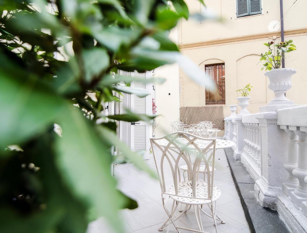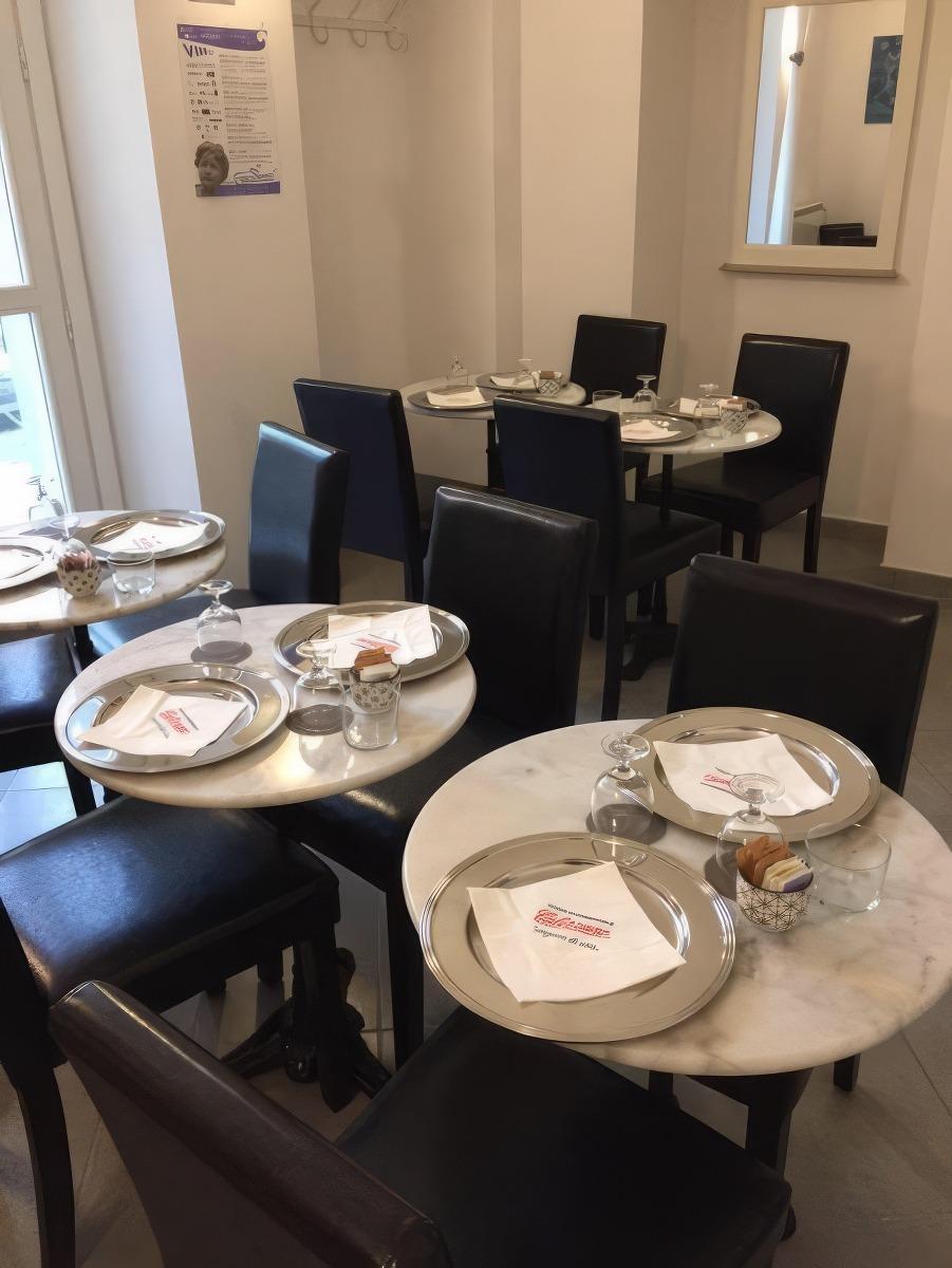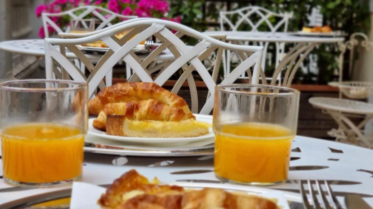 Der Frühstücksraum, gemütlich und einladend, ist elegant eingerichtet: Tische aus schwarzem Gusseisen mit weißen Marmorplatten, Sitzgelegenheiten aus schwarzem Kunstleder und ein Buffet auf einem stilvollen Tisch aus weißem Holz. In der schönen Jahreszeit können die Gäste ihr Frühstück auf der Terrasse genießen, einem Außenbereich, der dem Morgen einen Hauch von Frische verleiht.