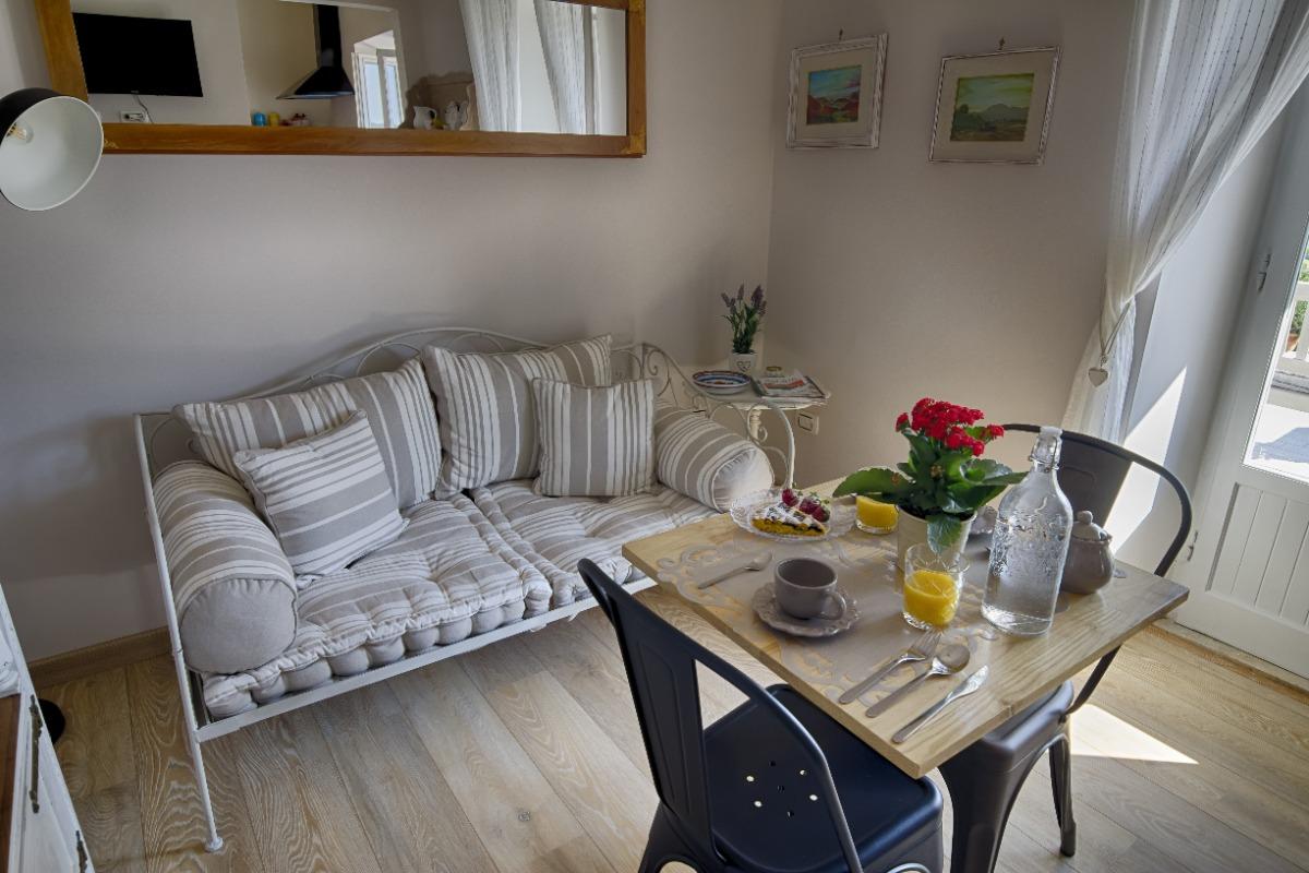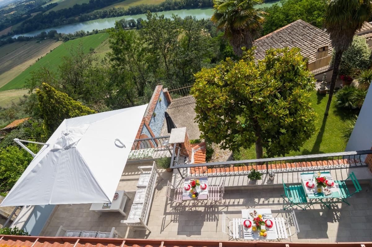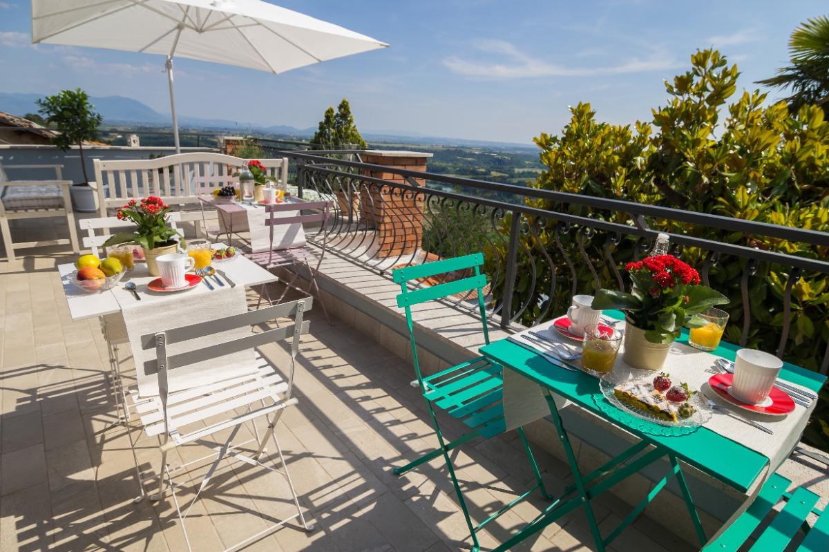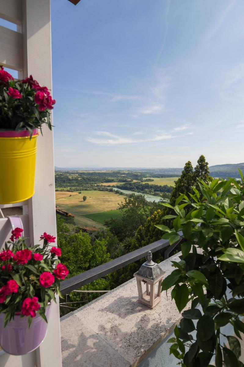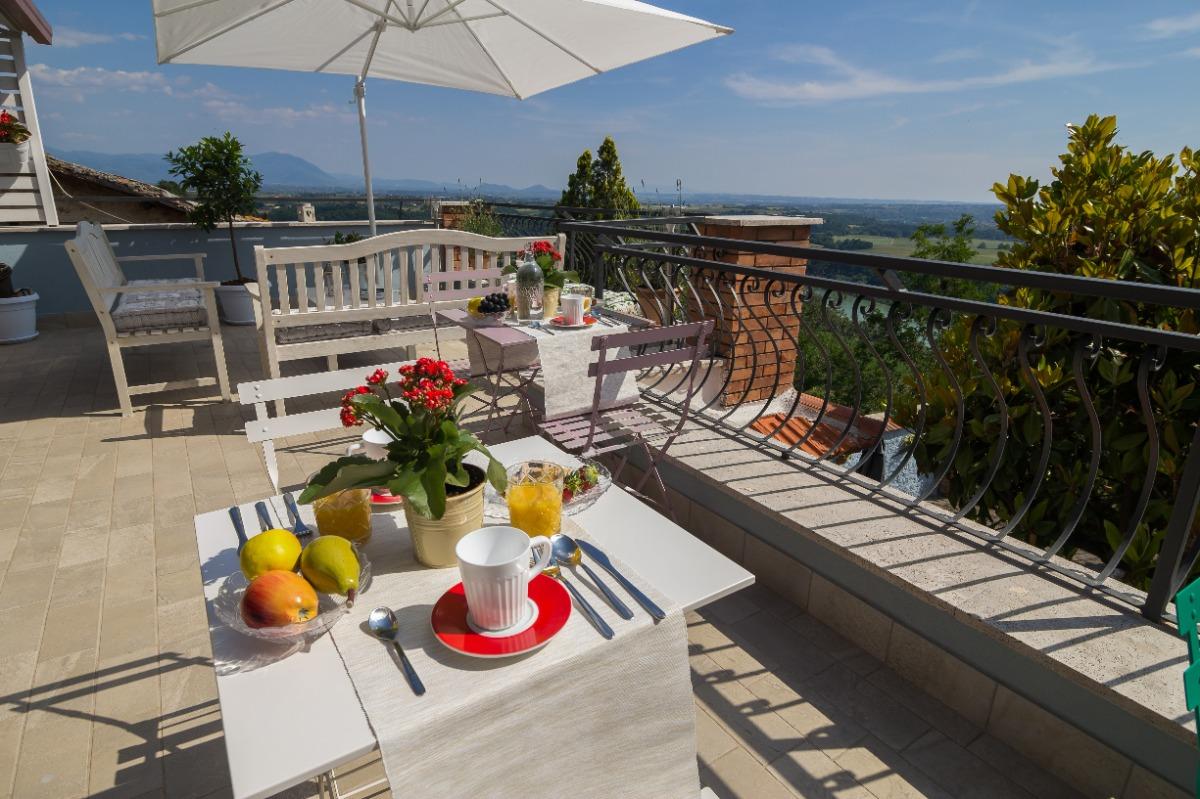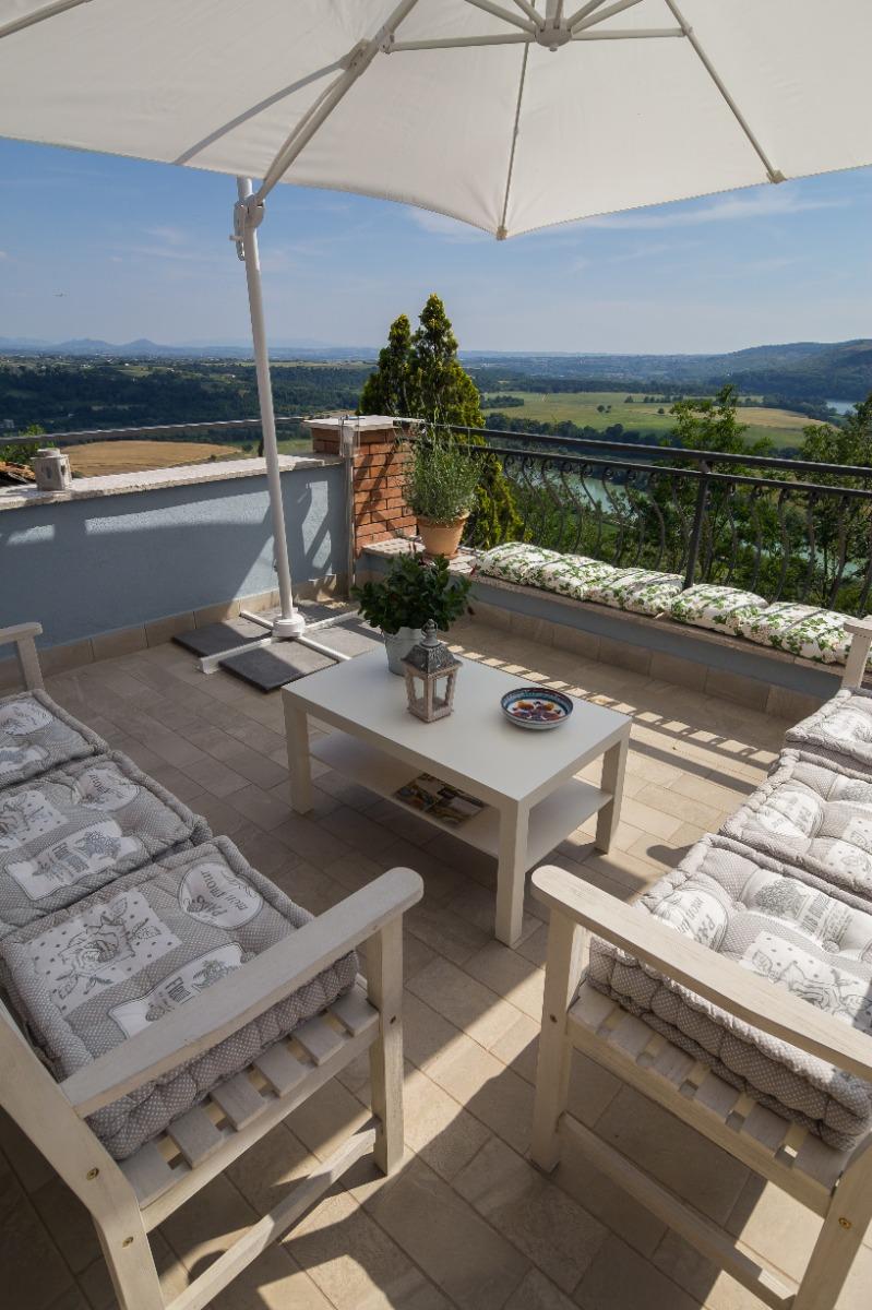 The B&B features two spacious and cozy rooms with private bathrooms, as well as a comfortable lounge area with a kitchenette. Breakfast, prepared with local products, is served on the beautiful panoramic terrace overlooking the Tiber Valley, where the landscape unfolds along the river’s meander and the Tevere-Farfa nature reserve. The terrace, furnished with comfortable sofas, is the perfect spot to relax under the sun or in the shade during summer afternoons, surrounded by flowers and aromatic herbs.