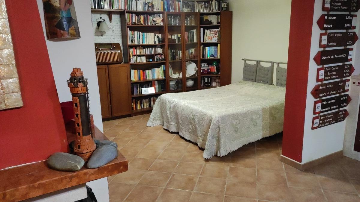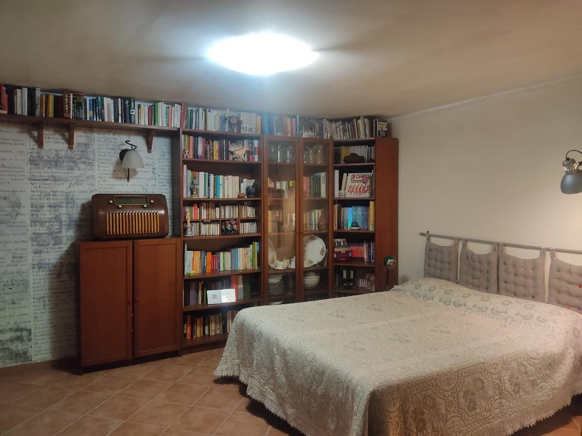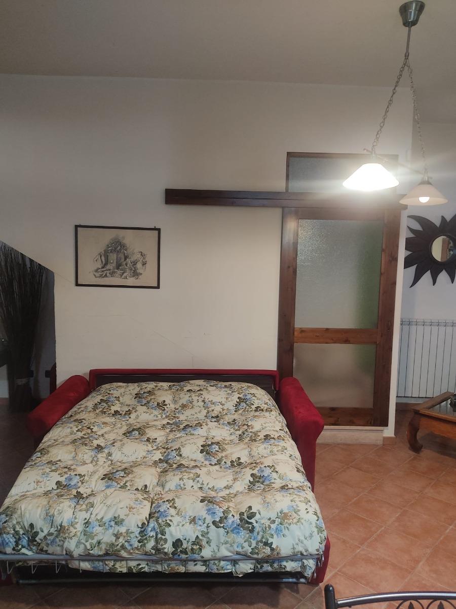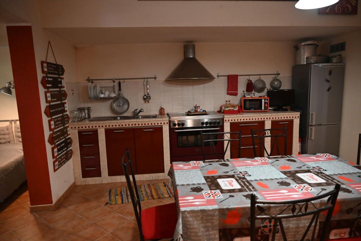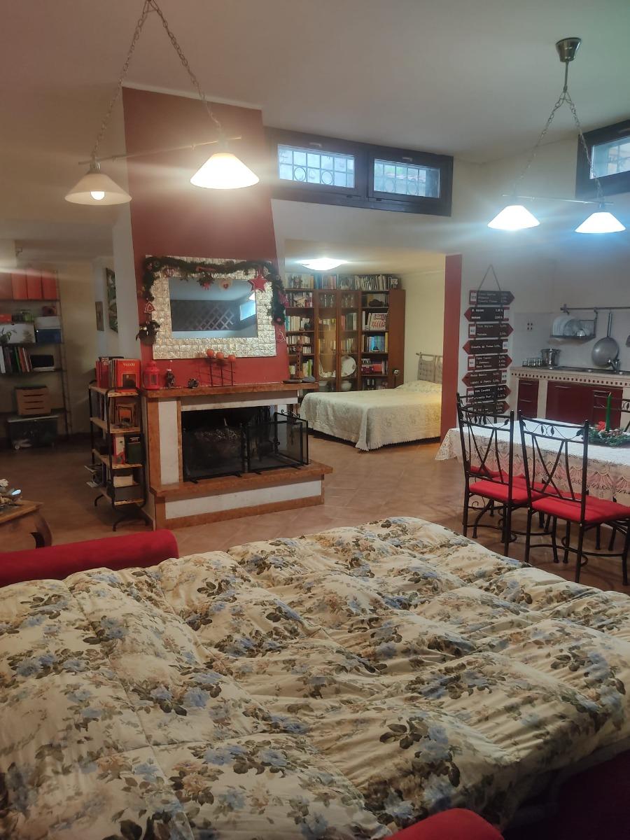 The apartment is nestled in a quiet residential area, easily accessible from street level via a staircase. It consists of a spacious single room of over 80 square meters, equipped with a large fully equipped kitchen with electric oven, 5-burner hob, microwave, tables, chairs, armchairs, TV with streaming services, a PC available to guests, WIFI connection, a vast library, a fireplace, a bathroom with shower and washing machine, a double bed, and a comfortable double sofa bed. Outside, you can enjoy a lovely garden with trees and a bench, from which you can admire breathtaking views with colorful sunsets and lush countryside.