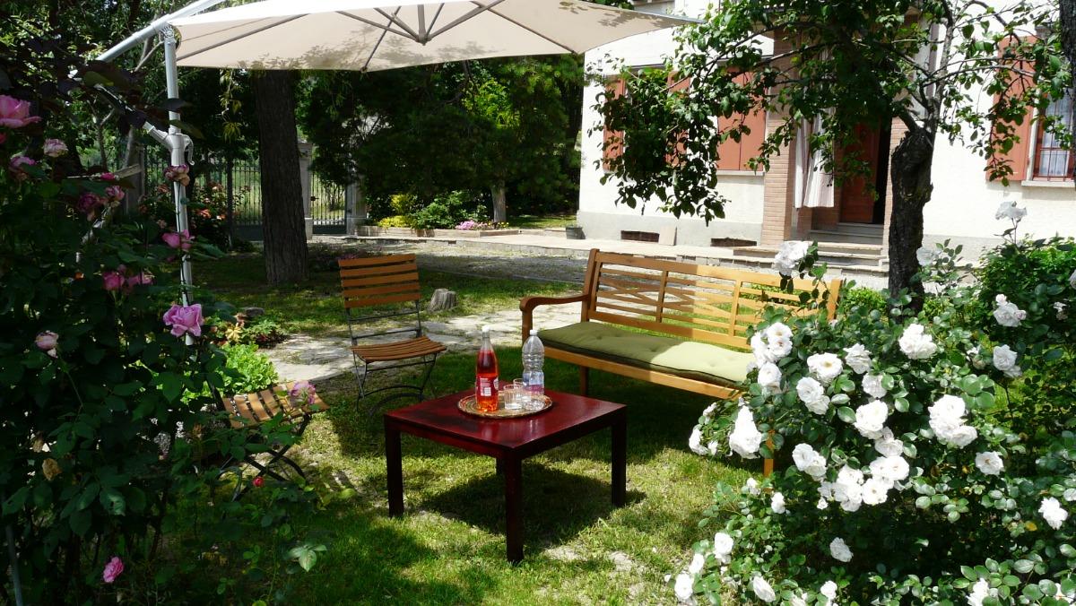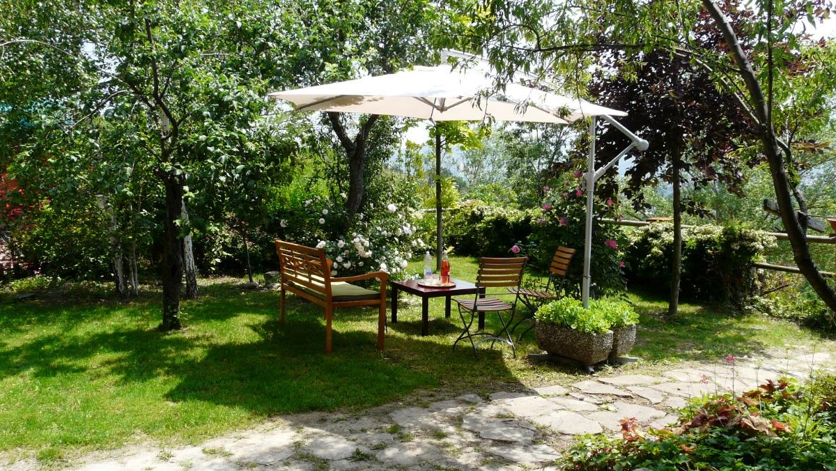 Der Garten ist der schönste Teil des Hauses. Wie ein Balkon öffnet er sich zur darunterliegenden Talmulde und bietet eine grüne Oase. Sich im Schatten der Bäume zu entspannen und bei Sonnenschein die Landschaft zu bewundern, vermittelt ein intensives Vergnügen, besonders in der Stunde vor dem Sonnenuntergang. An diesem Ort kann man sich ohne Hast eine kleine Auszeit gönnen. Ein paar zusätzliche Minuten für ein Gespräch und ein erfrischendes Getränk allein oder mit Freunden sind immer willkommen.