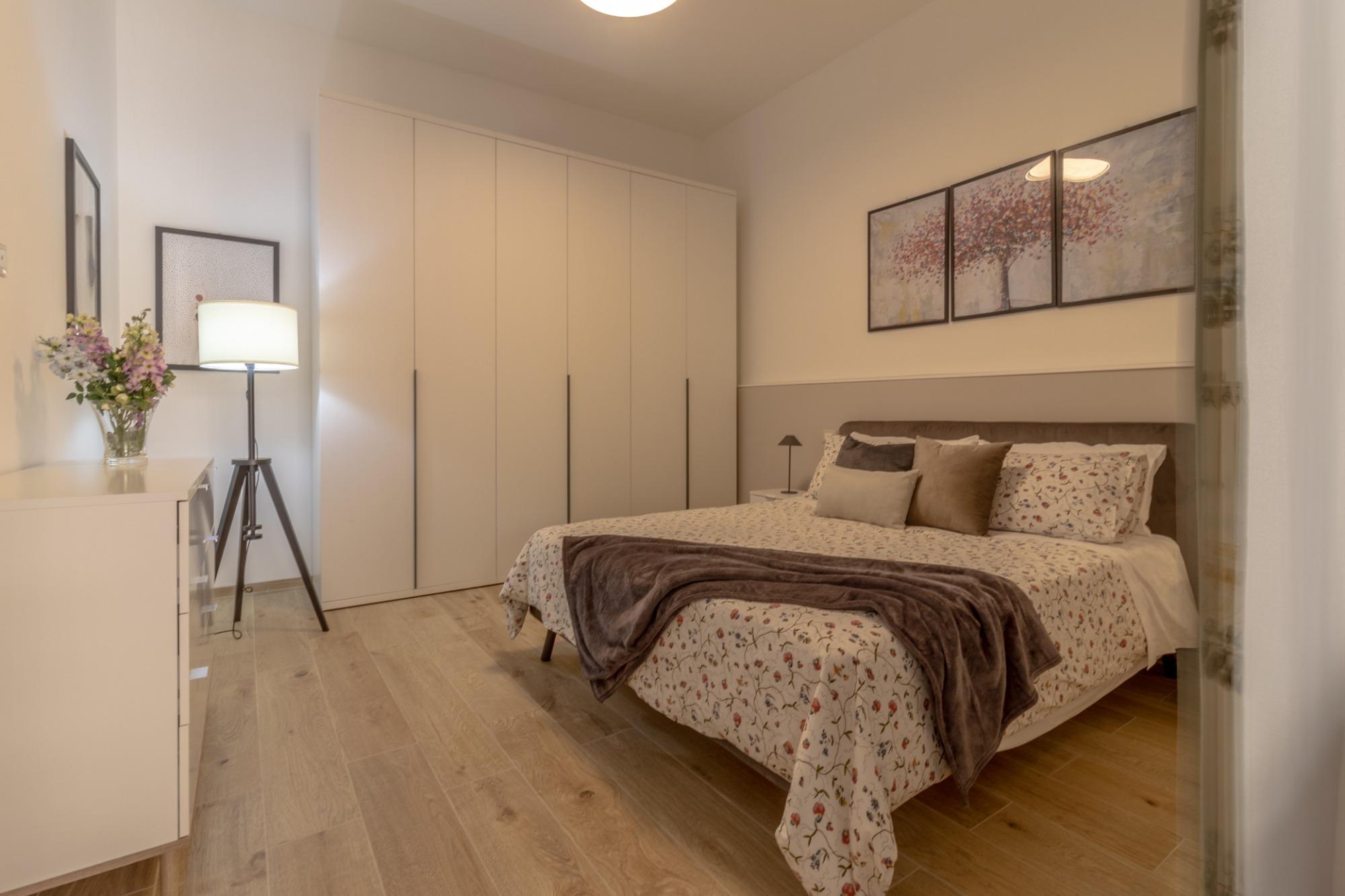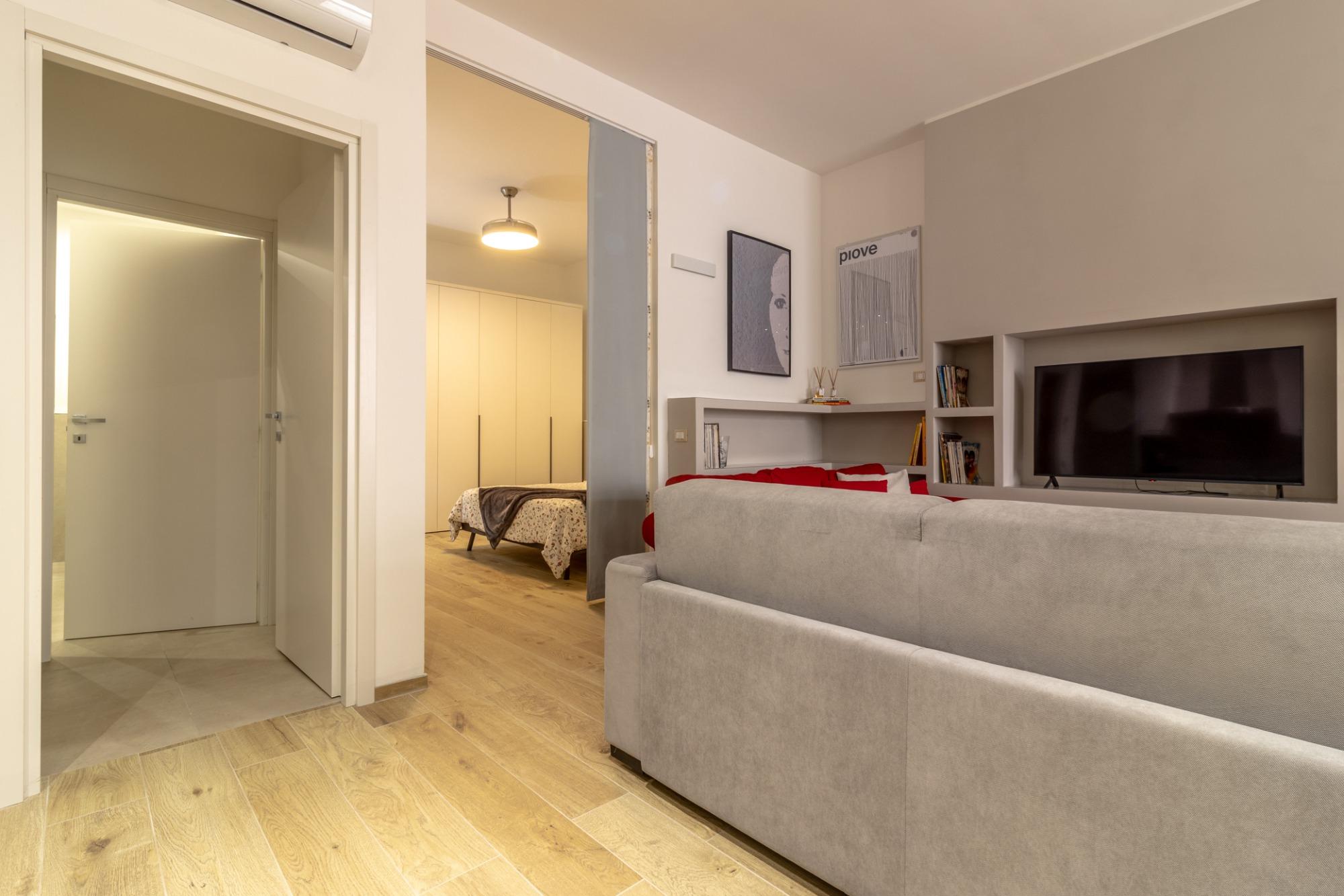 L’appartamento dispone di una cucina con penisola completamente attrezzata, un luminoso soggiorno con TV da 55”, Wi-Fi ad alta velocità e comodo divano letto, una camera matrimoniale e un bagno completo con lavatrice e asciugatrice.