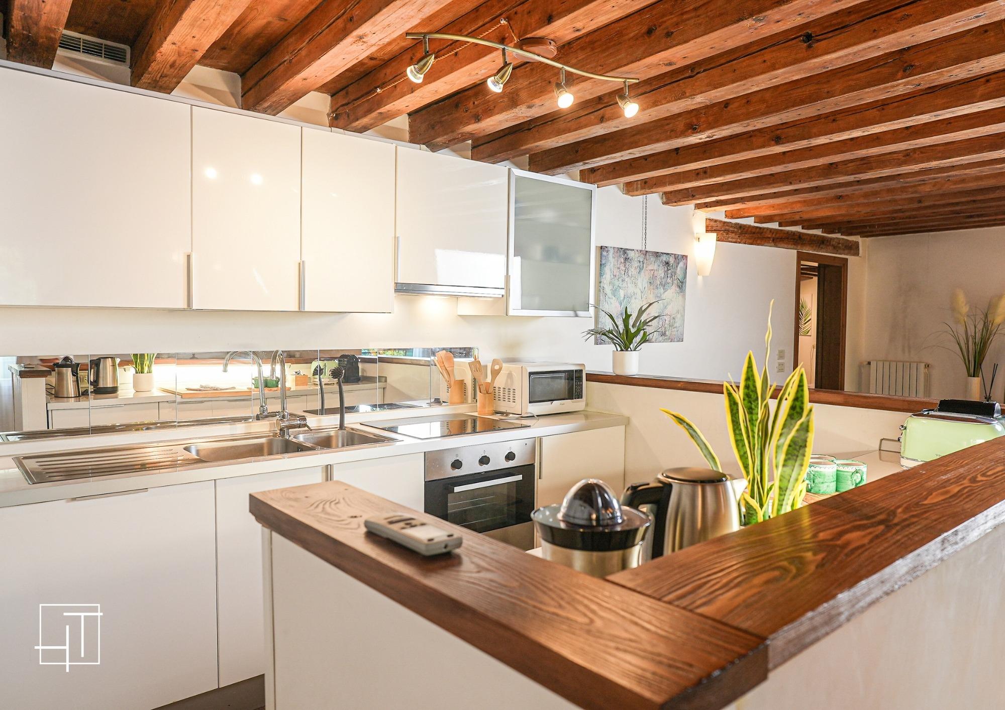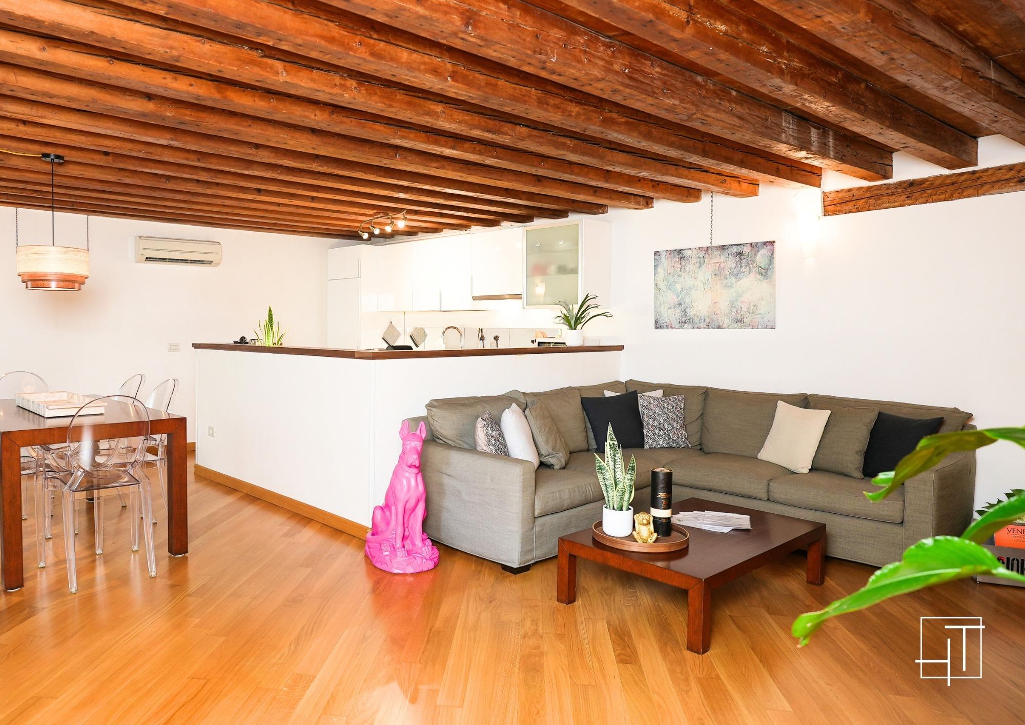 Guests enter through a beautiful garden designed by Giuseppe Jappelli in the mid-19th century. Upon stepping inside, they are greeted by a spacious living room featuring exposed beams from the 18th century and contemporary art, creating a harmonious blend of past and present. The living area, adorned with marmorino and flooded with natural light from large windows overlooking the garden, seamlessly connects to the open-plan kitchen, which includes a convivial island, marble and steel countertops, and top-of-the-line appliances.