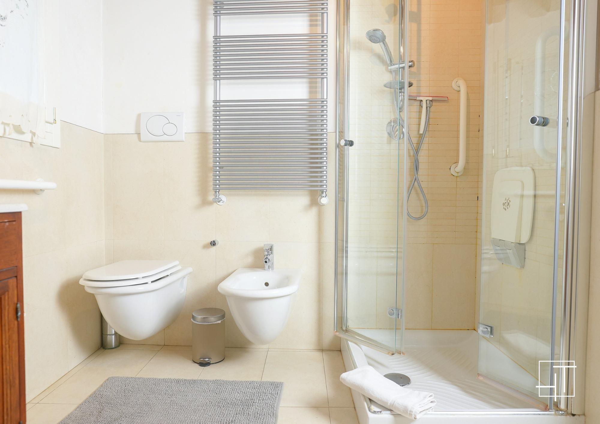 The modern, windowed bathroom includes a glass shower enclosure, wall-mounted toilets, a washing machine, a dryer, and cleaning supplies, as well as a welcome kit with toiletries. The home is air-conditioned throughout and equipped with everything needed for a comfortable stay, including an iron, ironing board, and drying rack.