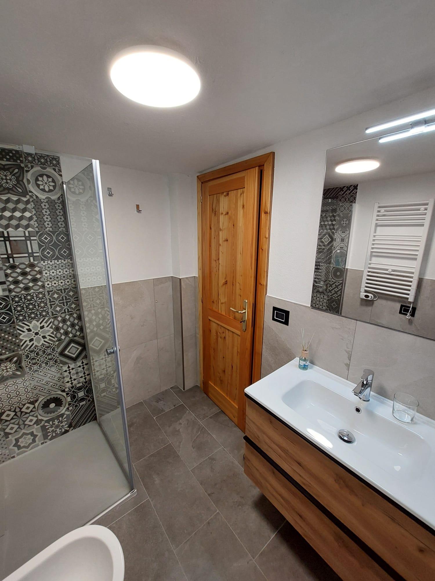 Un disimpegno porta al bagno con doccia e sanitari sospesi.