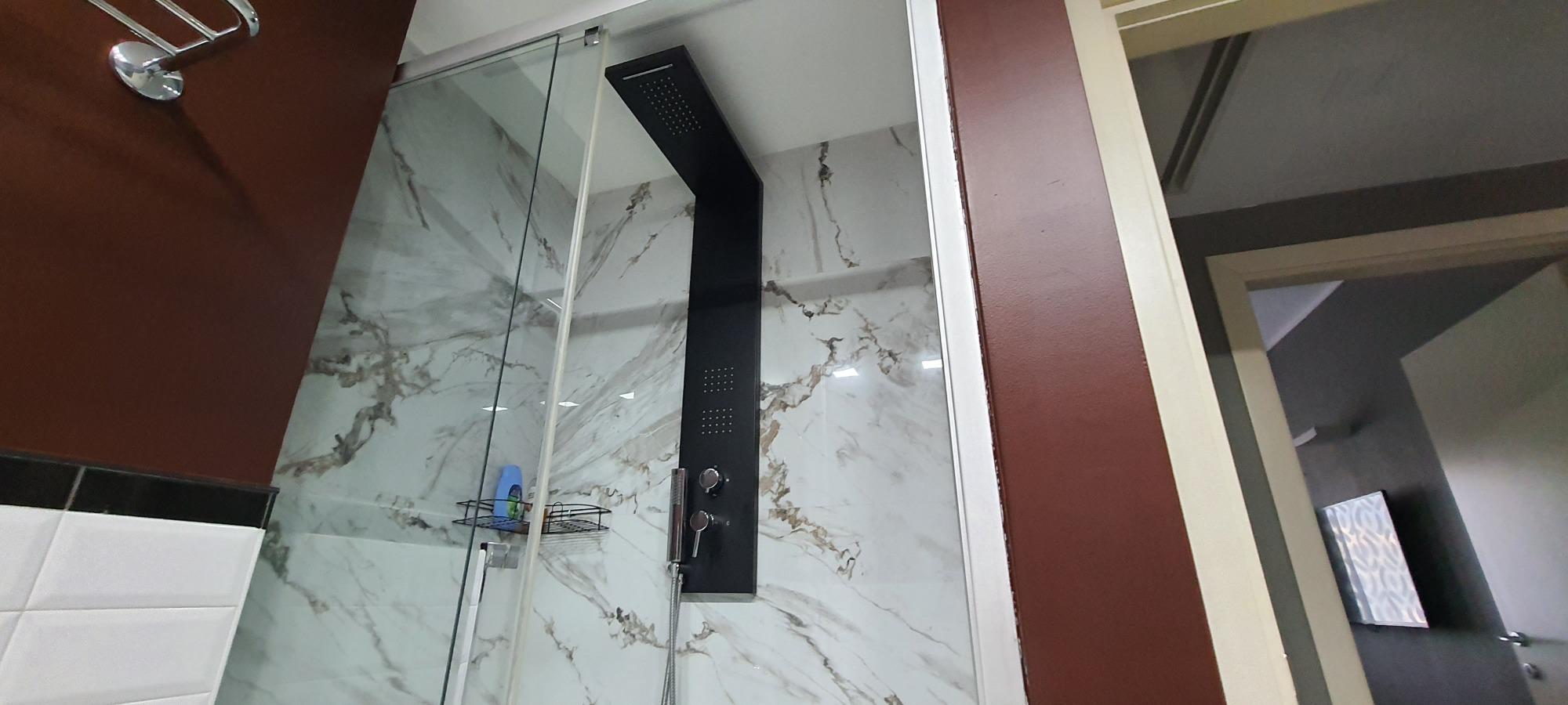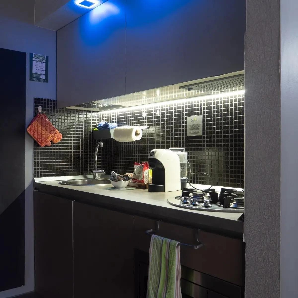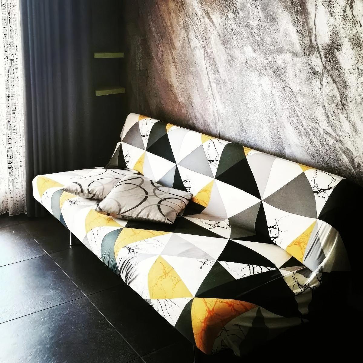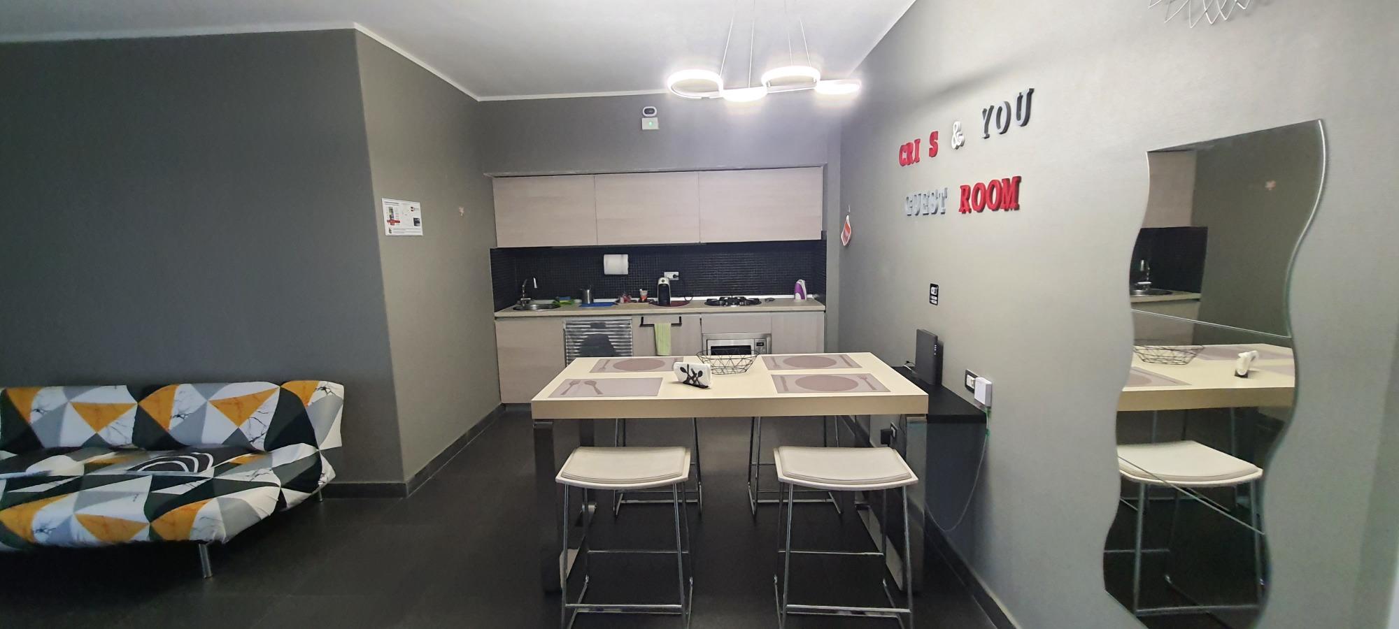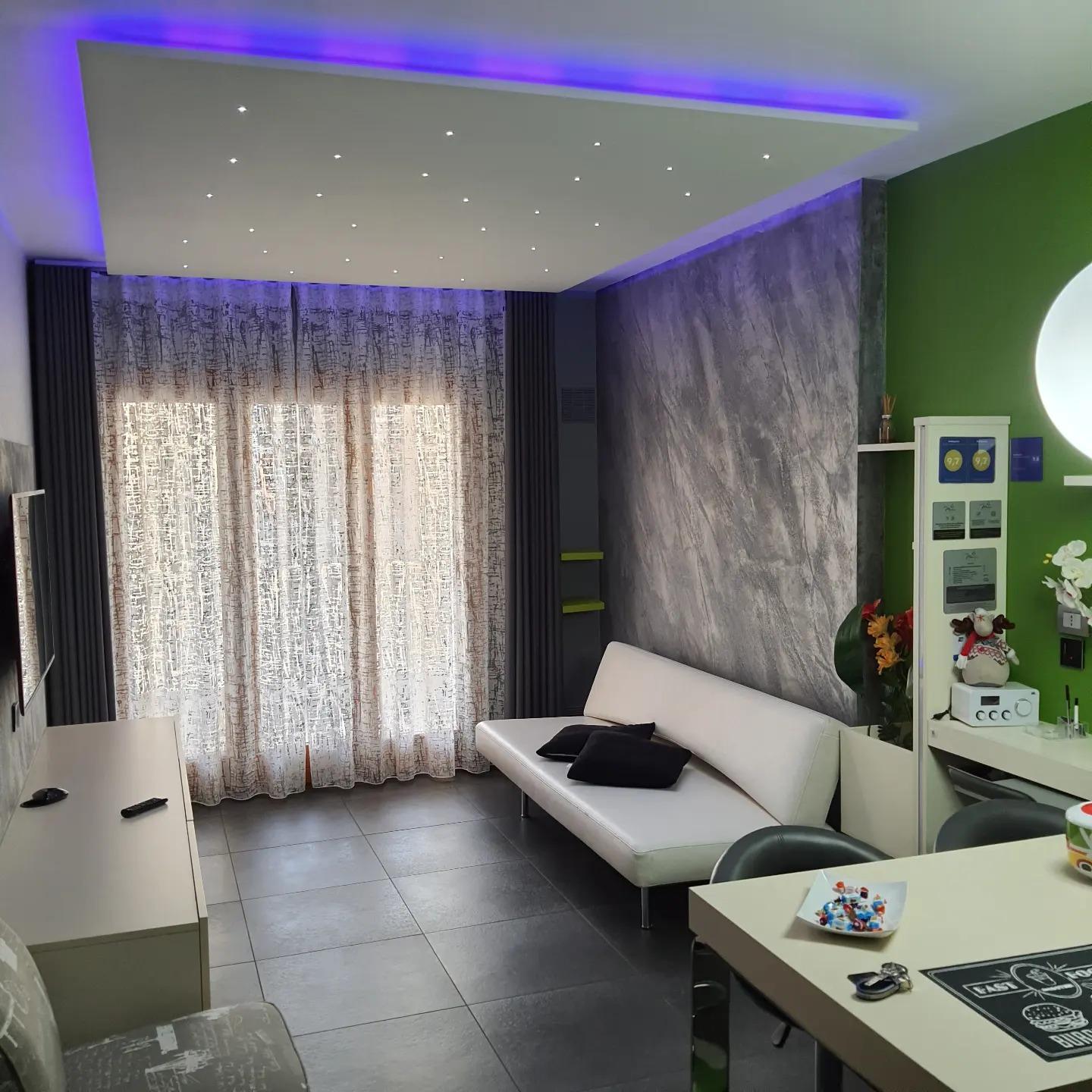 El apartamento se desarrolla en un espacio luminoso y bien distribuido. La zona de estar, decorada con un estilo contemporáneo, ofrece un cómodo área de relajación con un sofá cama de una plaza y media, un rincón de cocina equipado con nevera, microondas y utensilios de cocina, y un comedor que también puede funcionar como oficina. La habitación principal es espaciosa, cuenta con una cama king size, un armario empotrado, una caja fuerte y una smart TV. El baño está embellecido con un revestimiento de mosaico de vidrio, una amplia ducha con cabezal de lluvia e iluminación multicolor, además de un secador de pelo a disposición de los huéspedes.