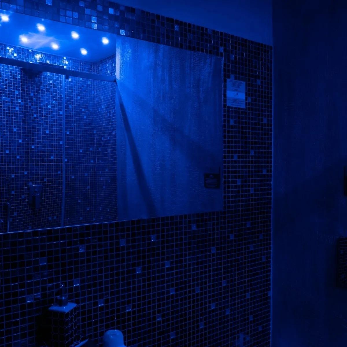 Para completar la suite, hay una terraza cubierta con vista al Parque del Bienestar, equipada con asientos, un rincón para desayunar y un lavabo de diseño, ideal para disfrutar de momentos de relajación al aire libre. La atmósfera se vuelve aún más encantadora gracias a los juegos de luces LED que crean una iluminación envolvente en cada espacio.