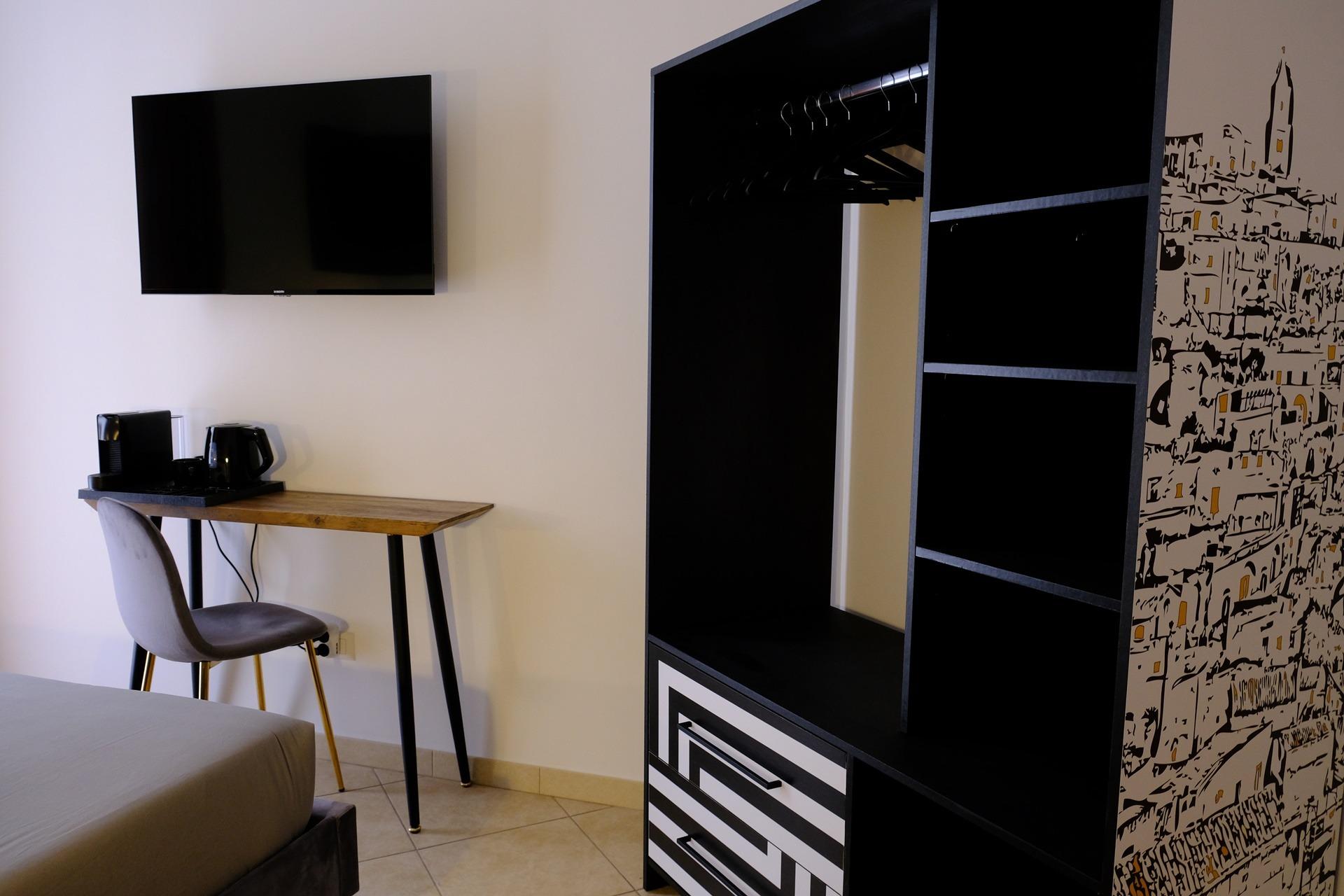 Das Standard-Doppelzimmer ist die ideale Wahl für ein Paar, das während seines Aufenthalts in Matera Intimität und Komfort sucht. Mit einem französischen Bett ausgestattet, bietet dieses Zimmer eine gemütliche und private Atmosphäre, perfekt zum Entspannen nach einem Tag voller Erkundungen. Wie alle unsere Zimmer ist es mit modernen Annehmlichkeiten ausgestattet, um einen angenehmen und stressfreien Aufenthalt zu gewährleisten. Nur wenige Schritte vom historischen Zentrum Materas entfernt, ist das Standard-Doppelzimmer ideal für alle, die eine ruhige und bequeme Erfahrung im Herzen der Stadt suchen.