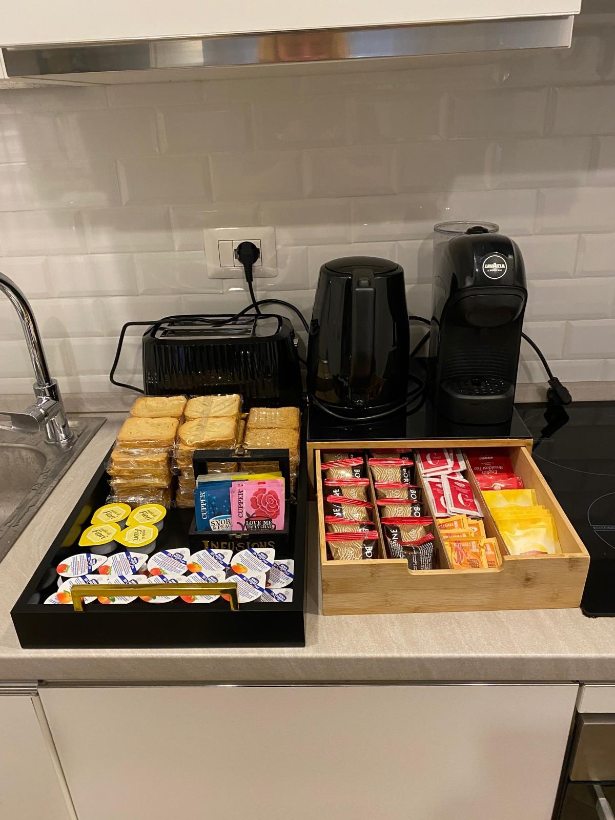 La colazione ti attende direttamente nel tuo appartamento: troverai un elegante vassoio con fette biscottate monoporzione, deliziosi barattoli di marmellata e miele, biscotti monoporzione e tutto il necessario per preparare bevande calde, dalle cialde di caffè alle varie tisane e tè. Un modo pratico e piacevole per cominciare la giornata senza dover uscire, con tutto ciò che ti serve a portata di mano.