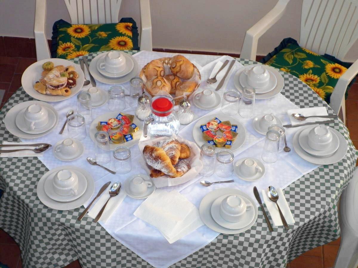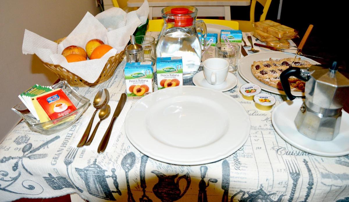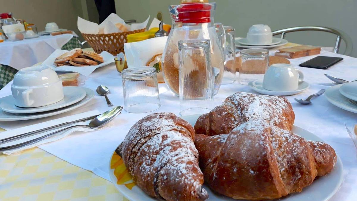 Italienisches Frühstück mit Kaffee, Milch, Säften, Butter, Marmelade, hervorragendem hausgemachtem Brot, Keksen und Croissants.