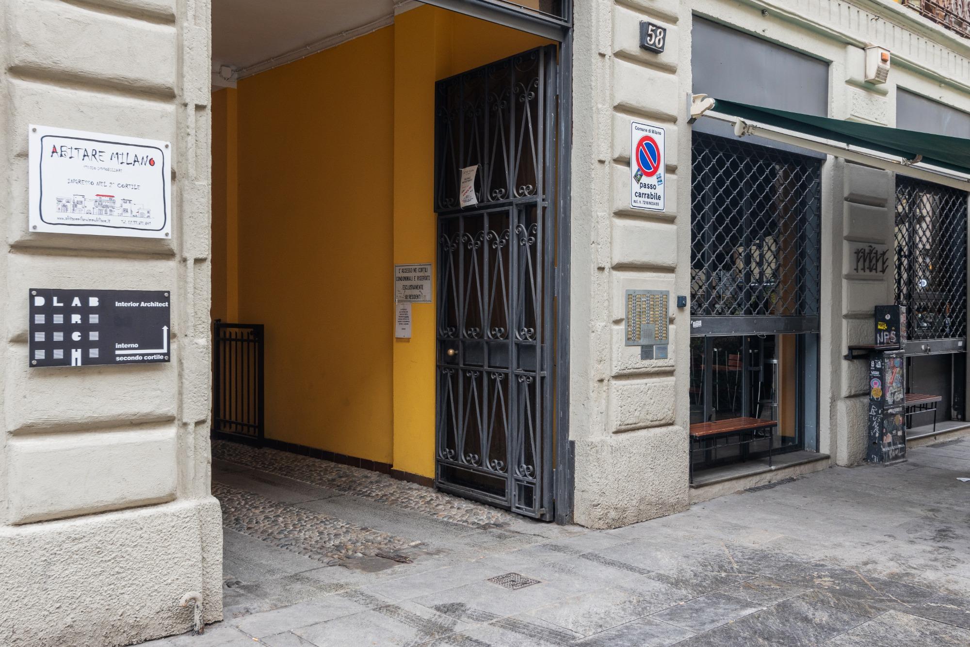 The apartment is situated on the fourth floor of a charming building from "Old Milan" that does not have an elevator, overlooking a pedestrian street, which provides a quiet and pleasant environment. Covering an area of about 25 square meters, the studio is bright and well-organized: it features a double bed, a fully equipped kitchenette, and a bathroom with a window, shower, and washing machine.