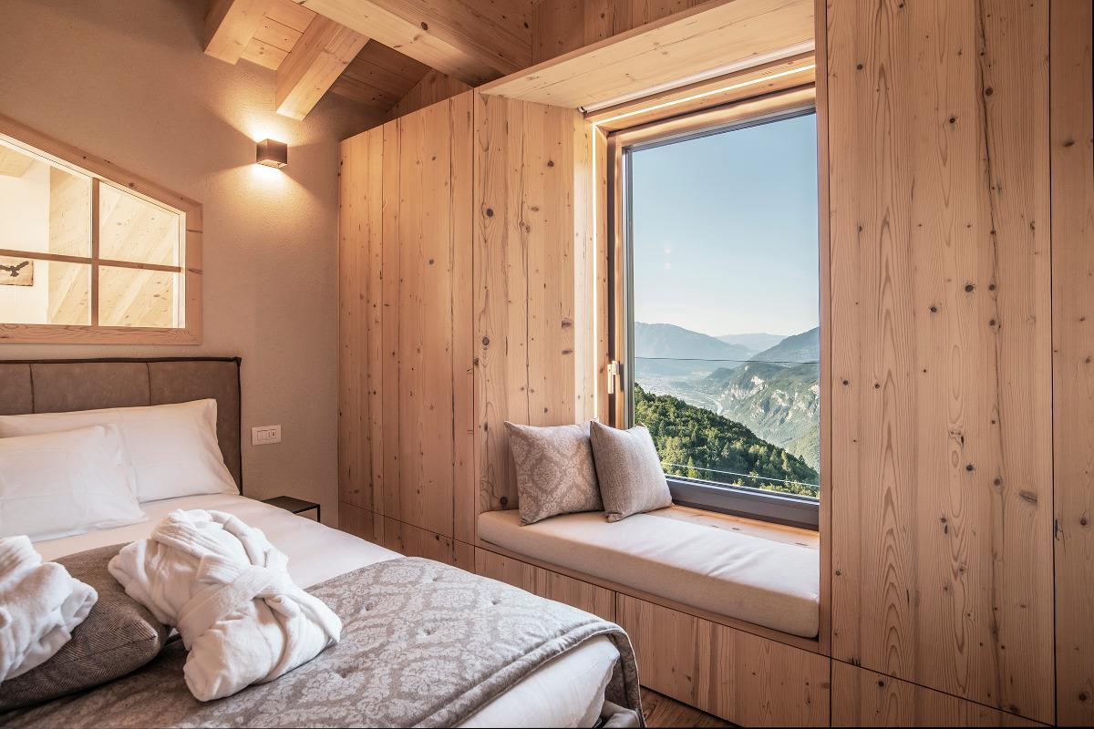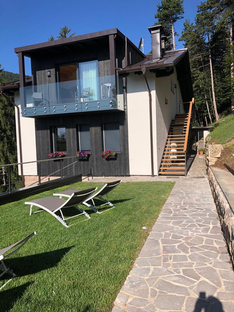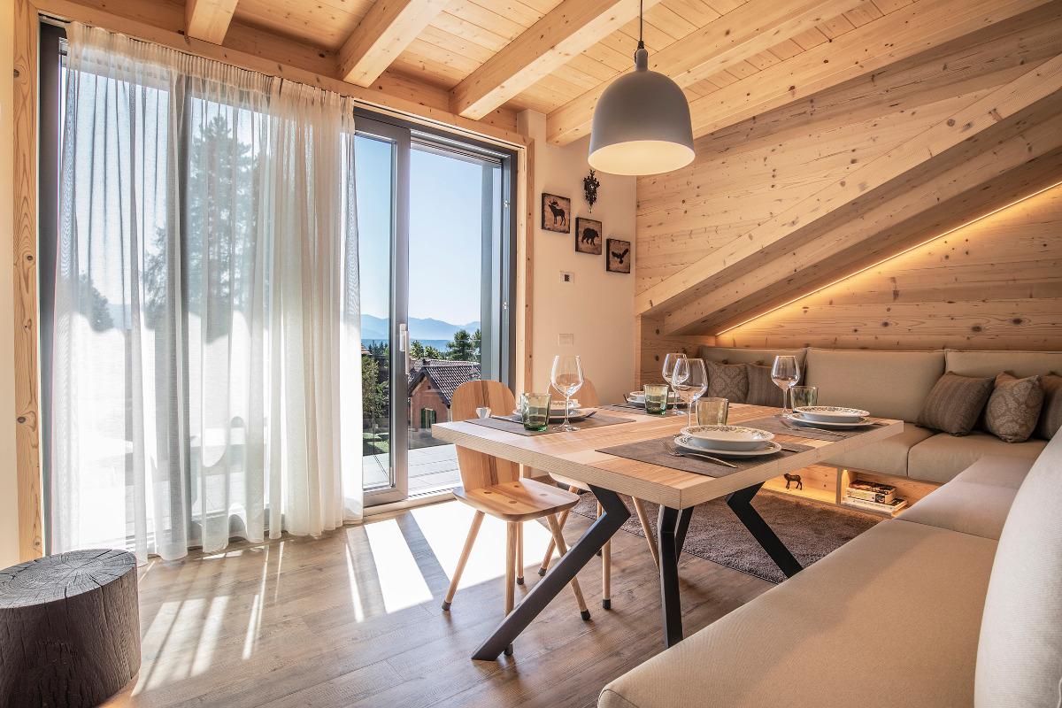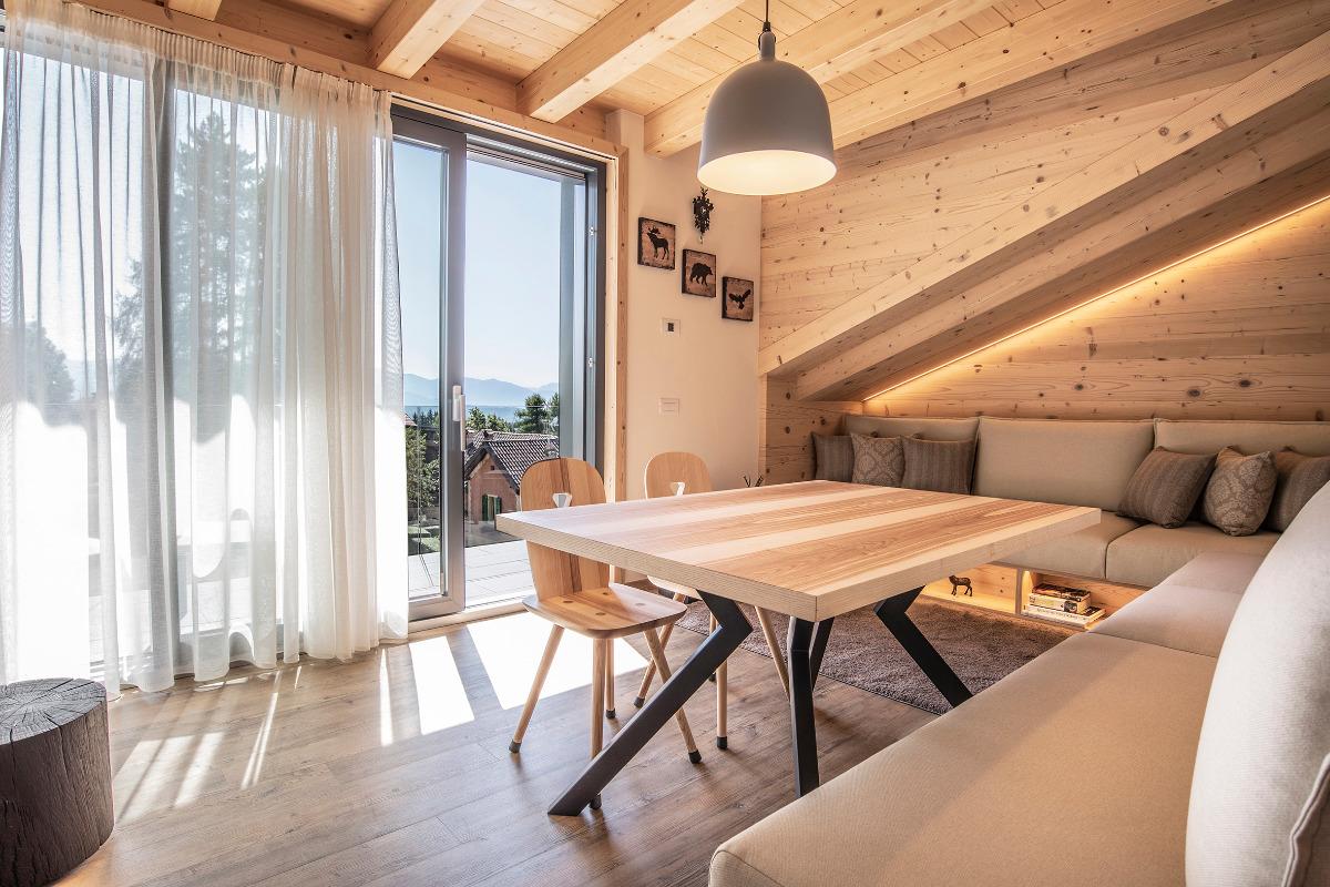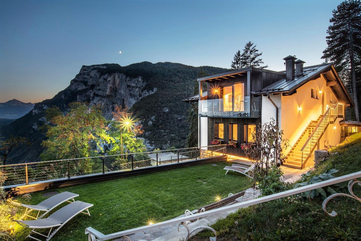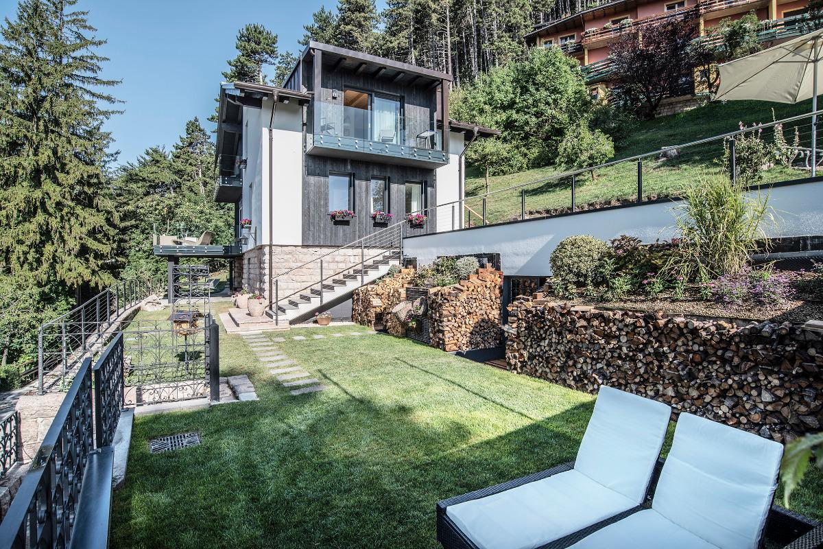 Our house is located in a privileged position, overlooking the valley and Paganella. Its modern lines blend harmoniously with traditional elements. Here you will immerse yourself in a warm and exclusive atmosphere. This project arises from the unconditional love for our land, its traditions, and contemporary modernity.