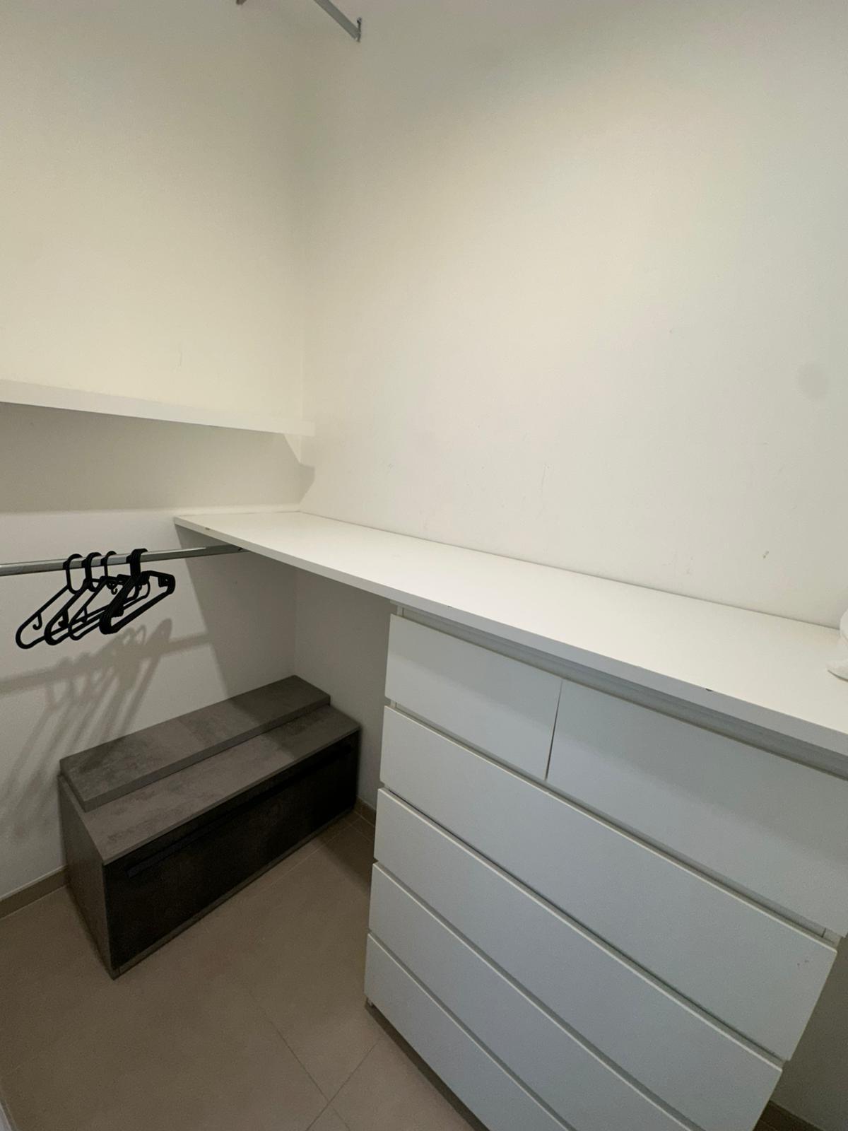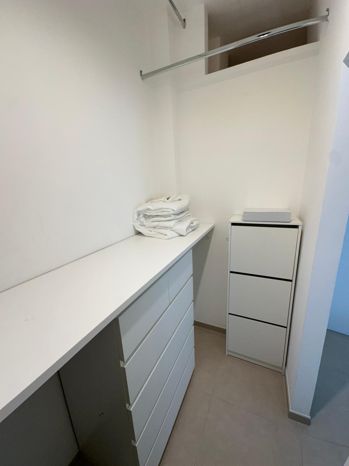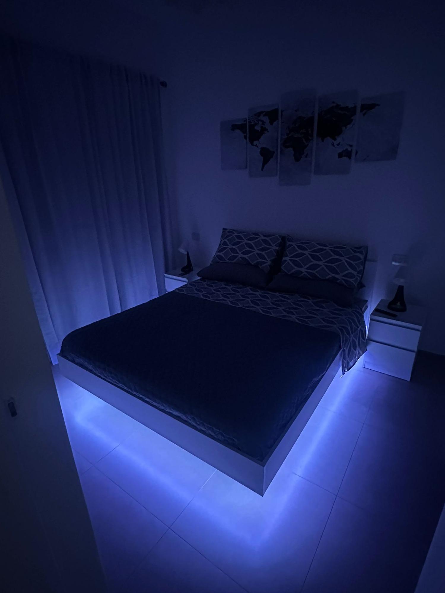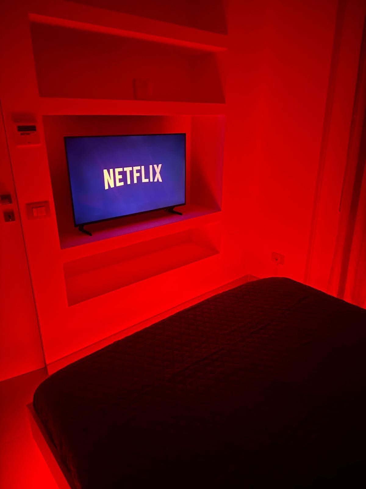 The bedroom, a true oasis of peace, is the heart of the apartment: a modern design space where every detail is carefully crafted. The suspended bed with LED lighting transforms the room into a magical retreat. The minimalist décor and art pieces on the walls add a touch of class that will embrace you with comfort.