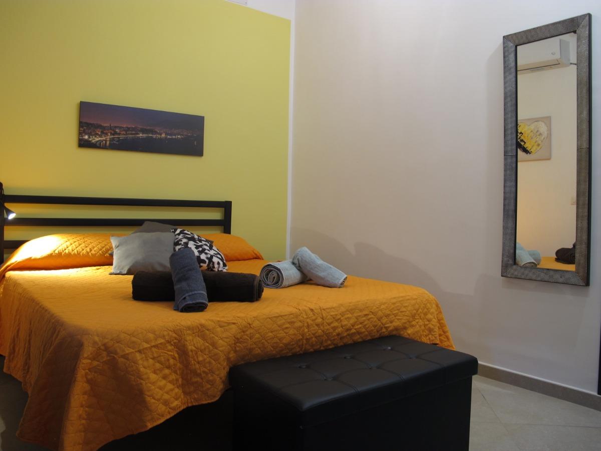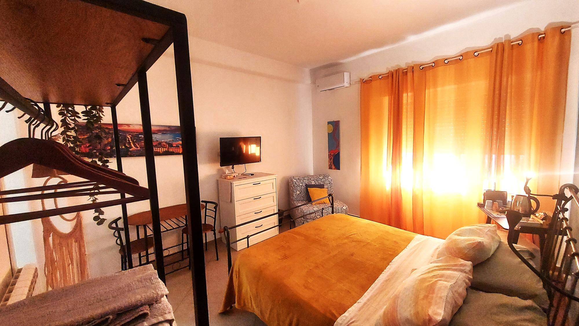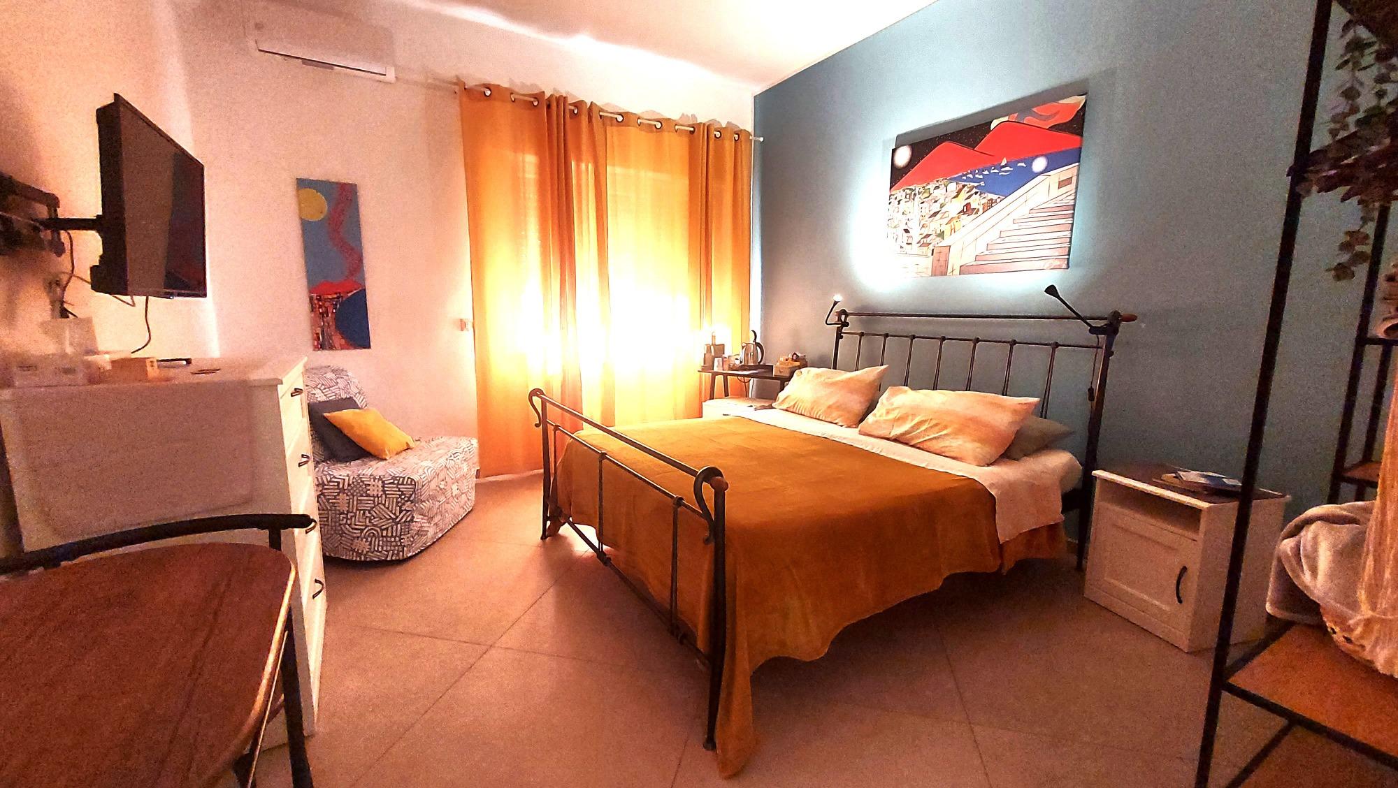 Camera doppia con letto matrimoniale, frigobar, TV, climatizzatore e bagno interno dotato di doccia e bidet.
