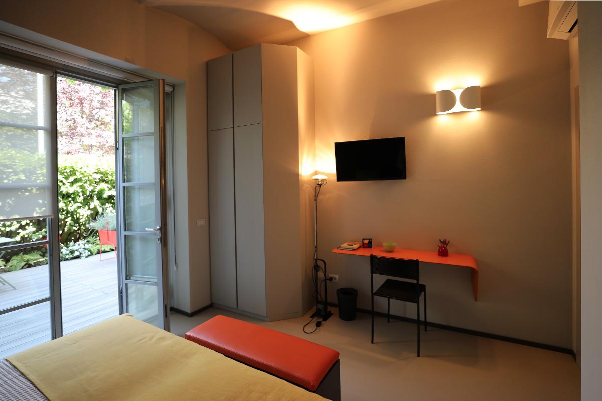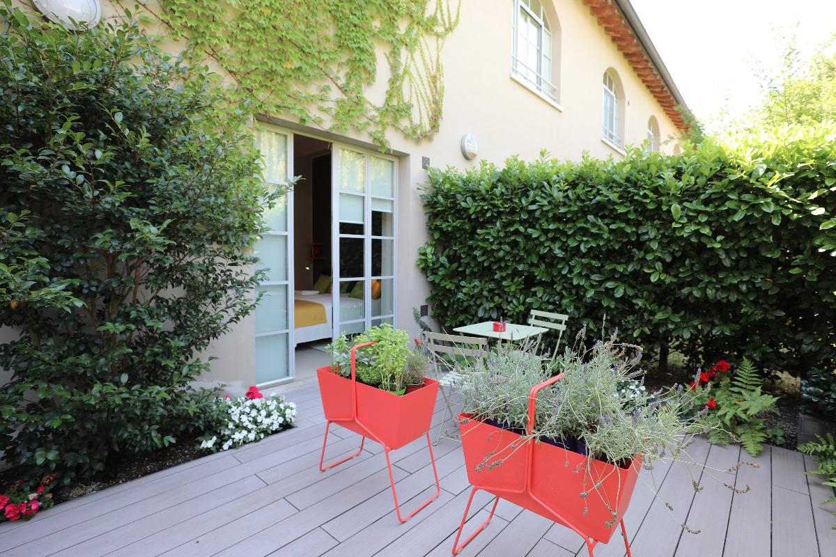 The Joker Bedroom opens directly onto a private terrace immersed in the green of laurel and ferns and in the colors of cyclamen and camellias.