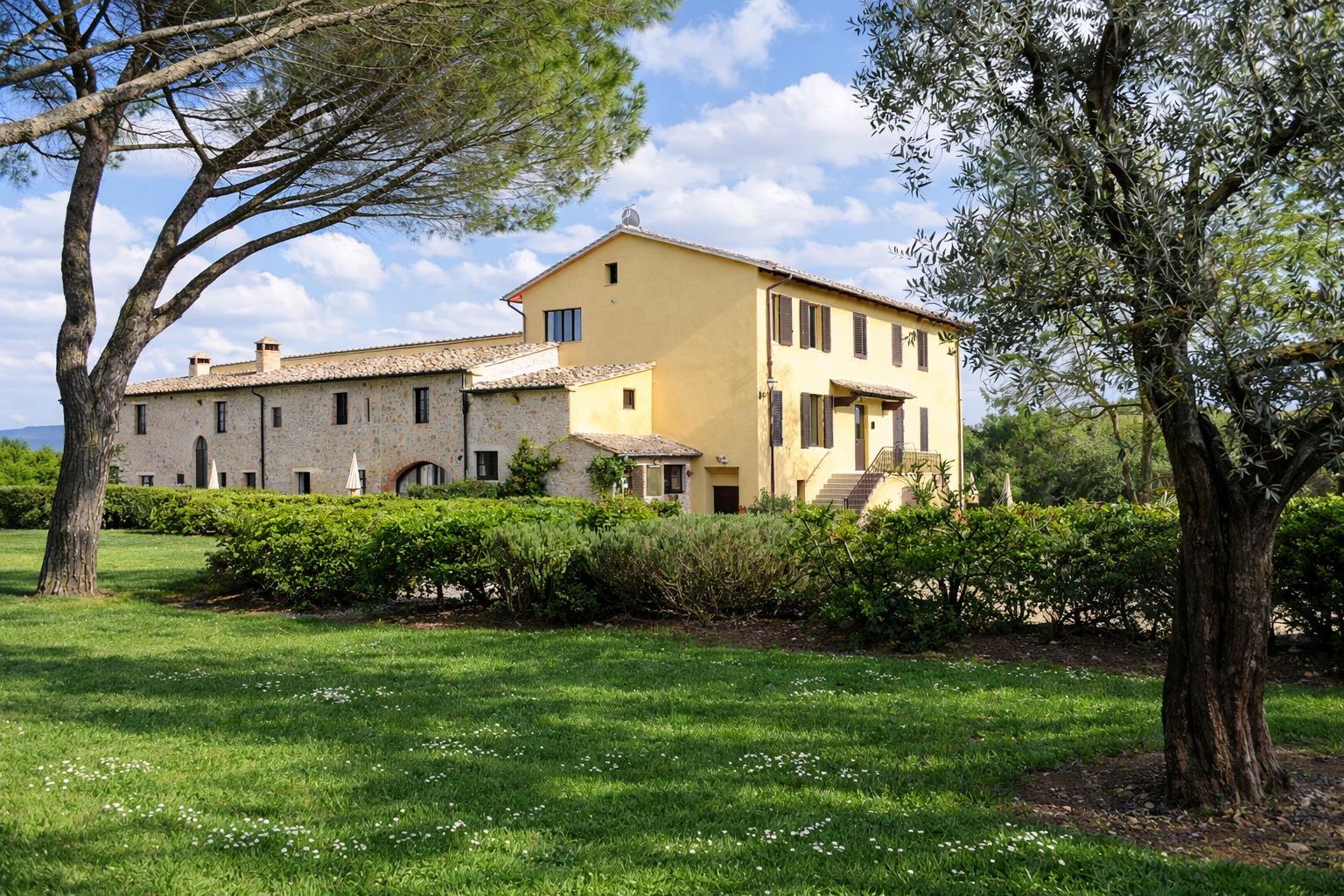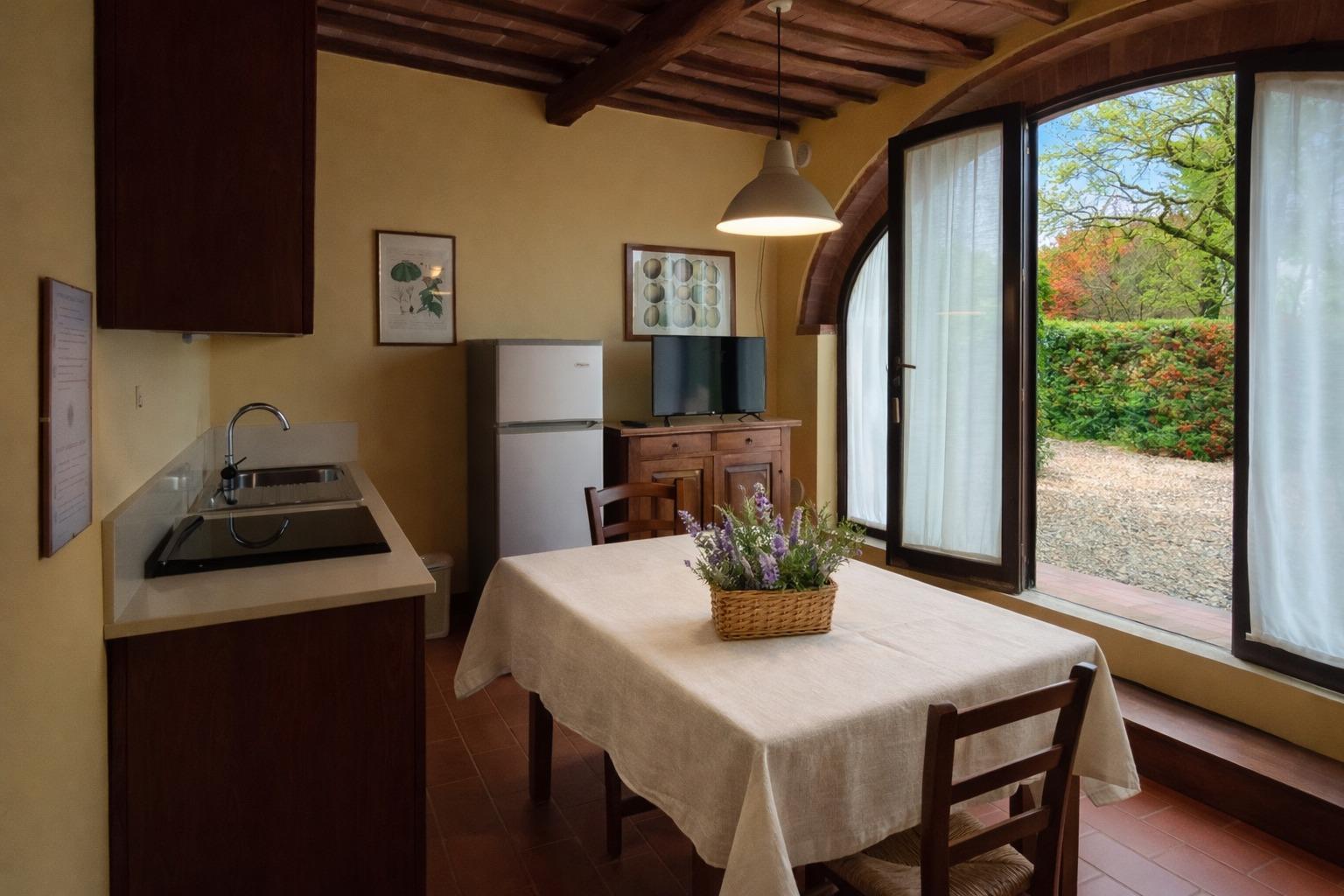 Villa L'Aia, within the farmhouse, guarantees privacy and tranquility with a living room/kitchen, a large living room with a fireplace and panoramic windows, two double bedrooms, a small bedroom, and three bathrooms, as well as a large private outdoor space.