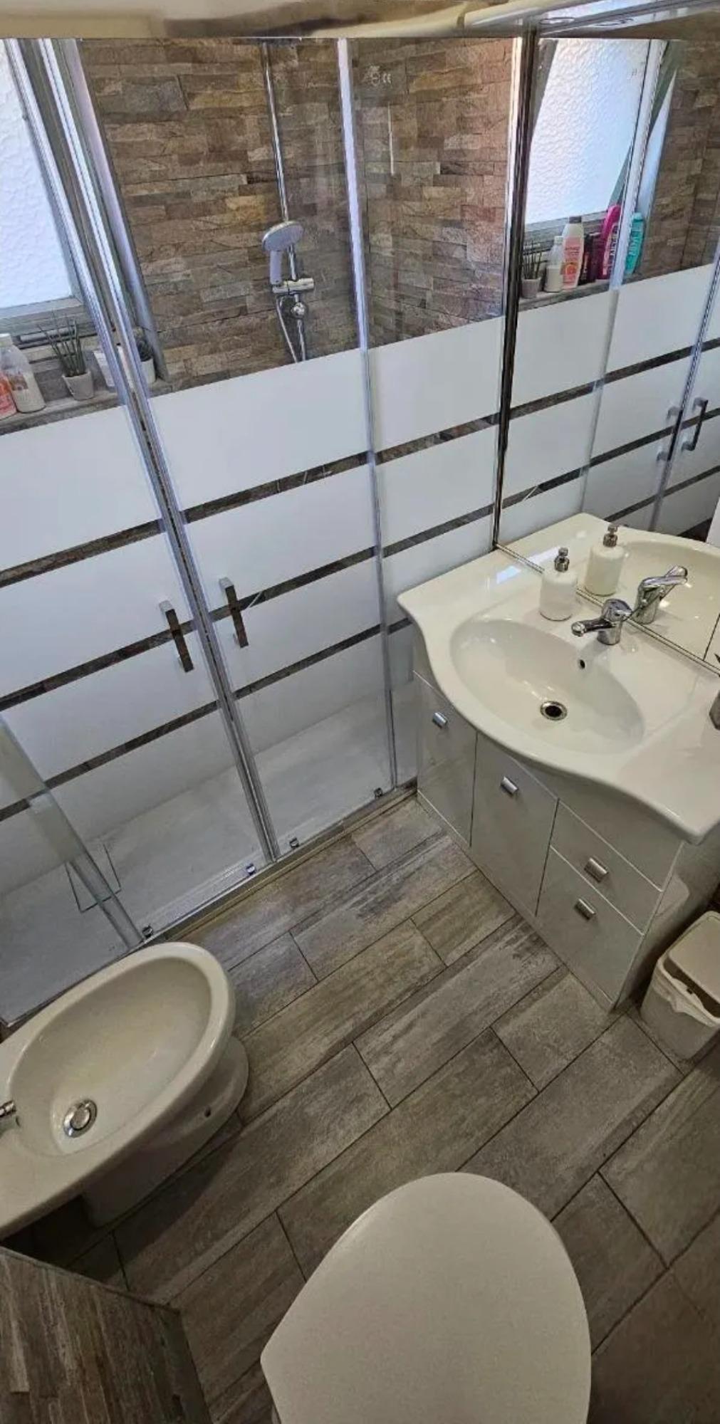 The apartment features two bright and simply furnished rooms equipped with spacious wardrobes, small tables, a TV, and bed linens. The shared bathroom, which has a window, includes a sink, toilet, bidet, bathtub with shower, and a hairdryer.