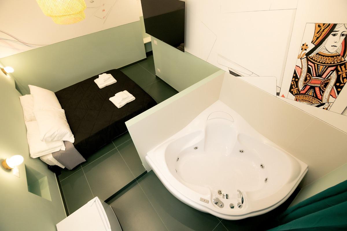 La Camera 3 è una Suite con Vasca Idromassaggio e letto Matrimoniale e accesso diretto ad un balconcino privato. Dotata di bagno in camera con Doccia Idromassaggio, Smart TV QLED 55", condizionatore, un tavolino a ribalta in tinta con le pareti e delle pitture murarie ispirate al Poker realizzate dai Fratelli Ruggieri.