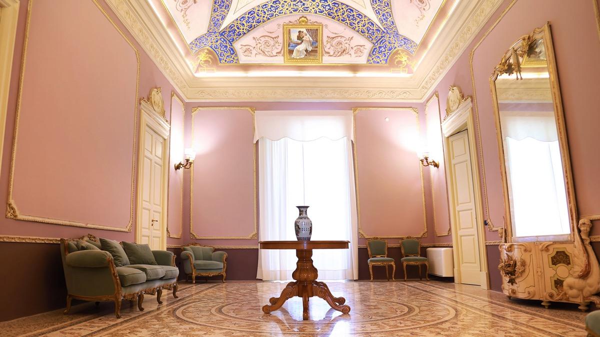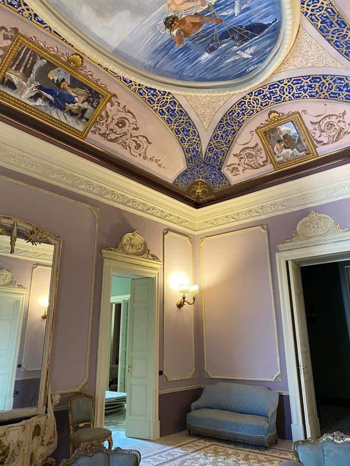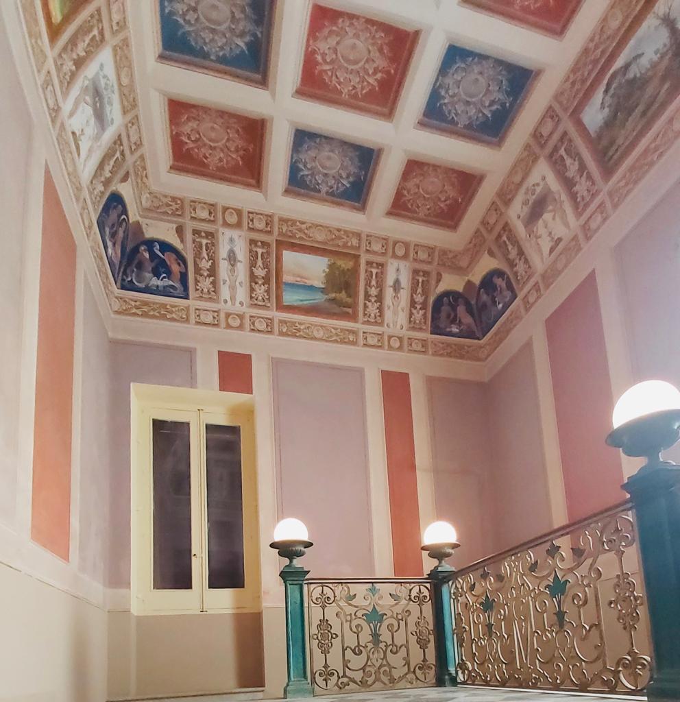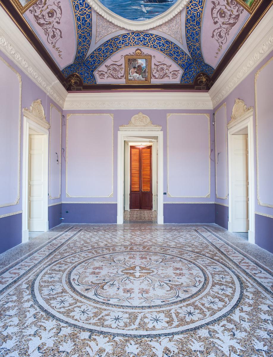The ten rooms on the noble floor are furnished with paintings and floors dating back to 1893, confirmed by the date on the decorated vaults by Agesilao Flora and his assistants. The mosaic floors displaying the family crest, the boiserie and faux marble plinths, the stucco frames on the salon walls, and the overdoors with decorative stucco figures complete the interior decorations, giving the space a pronounced Liberty style.
