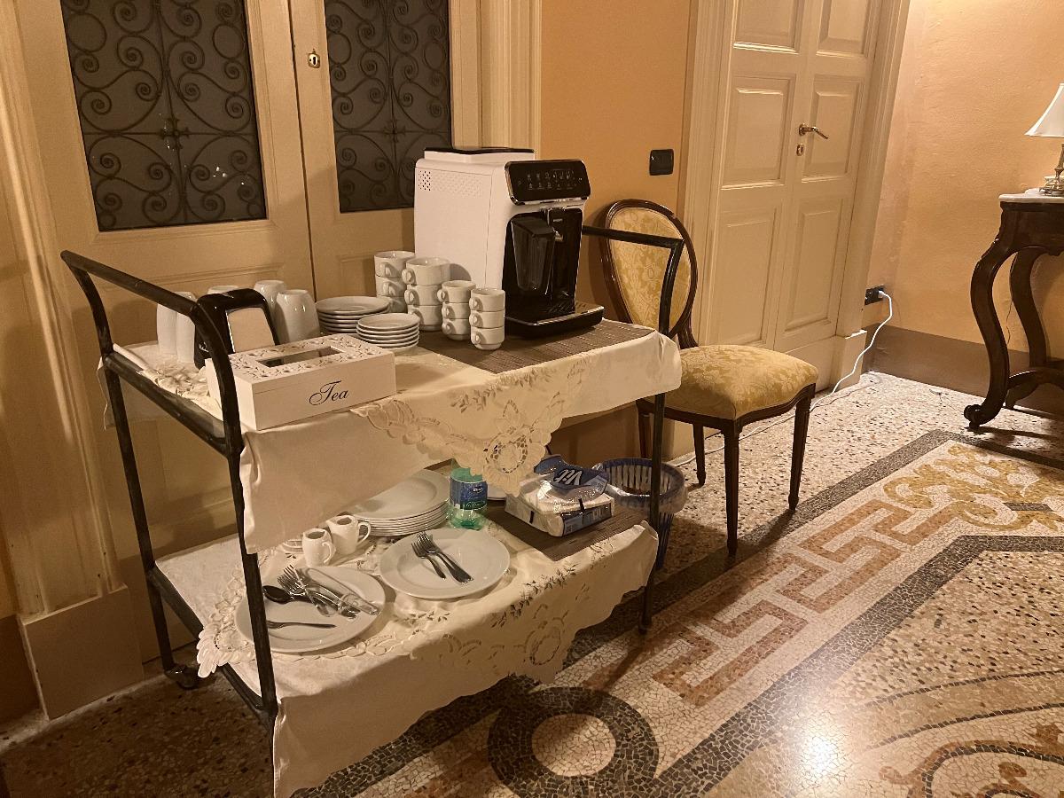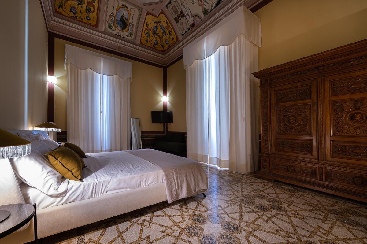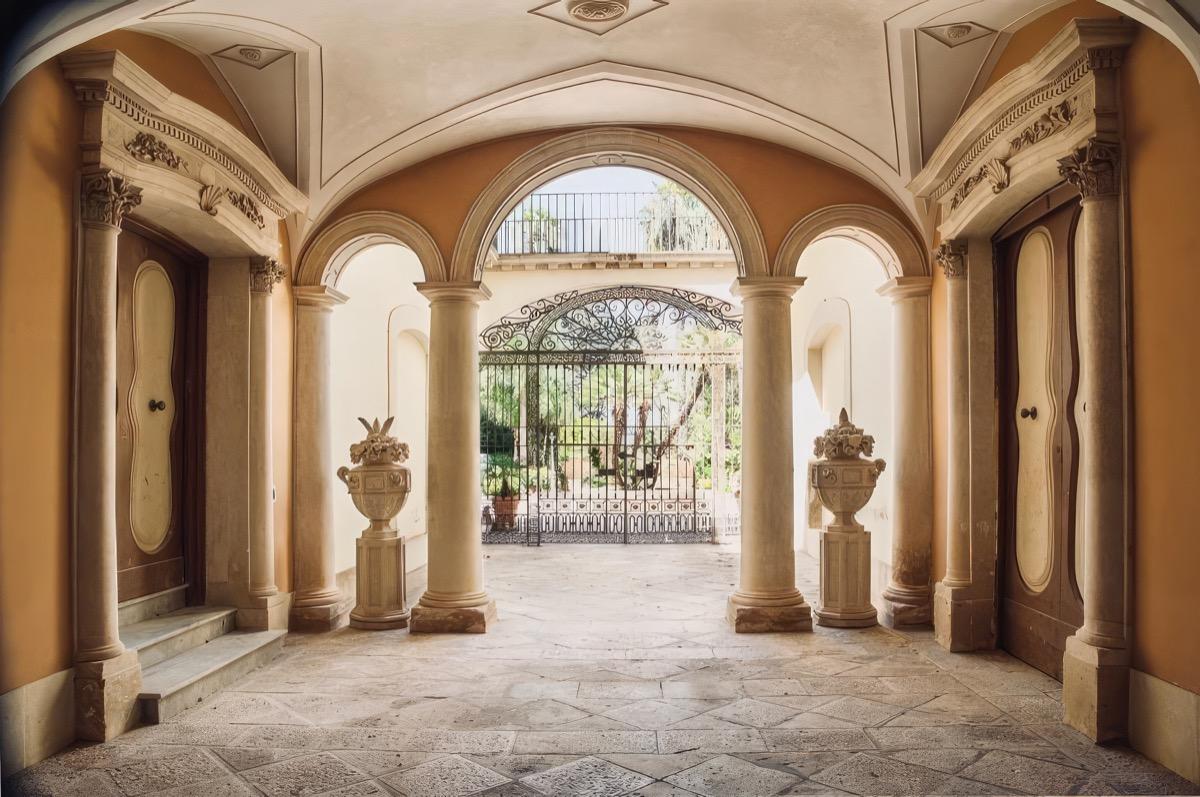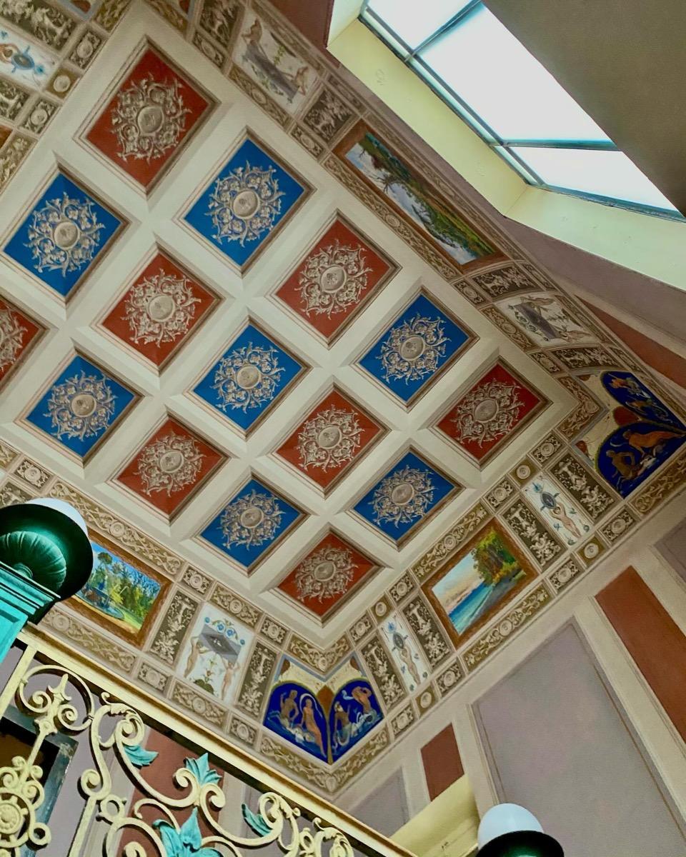 The ten rooms on the noble floor are furnished with paintings and floors dating back to 1893, confirmed by the date on the decorated vaults by Agesilao Flora and his assistants. The mosaic floors displaying the family crest, the boiserie and faux marble plinths, the stucco frames on the salon walls, and the overdoors with decorative stucco figures complete the interior decorations, giving the space a pronounced Liberty style.