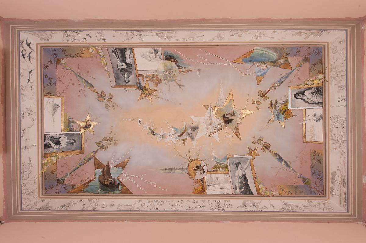 The mosaic floors with the family crest, the boiserie and faux marble baseboards, the stucco frames on the salon walls, and the overdoors with stucco clipei decorated with figures complete the interior decorations, giving a distinct Liberty style to the space.