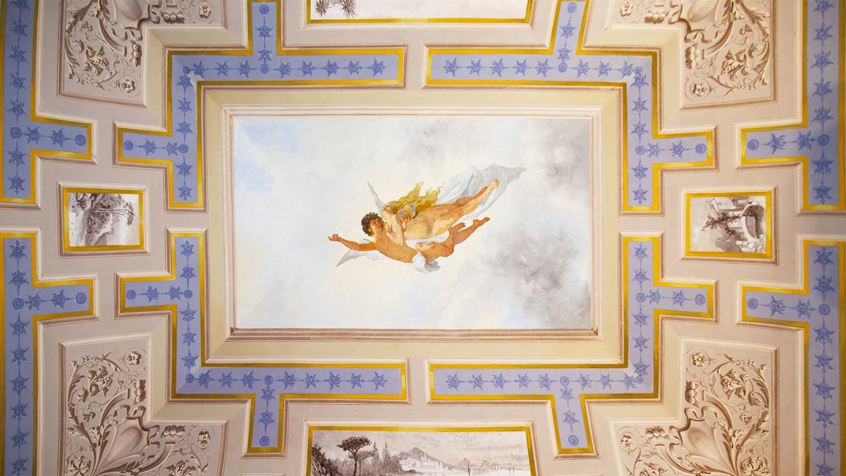 The Salon, overlooking the garden, is decorated with a mythological subject depicting Galatea and Aci in the center of the vault, and along the perimeter, there are panels depicting famous love stories such as Romeo and Juliet on the balcony. The walls are adorned with stucco panels framed by delicate cornices surmounted by medallions.