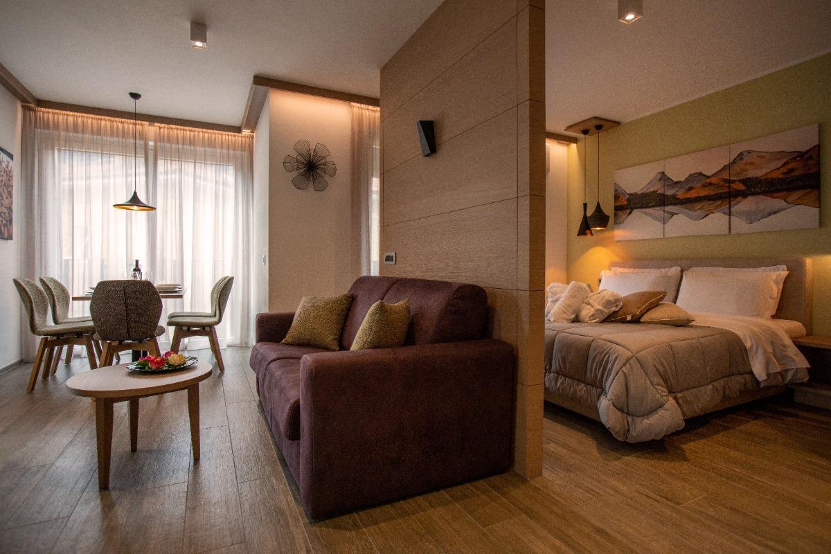 Beautiful, spacious, and bright apartment for 2/4 people. Bedroom with double bed, equipped living area with a sofa bed for 2 people, large wardrobe, and dining area with panoramic mountain views.
