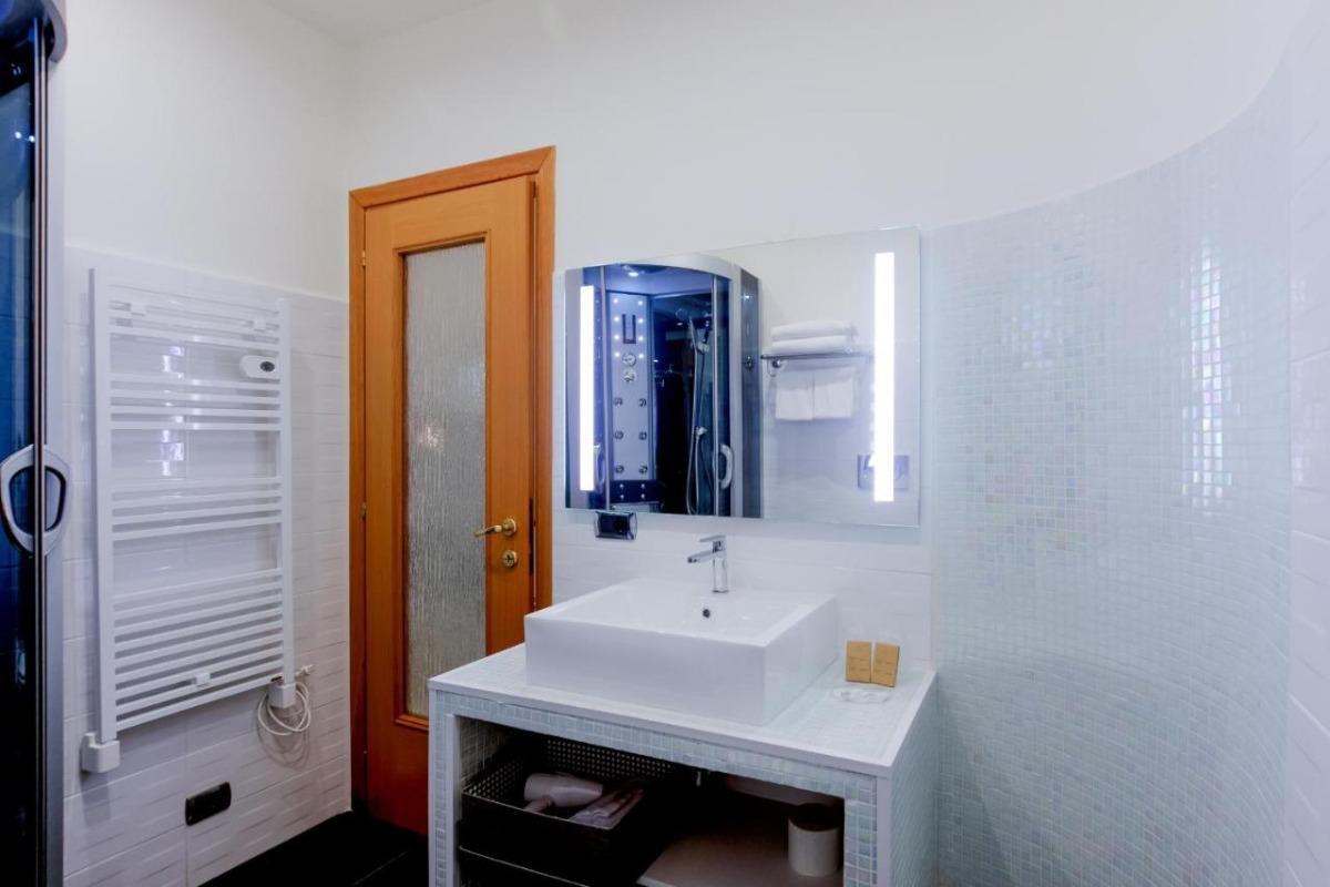 The private bathroom is equipped with LED backlit mirrors and a hydromassage shower, as well as a hairdryer.