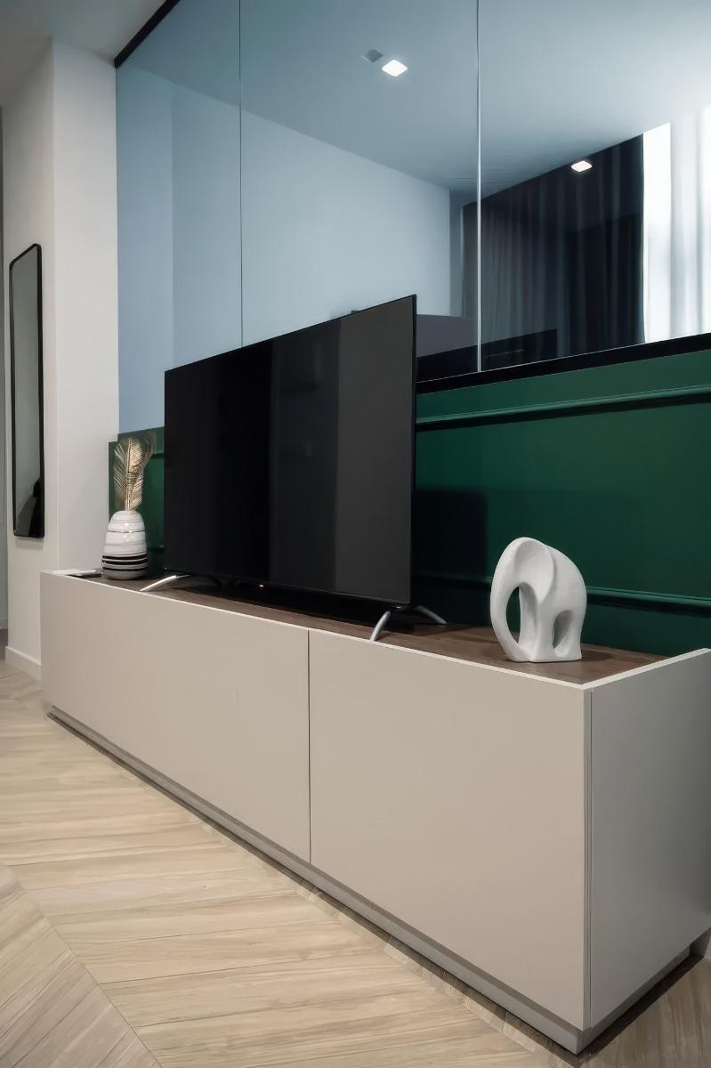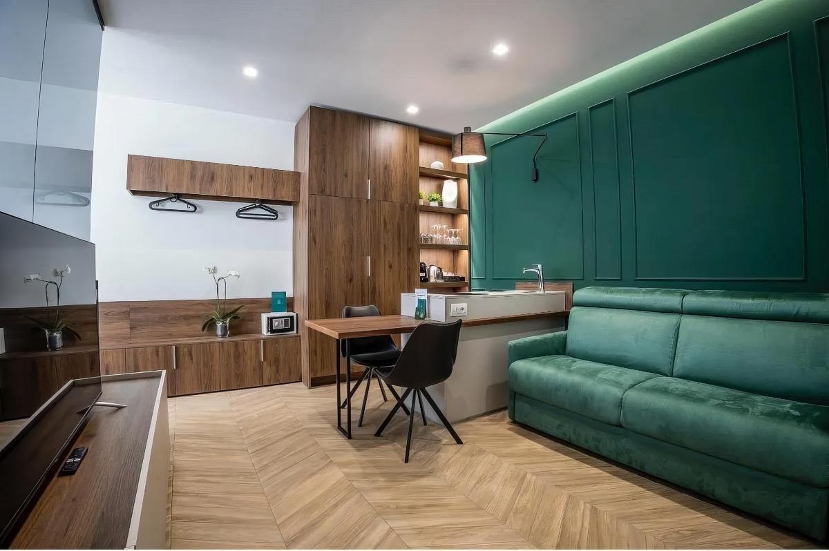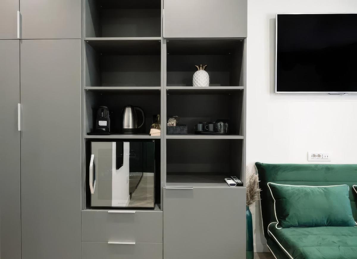 La Suite 02, diseñada como un mini apartamento de lujo de 42 m², puede alojar hasta cuatro personas gracias a su cómodo sofá cama con colchón de espuma viscoelástica. La zona de estar cuenta con un televisor de 55” con canales de pago y por cable, mientras que la cocina equipada con fogones, nevera, microondas y utensilios de cocina ofrece una solución práctica y acogedora. Aquí, los huéspedes también podrán disfrutar de Wi-Fi, aire acondicionado y una serie de comodidades que hacen que la estancia sea relajante e inolvidable.