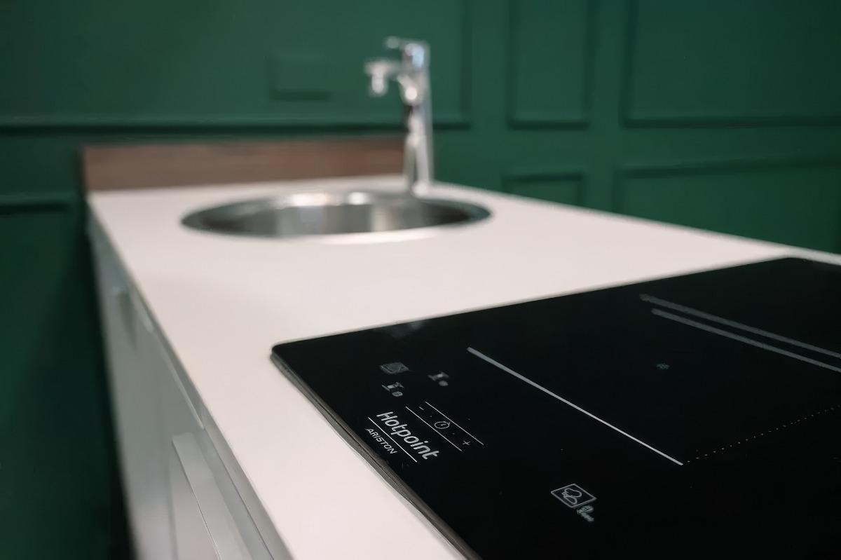 La vitrocerámica, la mesa del comedor y todos los utensilios de cocina, así como la nevera y el microondas, hacen que este mini apartamento de lujo sea acogedor y confortable, único en su tipo.