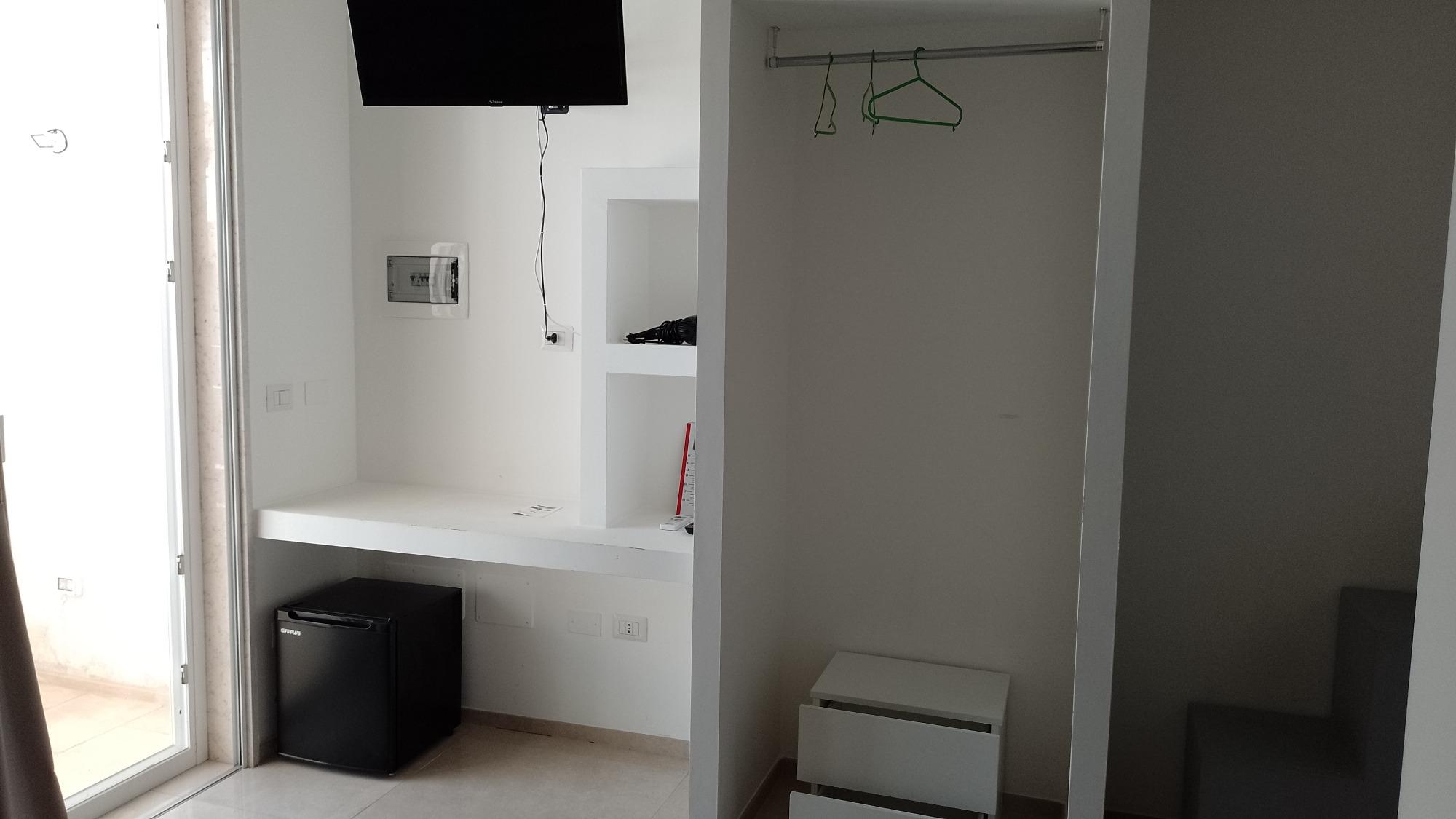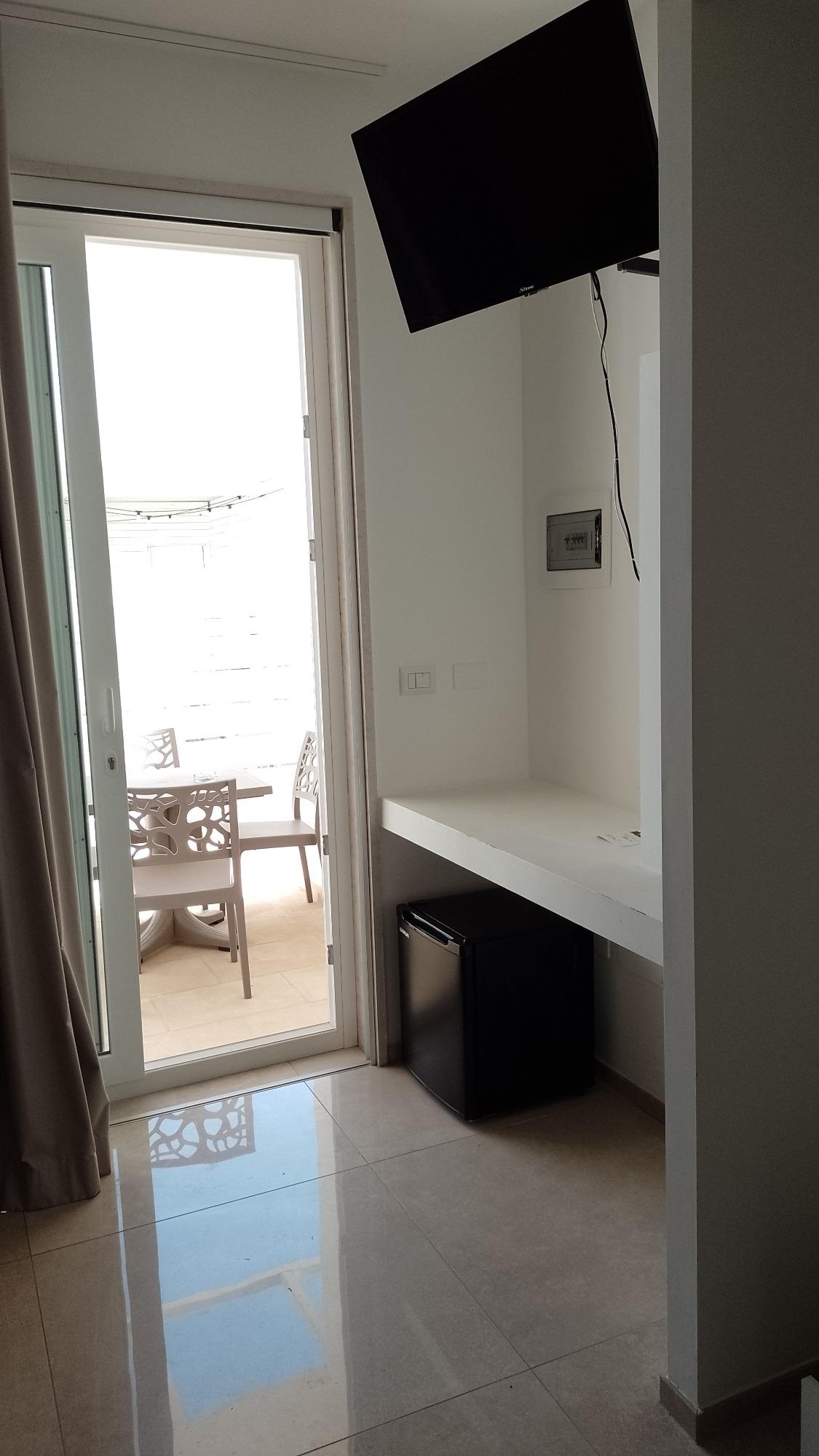 The room is well-appointed and functional, featuring a double bed and a single bed, making it perfect for couples or small families. It includes a private bathroom complete with a bidet and hairdryer, a flat-screen TV, Wi-Fi, a minibar, air conditioning, and heating to ensure comfort in every season. Bed linens and towels are provided. A pleasant added feature is the private garden allocated to the room, which ensures privacy and outdoor relaxation; access to the room is directly from this outdoor space, offering autonomy and seclusion.