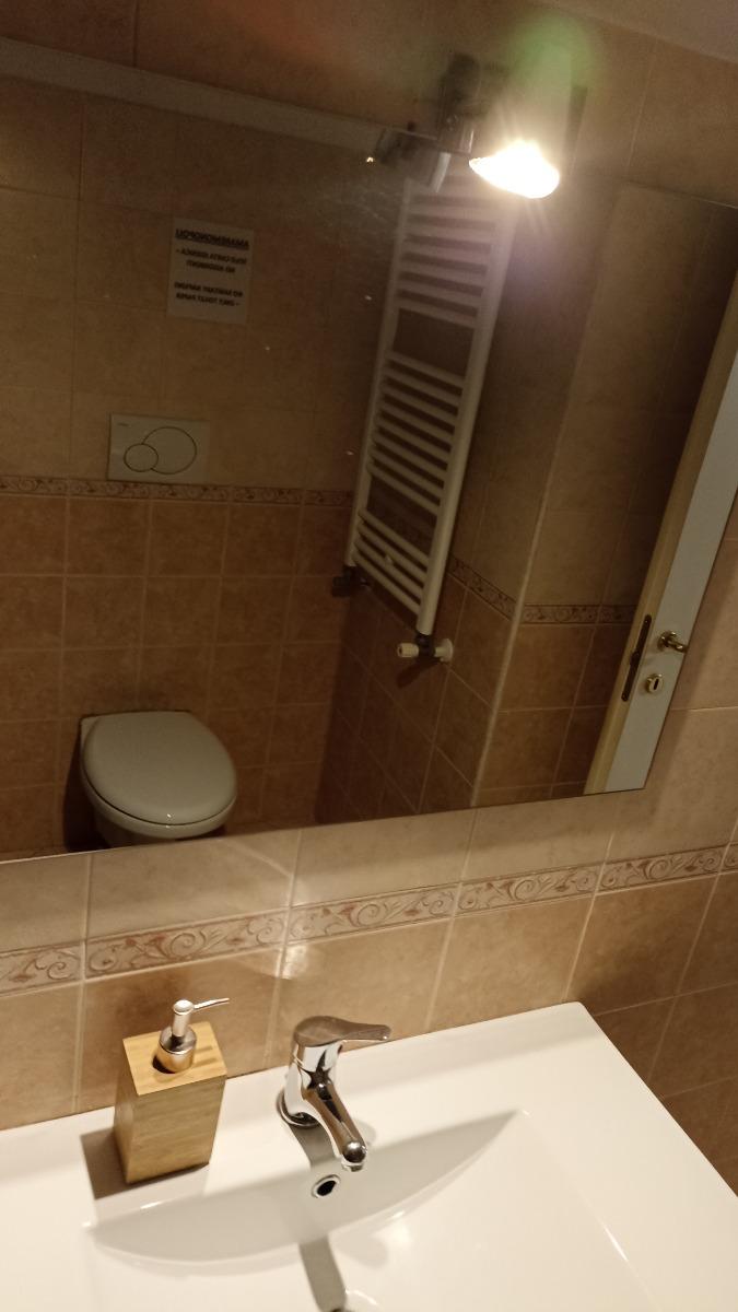 Bagno comodo, con termosifone, lavabo, e box doccia.
