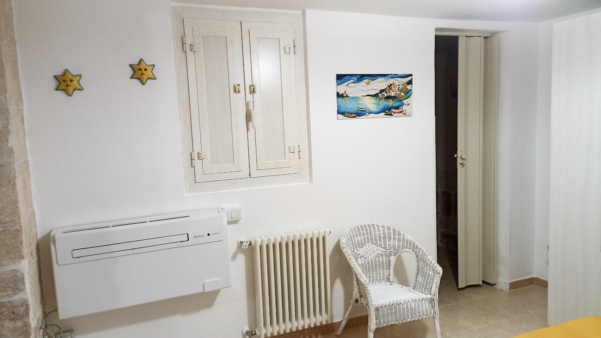 Camera da letto matrimoniale con finestra e termoconvettore di aria fredda in camera.