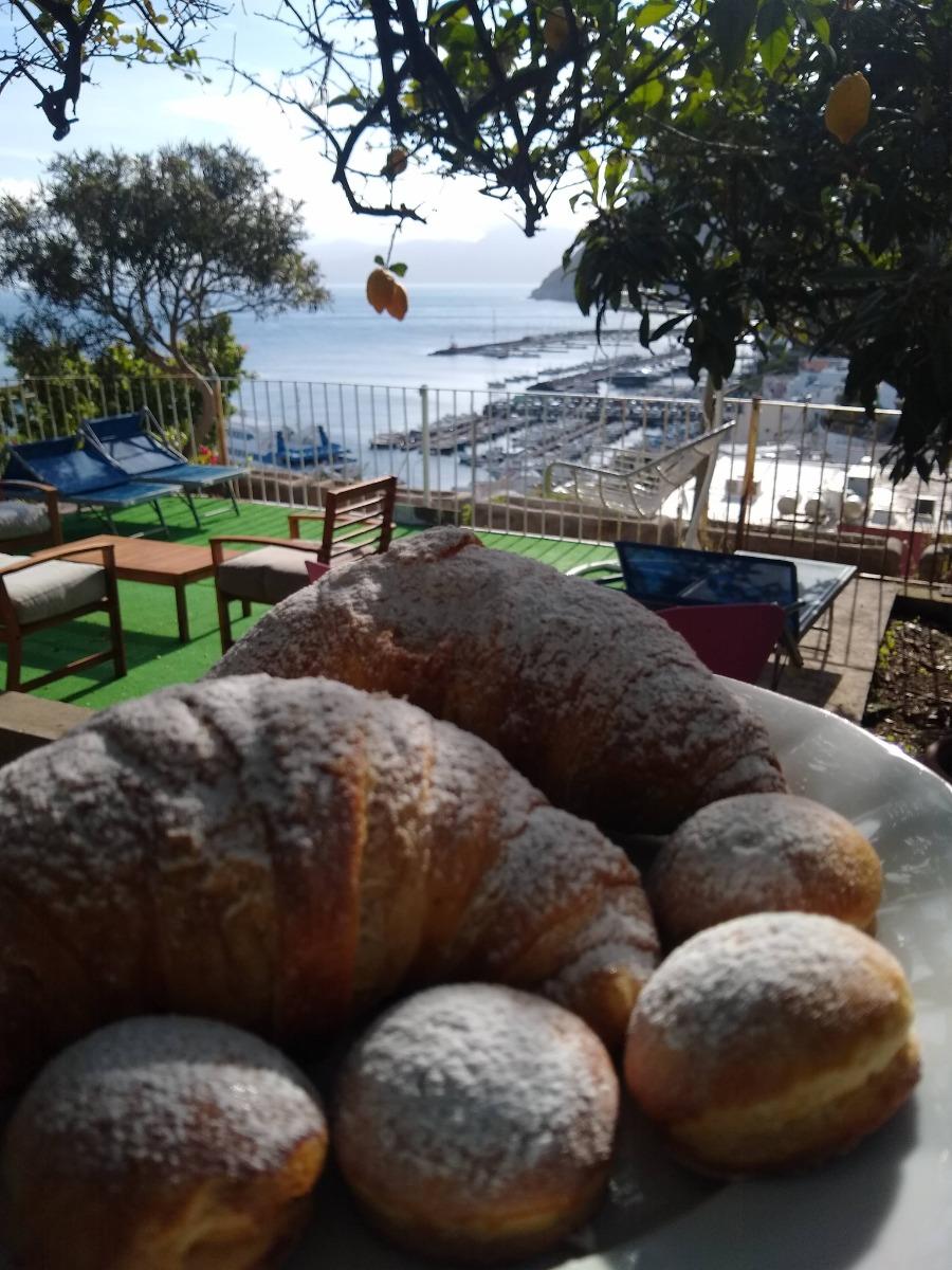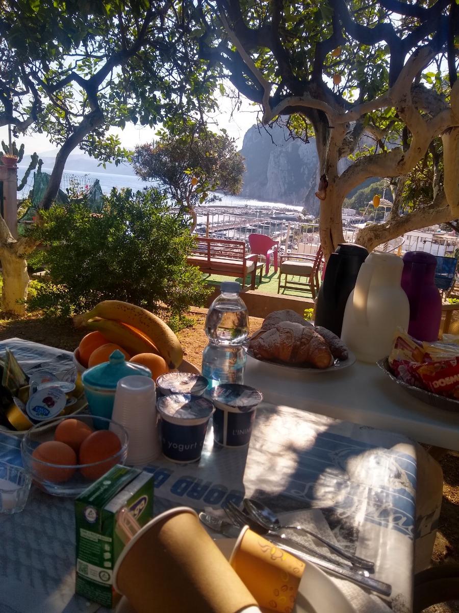 La nostra colazione viene servita nel panoramico giardino, tra fiori e limoni. Troverete latte, caffè, tè, succhi di frutta, cereali, fette biscottate, croissant, marmellate di vari gusti, miele, frutta del giardino e uova, ma vi prepareremo anche biscotti e dolci tipici, a cui affiancheremo talvolta anche gli ortaggi del nostro orto, il tutto rigorosamente nel rispetto delle norme anti Covid 19, con l'utilizzo di stoviglie monouso e nel corretto distanziamento tra gli ospiti.