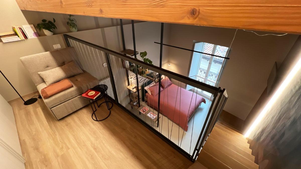 Our guests can stay in a charming studio with a loft and a bathroom with a window, equipped with a spacious shower. In the main space, they will find a comfortable French double bed measuring 140x200 cm and a kitchenette. The loft, a dedicated relaxation area, has a armchair that can be used as an additional bed for a third guest. The wooden beams of the loft create height variations ranging from 1.55 to 1.75 meters.