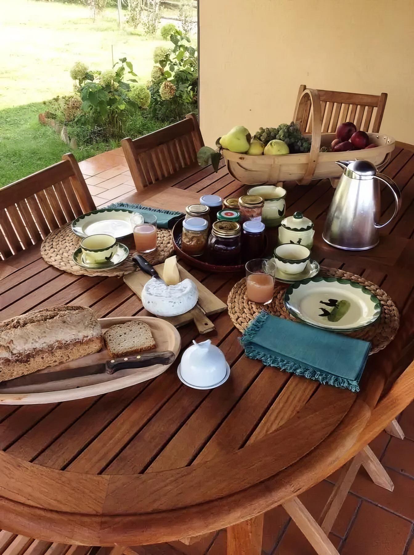 La colazione viene servita sulla terrazza o nel giardino, ma in caso di maltempo si svolge nella sala da pranzo. Offriamo solo prodotti artigianali, come pane fresco e marmellate fatte in casa. La frutta e i succhi provengono dai nostri alberi e cespugli.