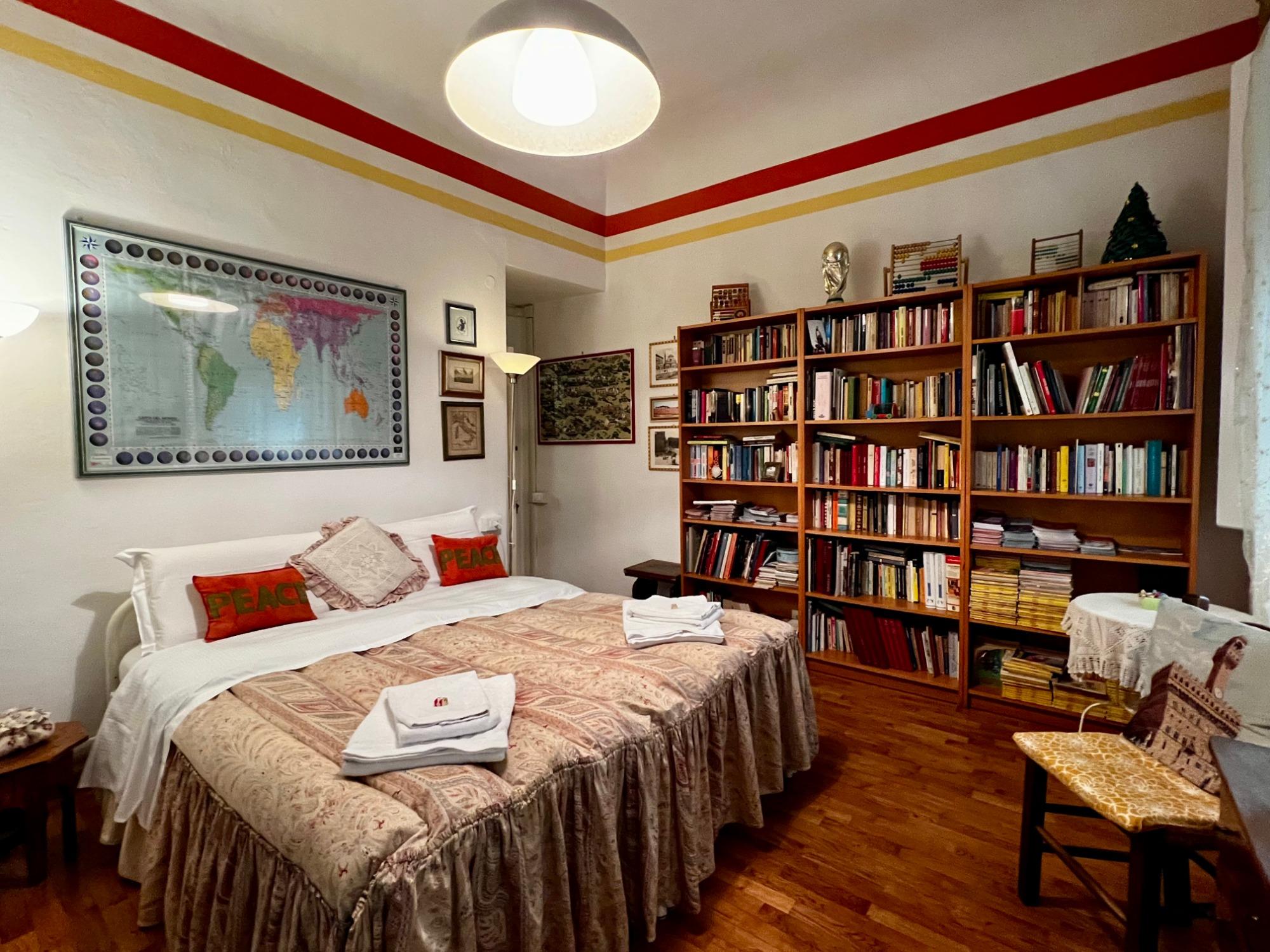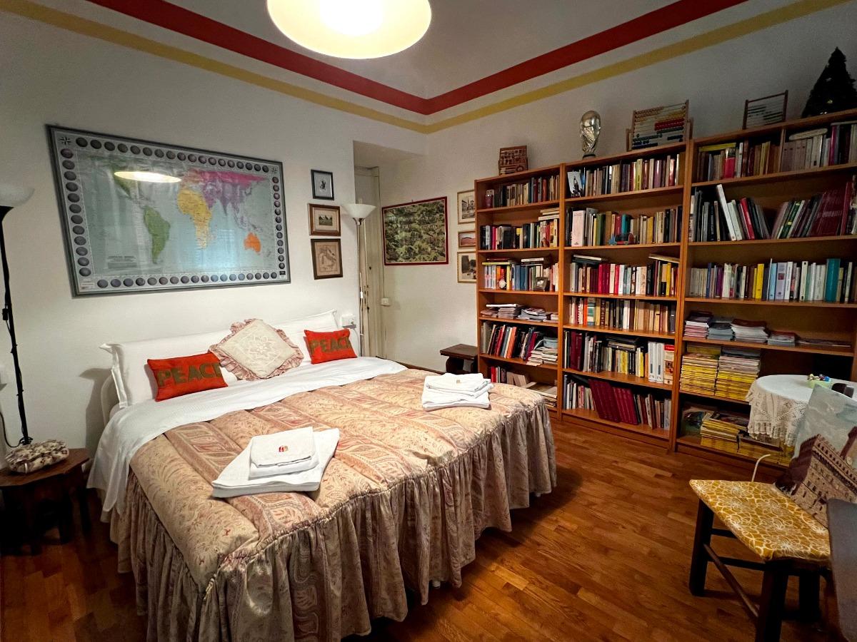 Ampia camera, letto matrimoniale o possibilità di 2 letti singoli, affaccio sulla strada, aria condizionata, tv, armadio, tavolo ampio, libreria. Bagno privato interno. Primo piano senza ascensore. Soggiorno minimo 2 notti, salvo eccezioni.