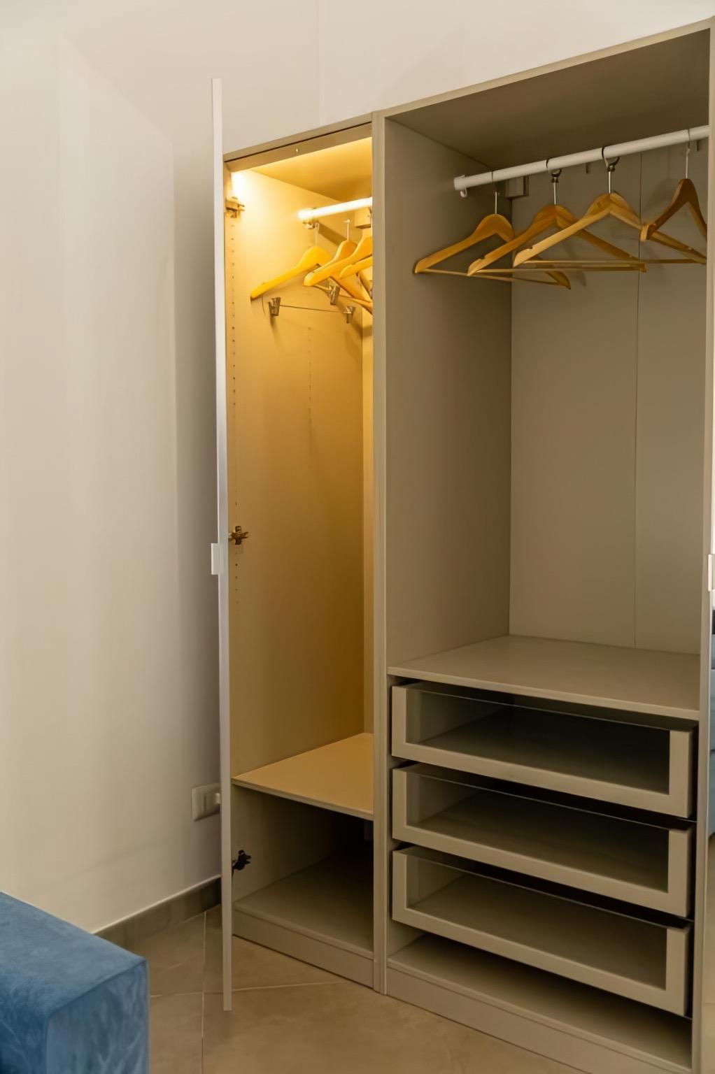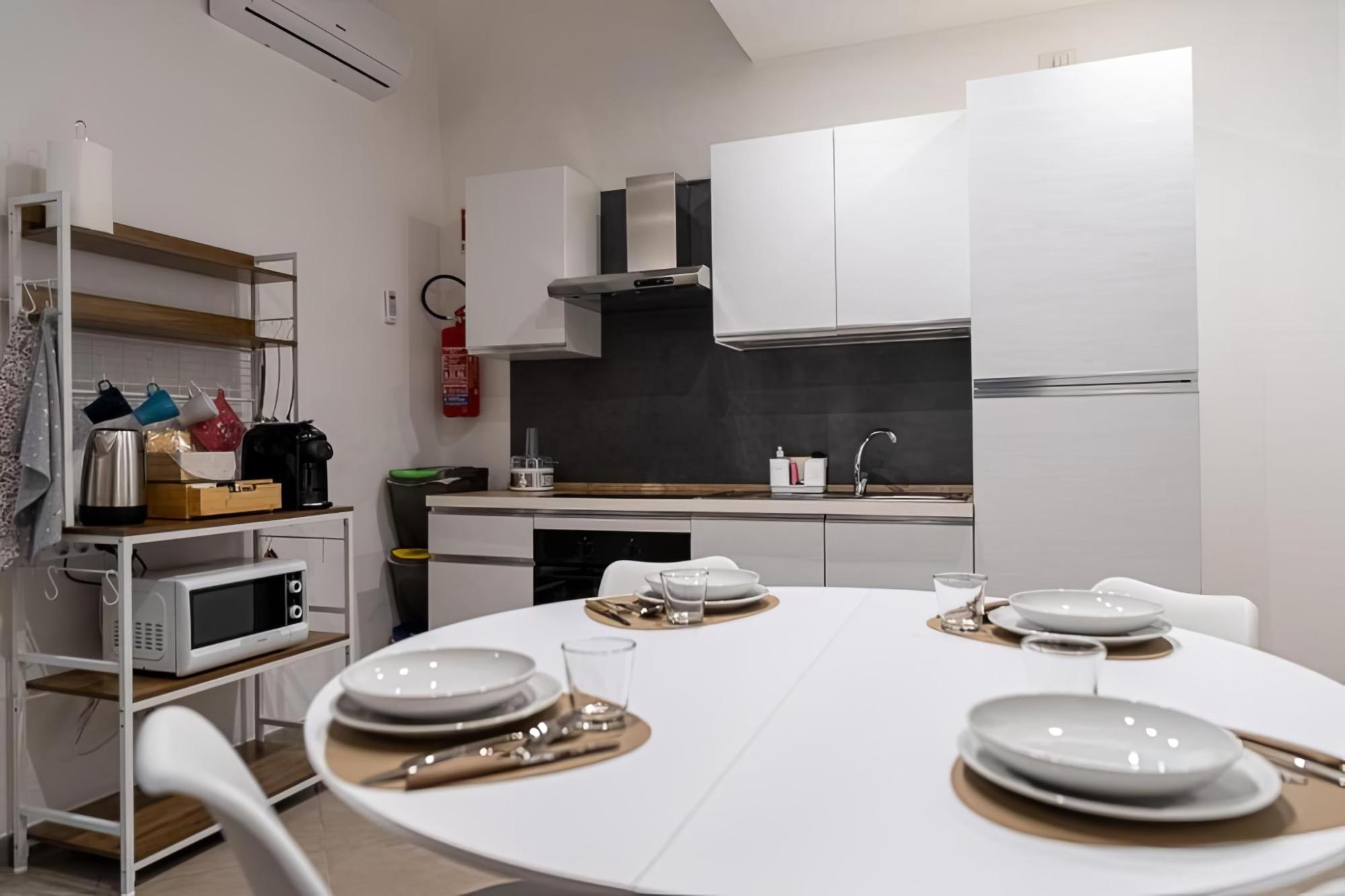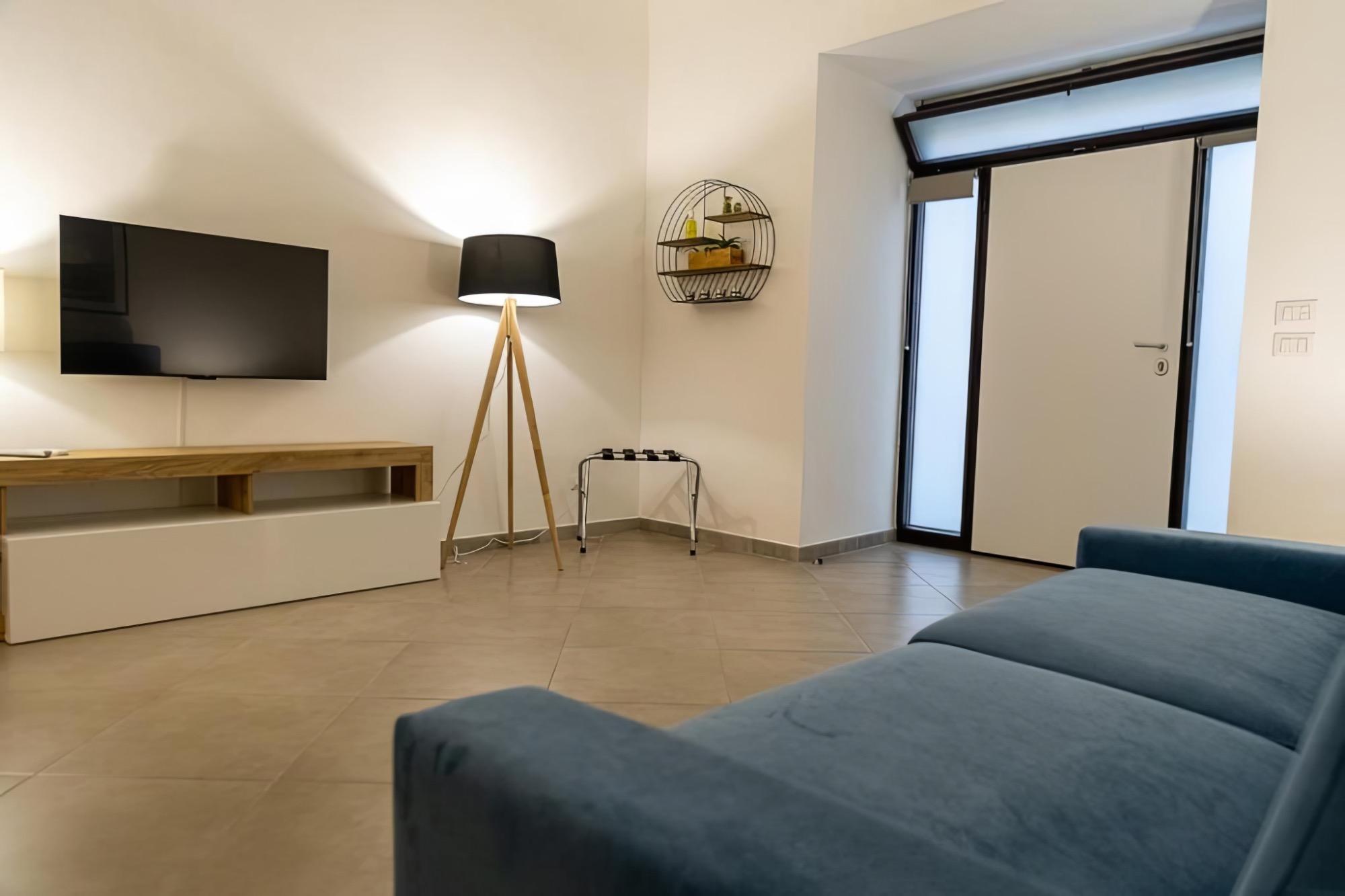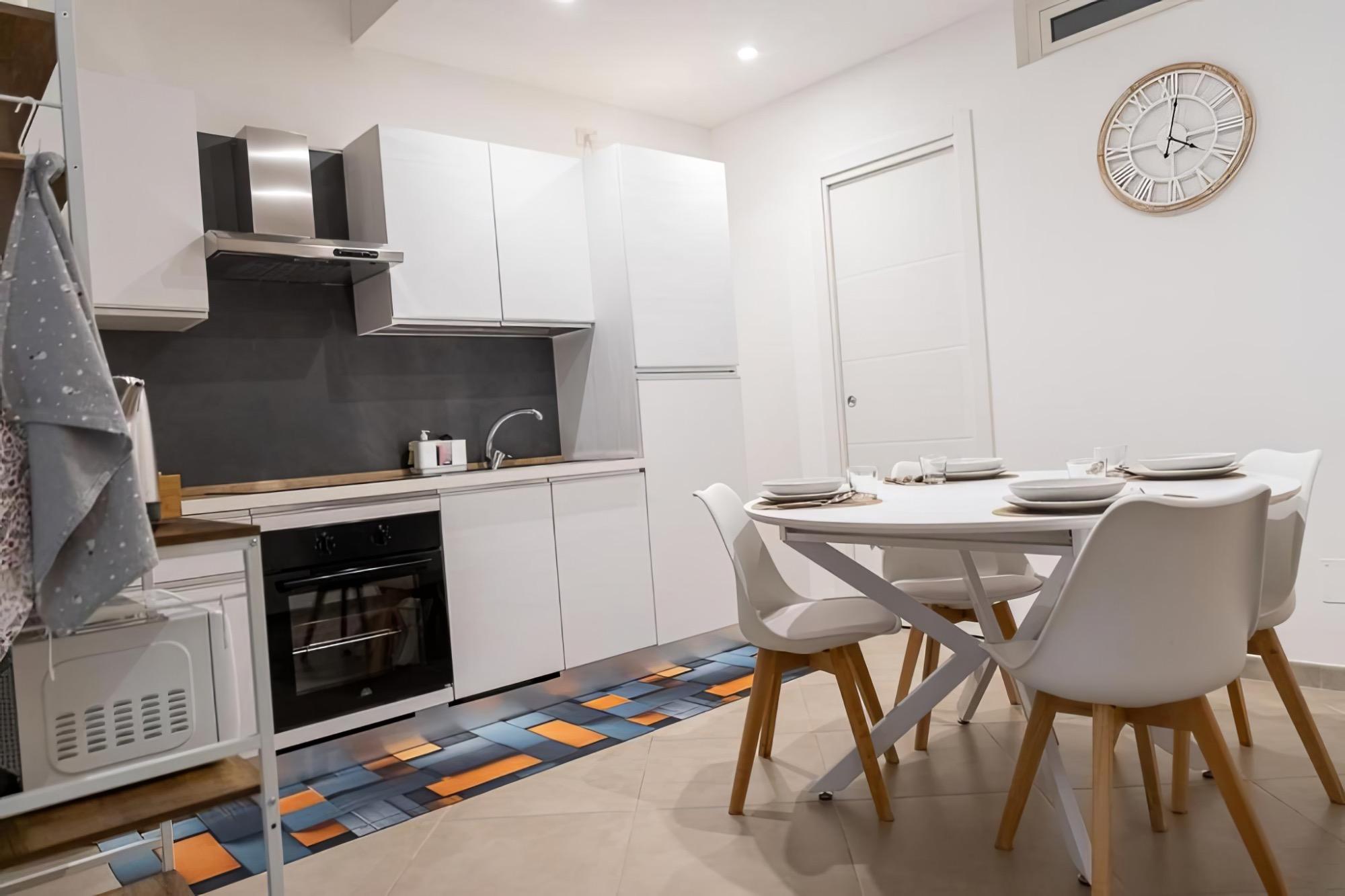 Trevisani 221 is a 55 square meter apartment located on the ground floor, designed to provide comfort and functionality in every aspect. The entrance opens into a cozy living room furnished with a sofa bed and a TV, leading to a modern and fully equipped kitchen with an induction cooktop, dishwasher, refrigerator, microwave, coffee machine, and kettle.