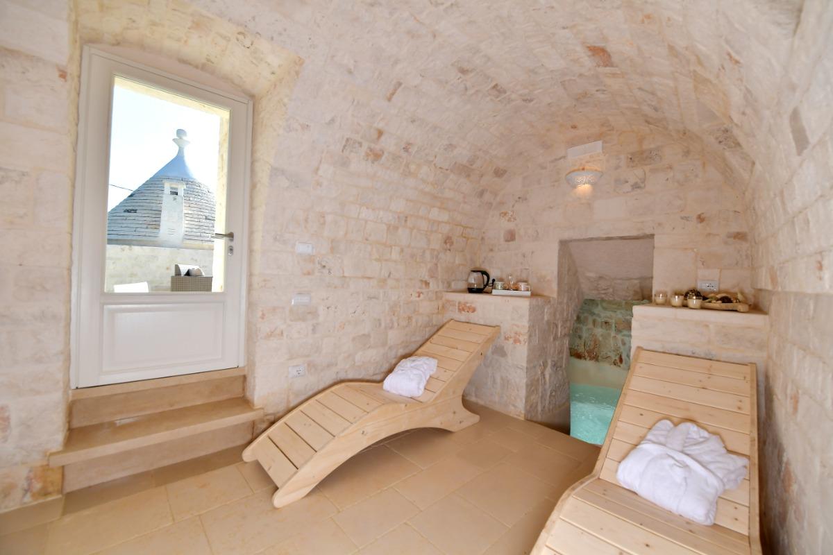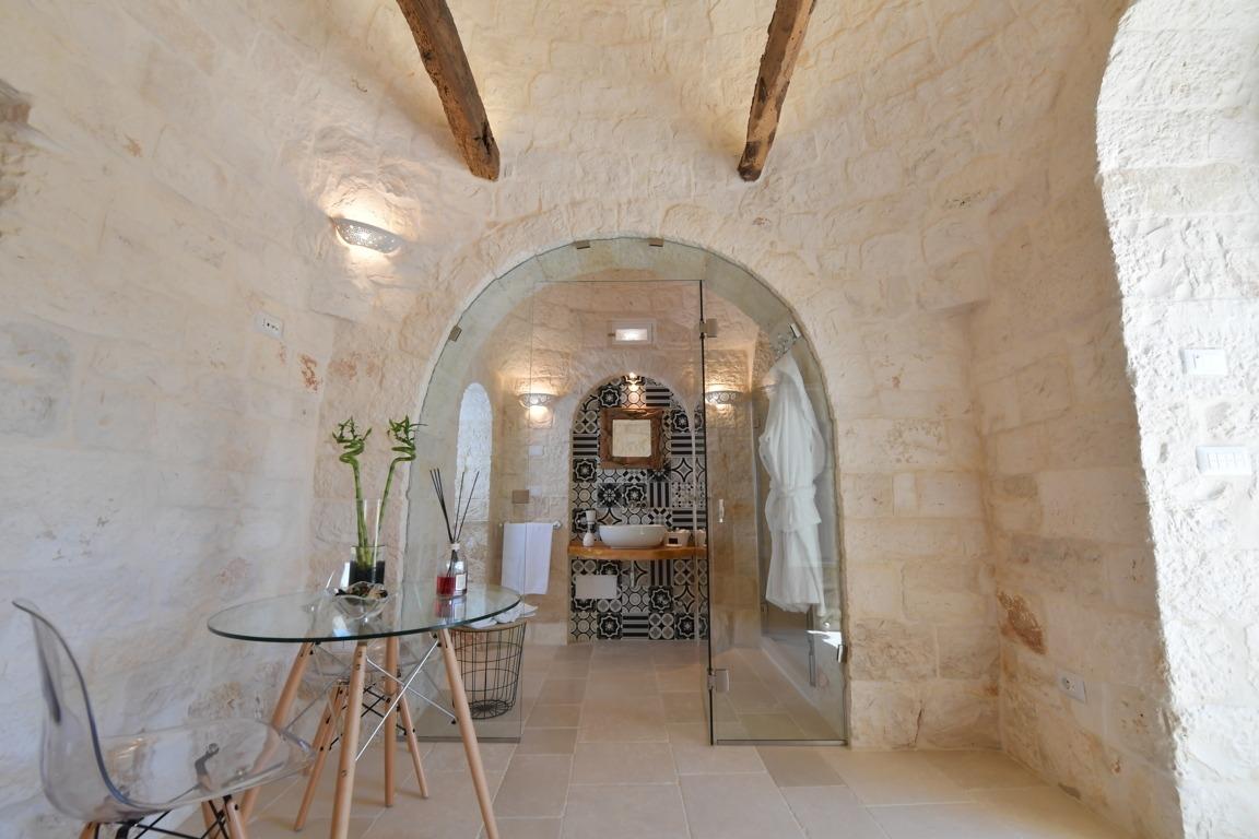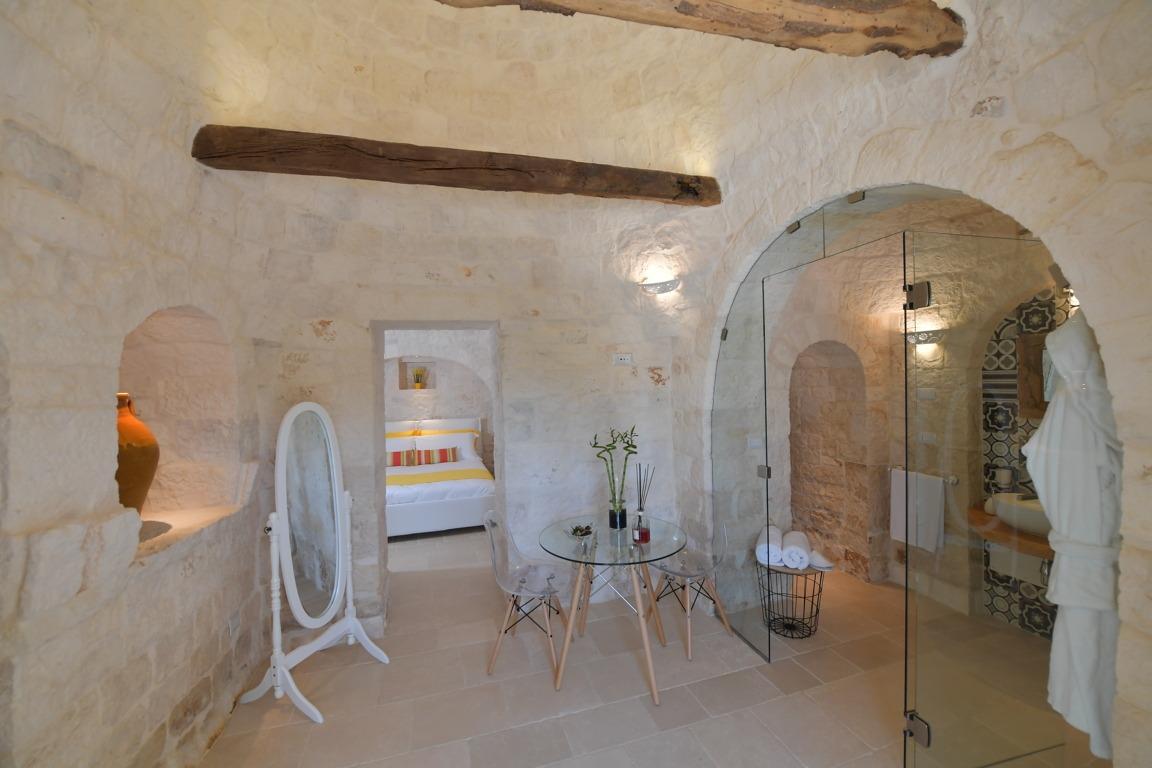 Immersa nella bellezza del verde degli ulivi secolari e delle piante mediterranee, questa dimora è stata recuperata attraverso un meticoloso lavoro di restauro. La struttura originale, composta da 12 coni e 2 lamie a botte, è stata preservata per offrire un'esperienza autentica dell'architettura rurale.