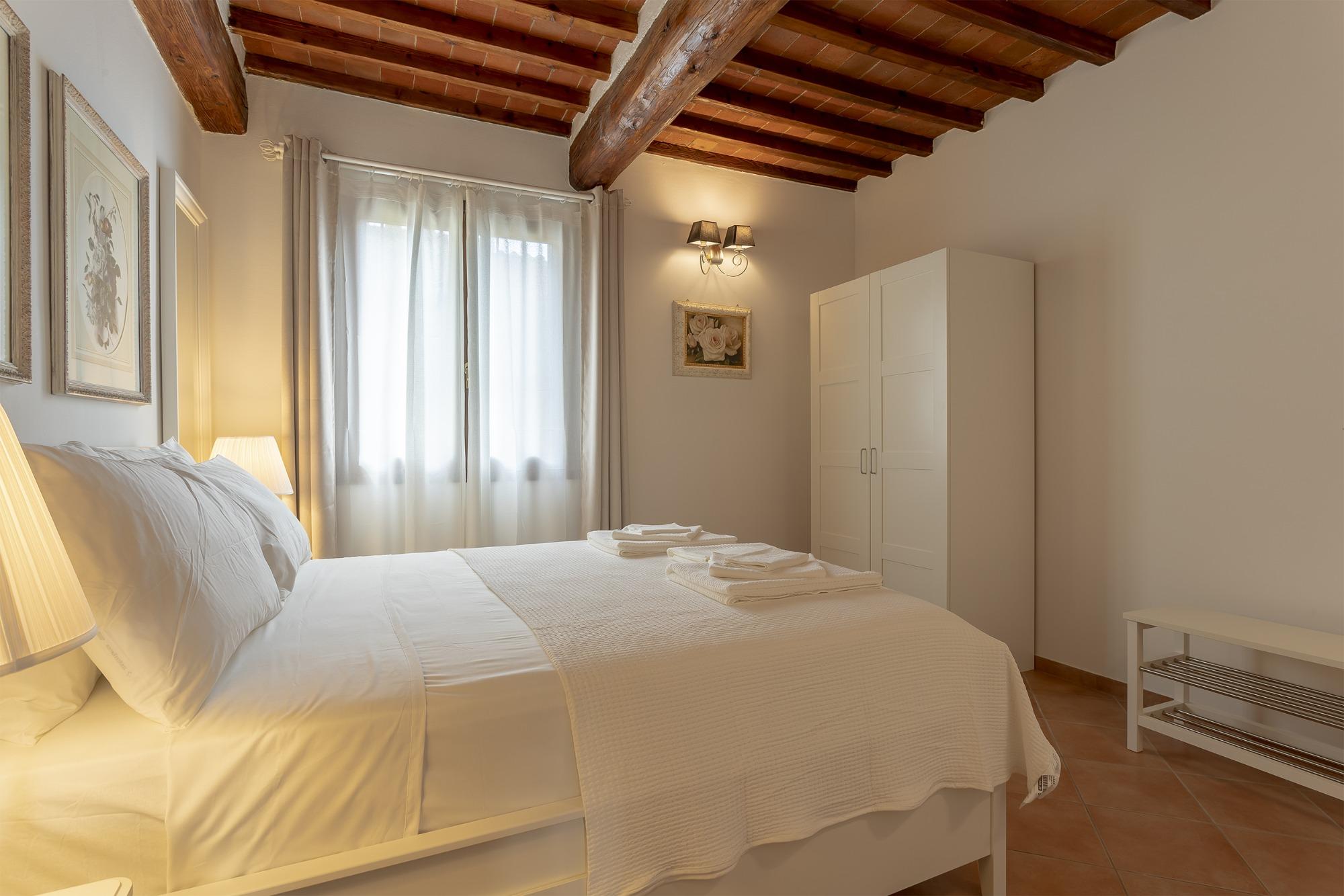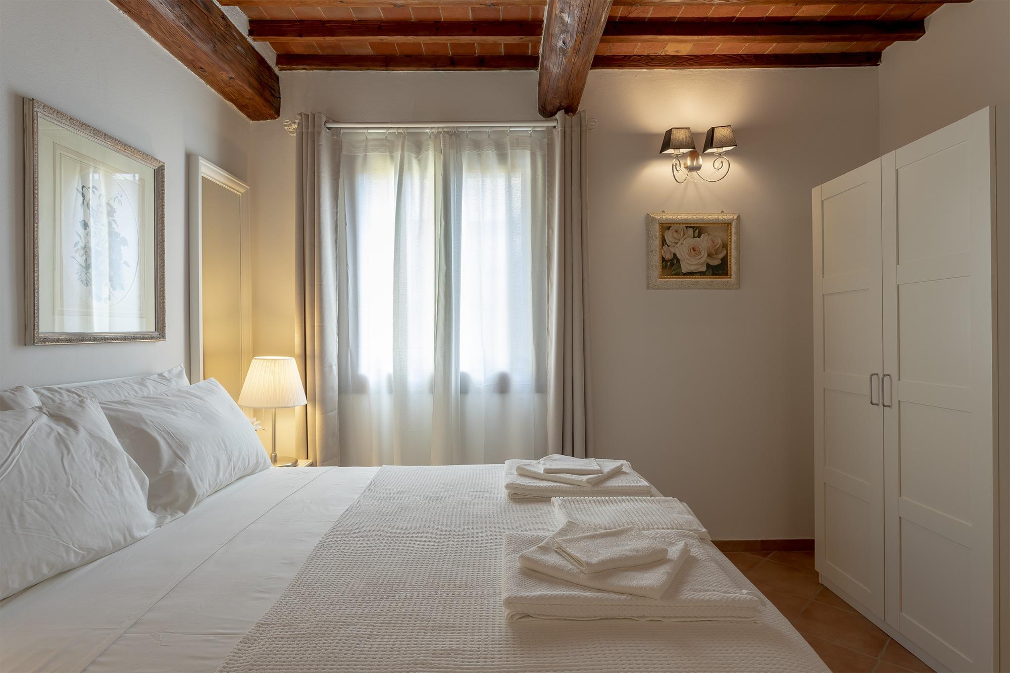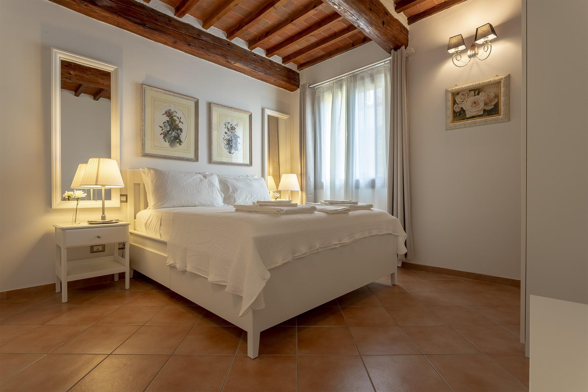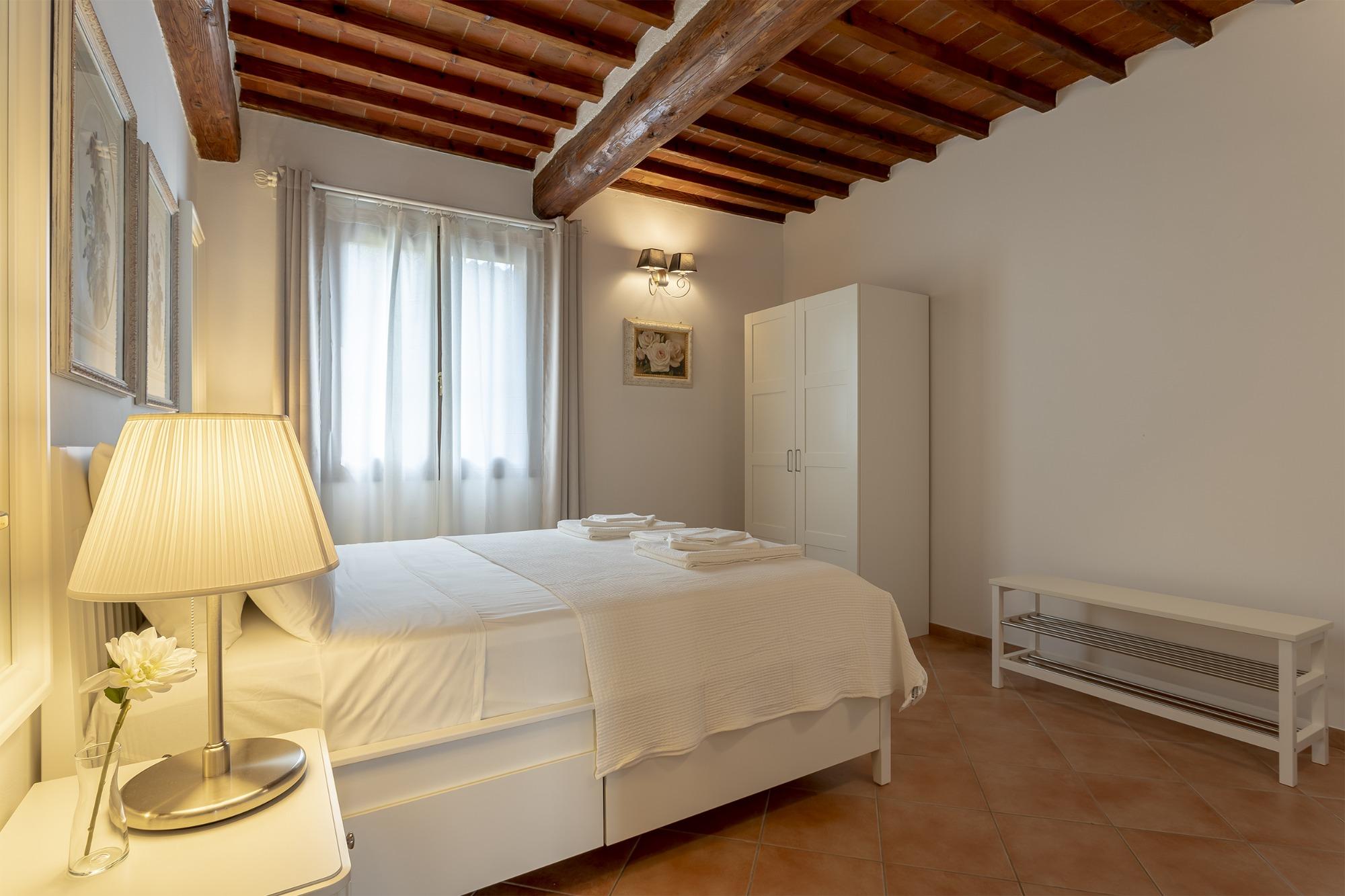 This rustic-style apartment is situated in a quiet and peaceful area, perfect for those seeking relaxation without sacrificing the convenience of reaching Florence and the main destinations in Tuscany. It can accommodate up to six guests and features two double bedrooms and a living room with a sofa bed, boasting bright spaces decorated in typical Tuscan style, highlighted by exposed beams and a warm, inviting atmosphere.