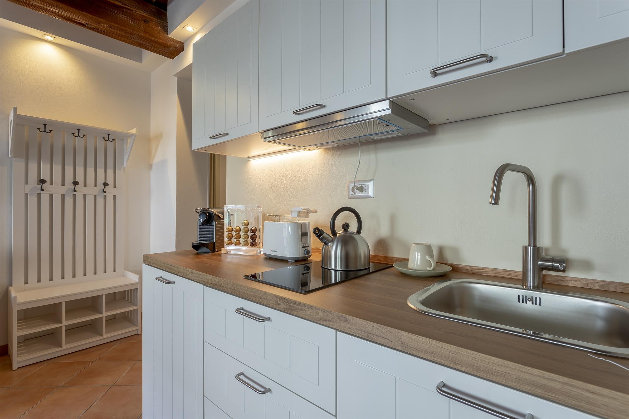The kitchen is fully equipped and provides everything needed for self-catering, including a refrigerator with water available, a freezer, a microwave, a Nespresso coffee machine with complimentary capsules, assorted tea bags, pots, dishes, and utensils. Modern comforts are also available, such as high-speed fiber optic Wi-Fi, suitable for business travelers. Guests also have access to a laundry area with a washing machine, iron, and ironing board, in addition to a complete set of linens and shower products. The rooms are air-conditioned and feature heating.