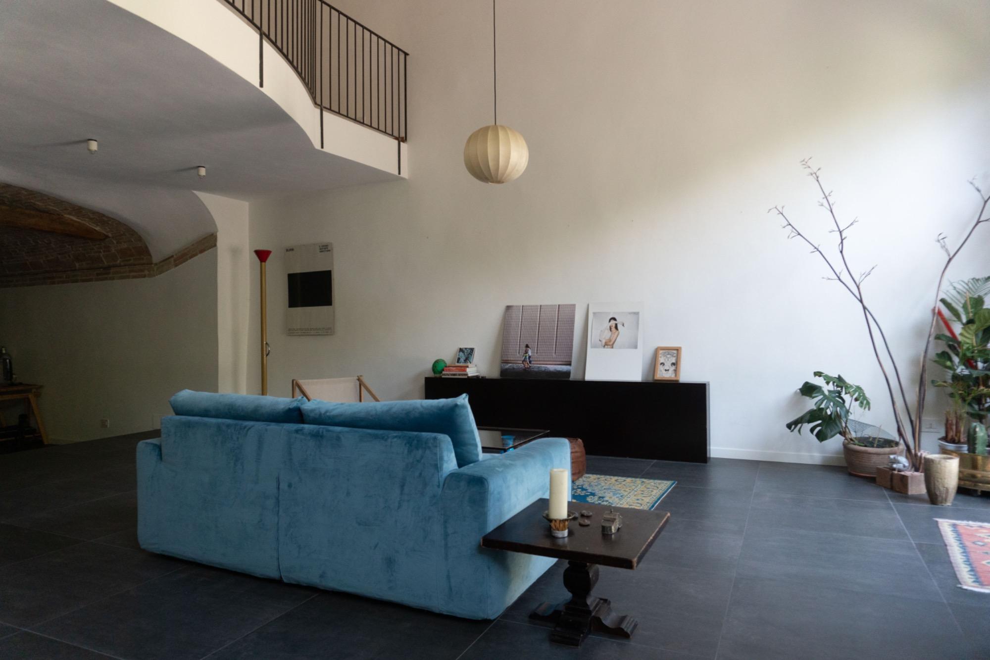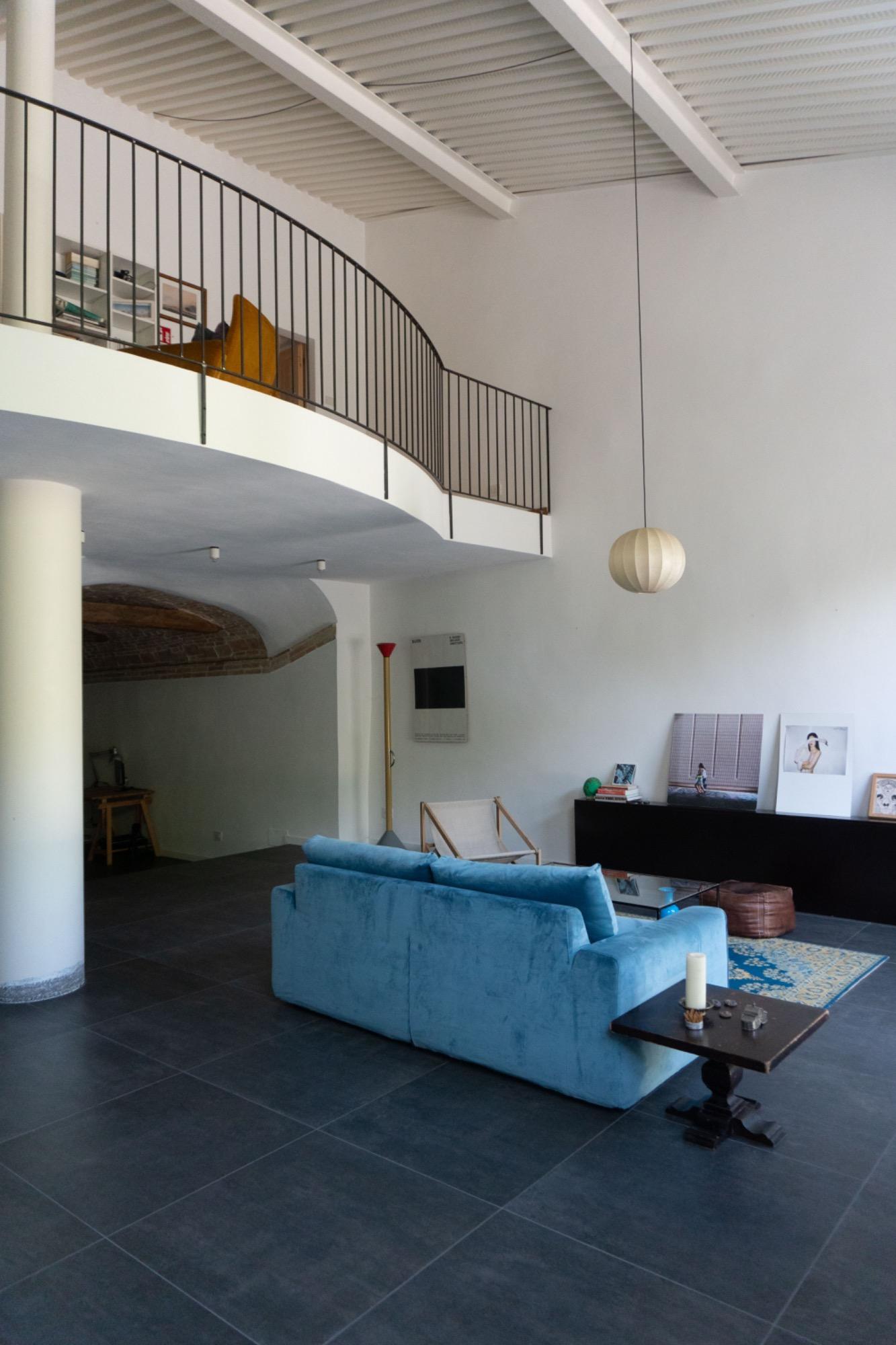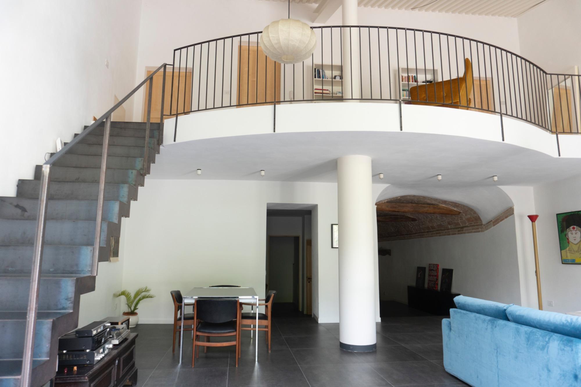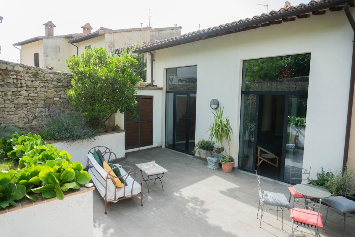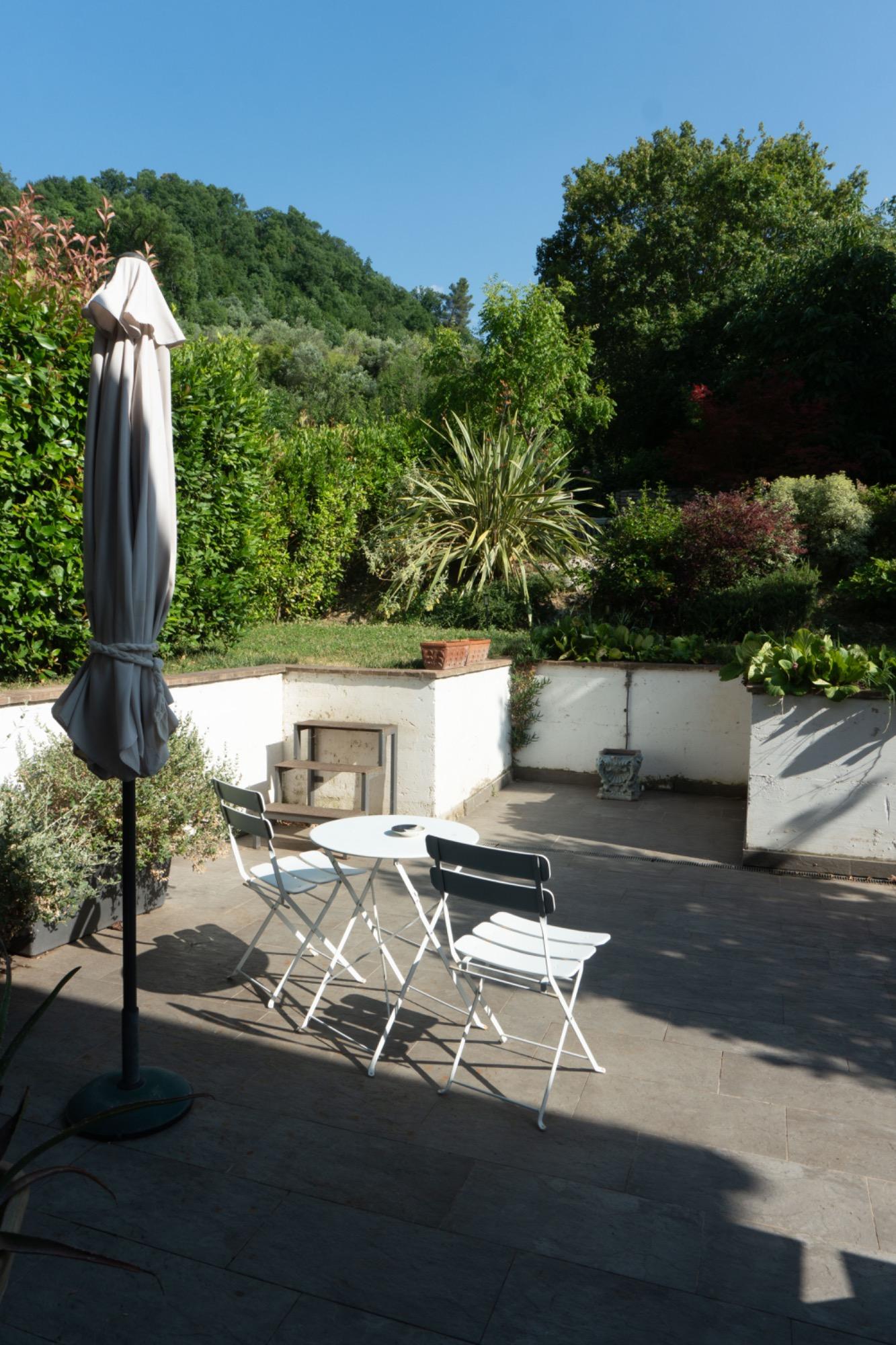 In a small village in Umbria, just a few kilometers from Foligno, there is a residence surrounded by greenery, converted from an old barn adjacent to a 17th-century building. The former entrance, which used to be a narrow path leading to the top of San Giuseppe hill, is now an integral part of the terraced garden, visible directly from the living room. This well-maintained, natural outdoor space is home to butterflies and birds, providing a calming view that enhances moments of tranquility.