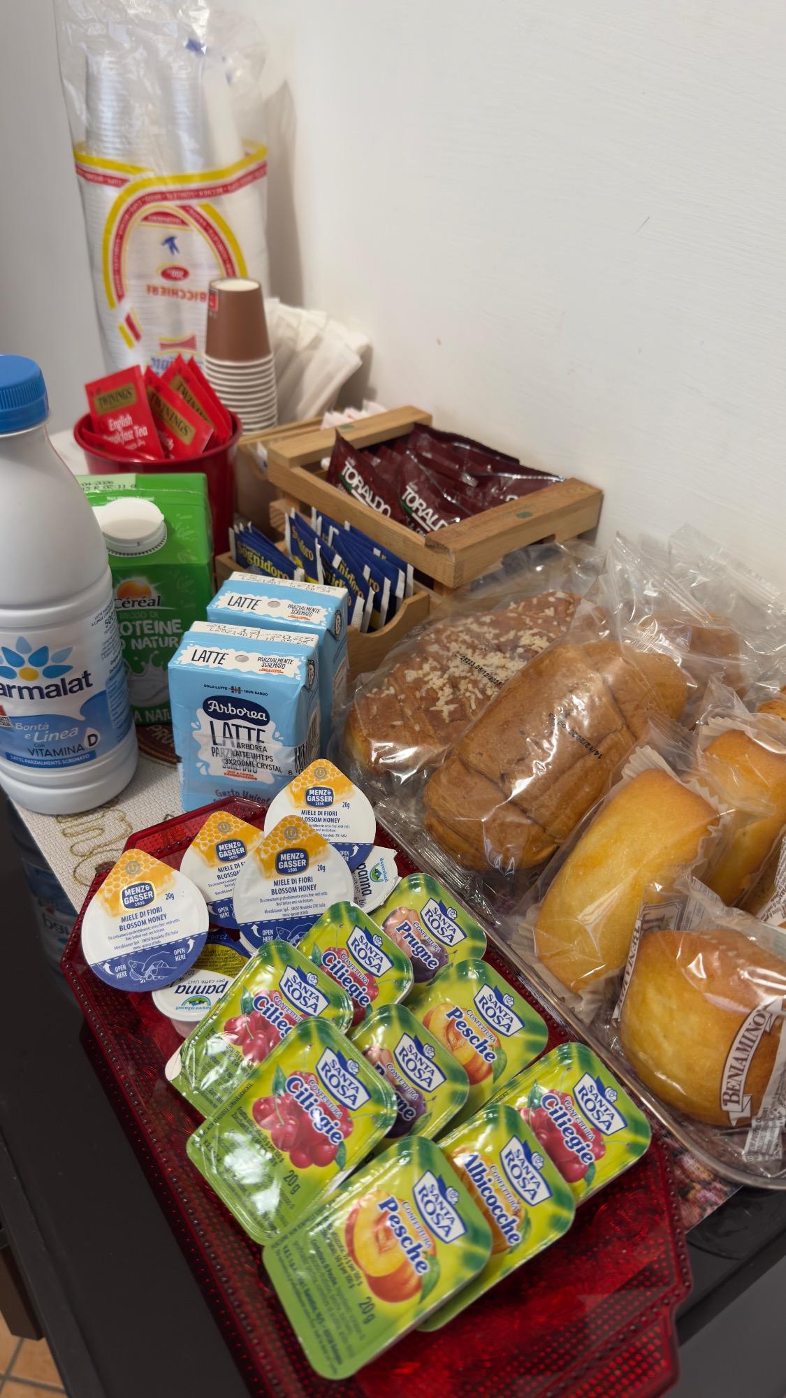 The breakfast, included with the stay, is designed to provide a pleasant and relaxed awakening. Guests will find a selection of pastries, toast, jams, honey, chocolate, fresh milk in the refrigerator, as well as tea and coffee that can be made using a pod machine. Everything is arranged conveniently, allowing guests to enjoy breakfast at their own pace and with complete independence before heading out to explore the Royal Palace and the attractions of Caserta.